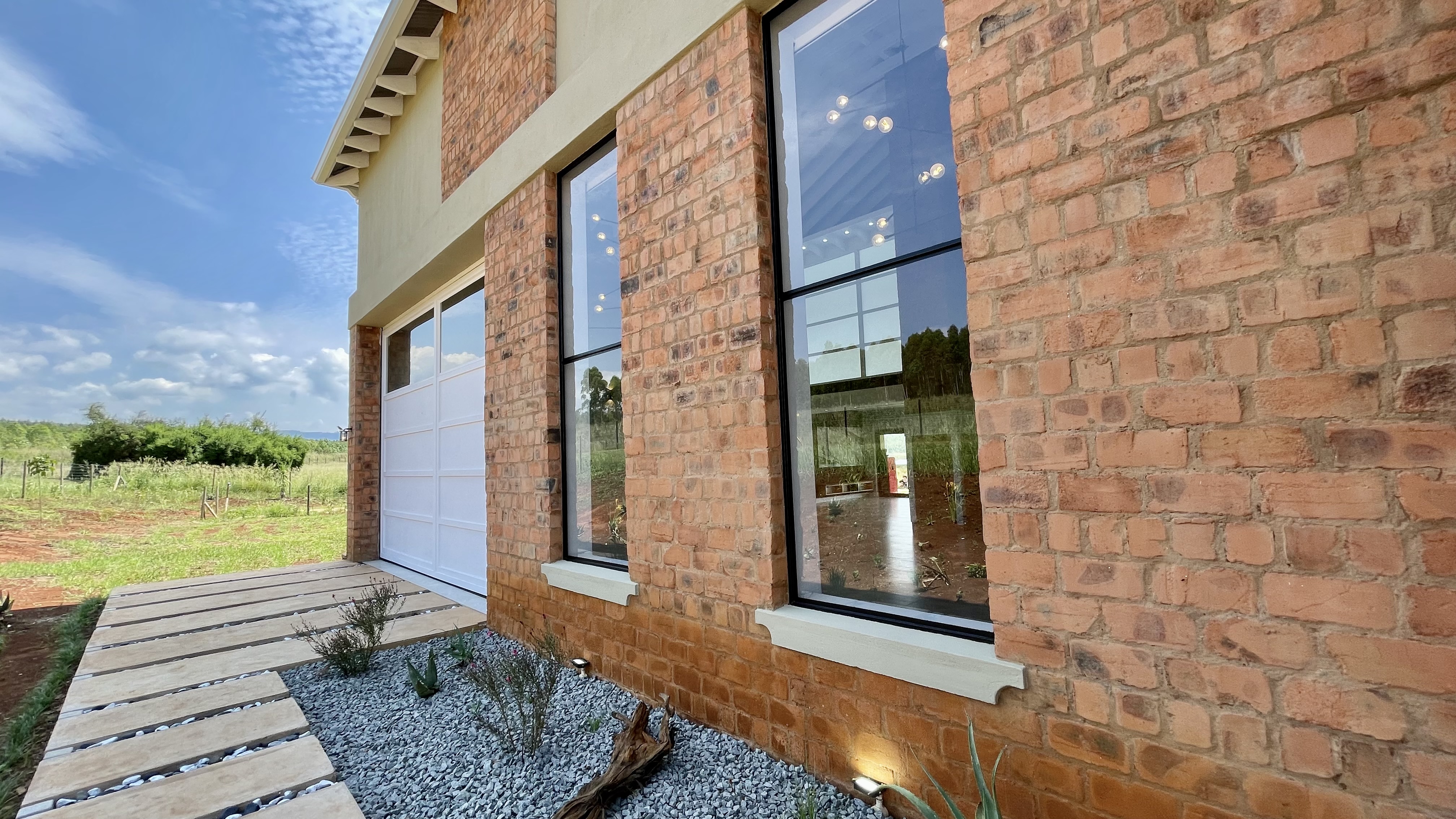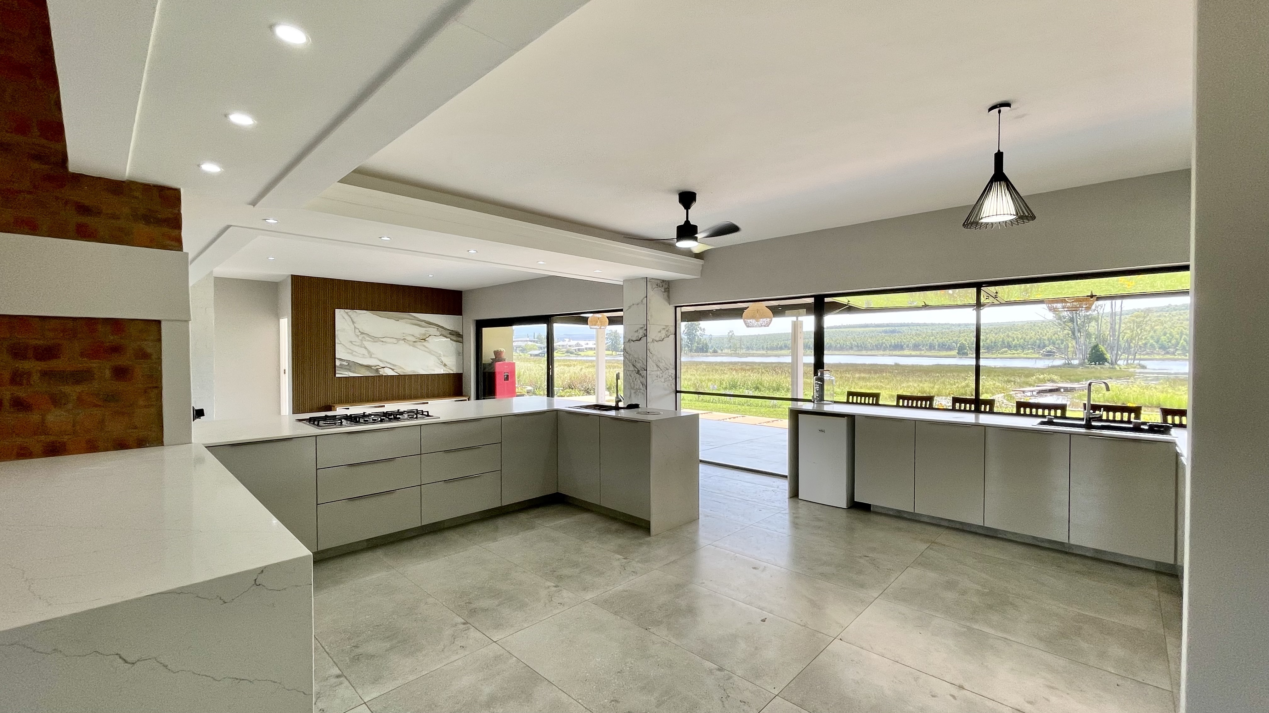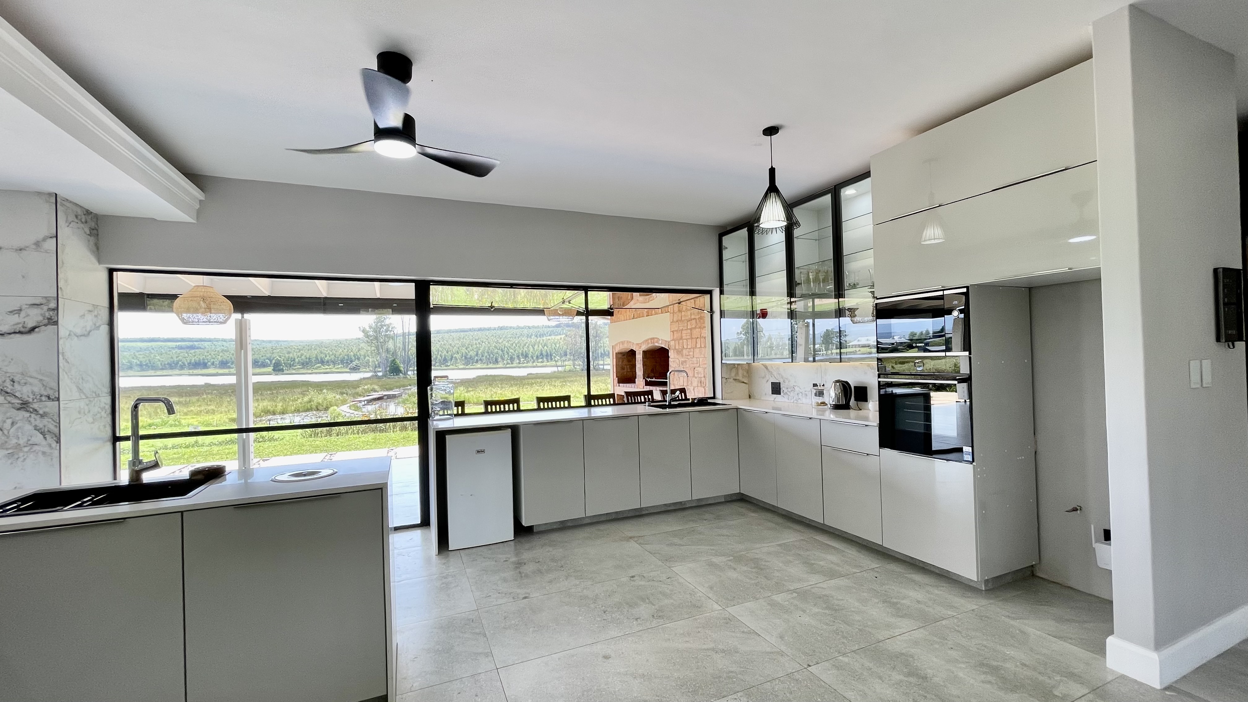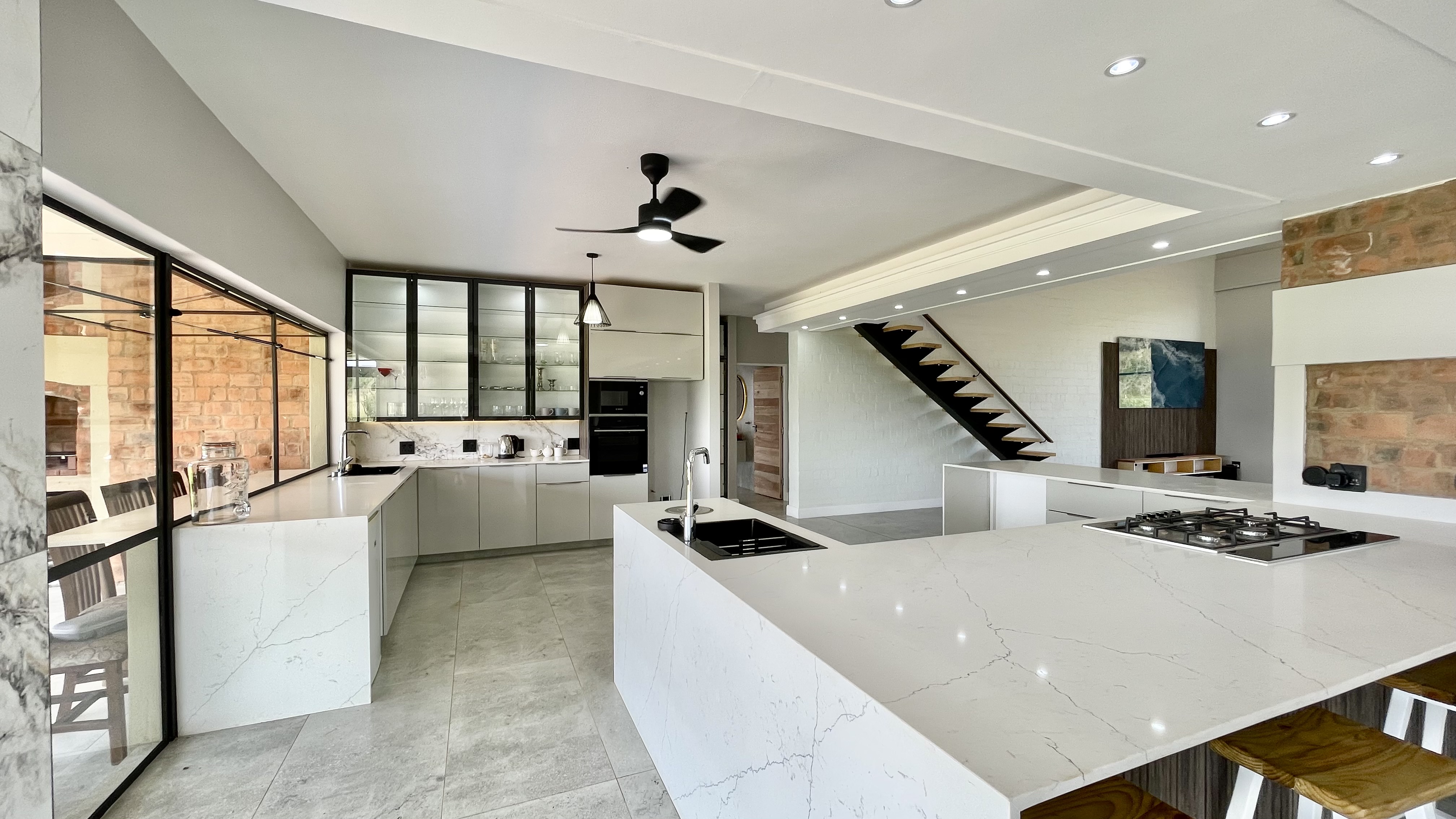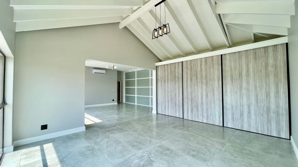Automated doors allow the interior spaces to flow seamlessly onto the covered entertainment patio, complete with a built-in braai and fireplace — ideal for year-round entertaining. The designer kitchen anchors the space with a large central island, quality cabinetry, and effortless connection to both indoor and outdoor living areas.