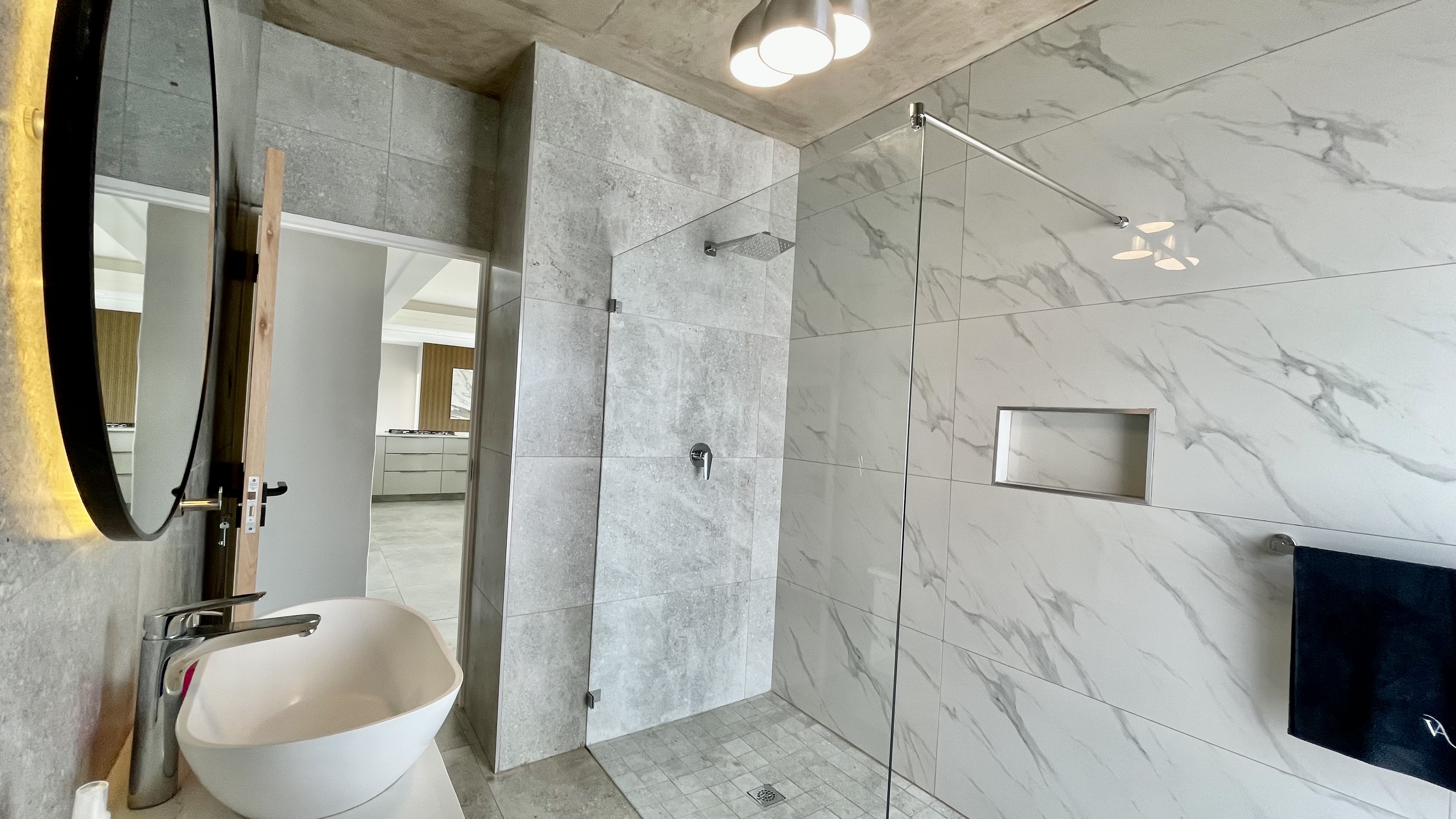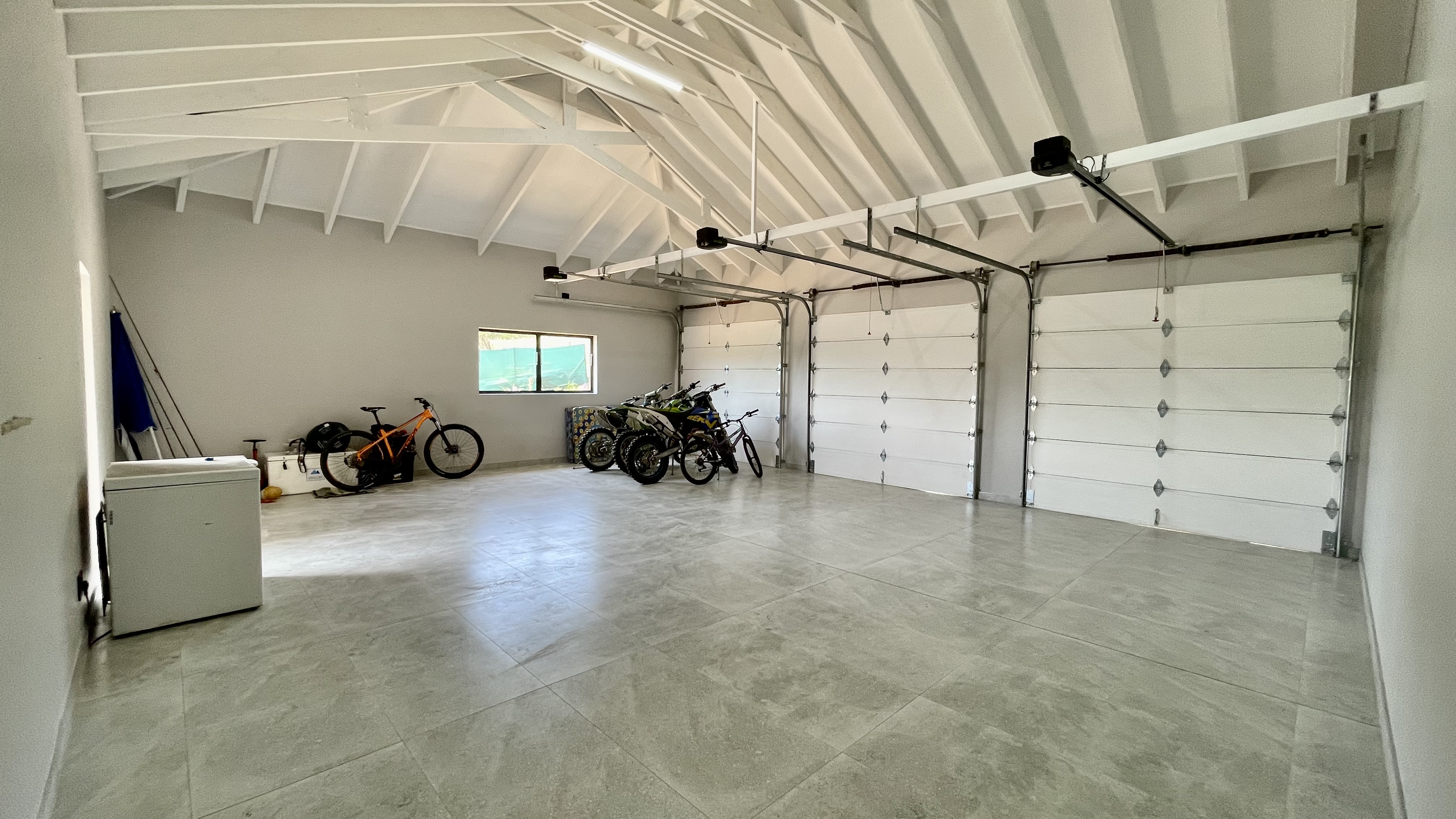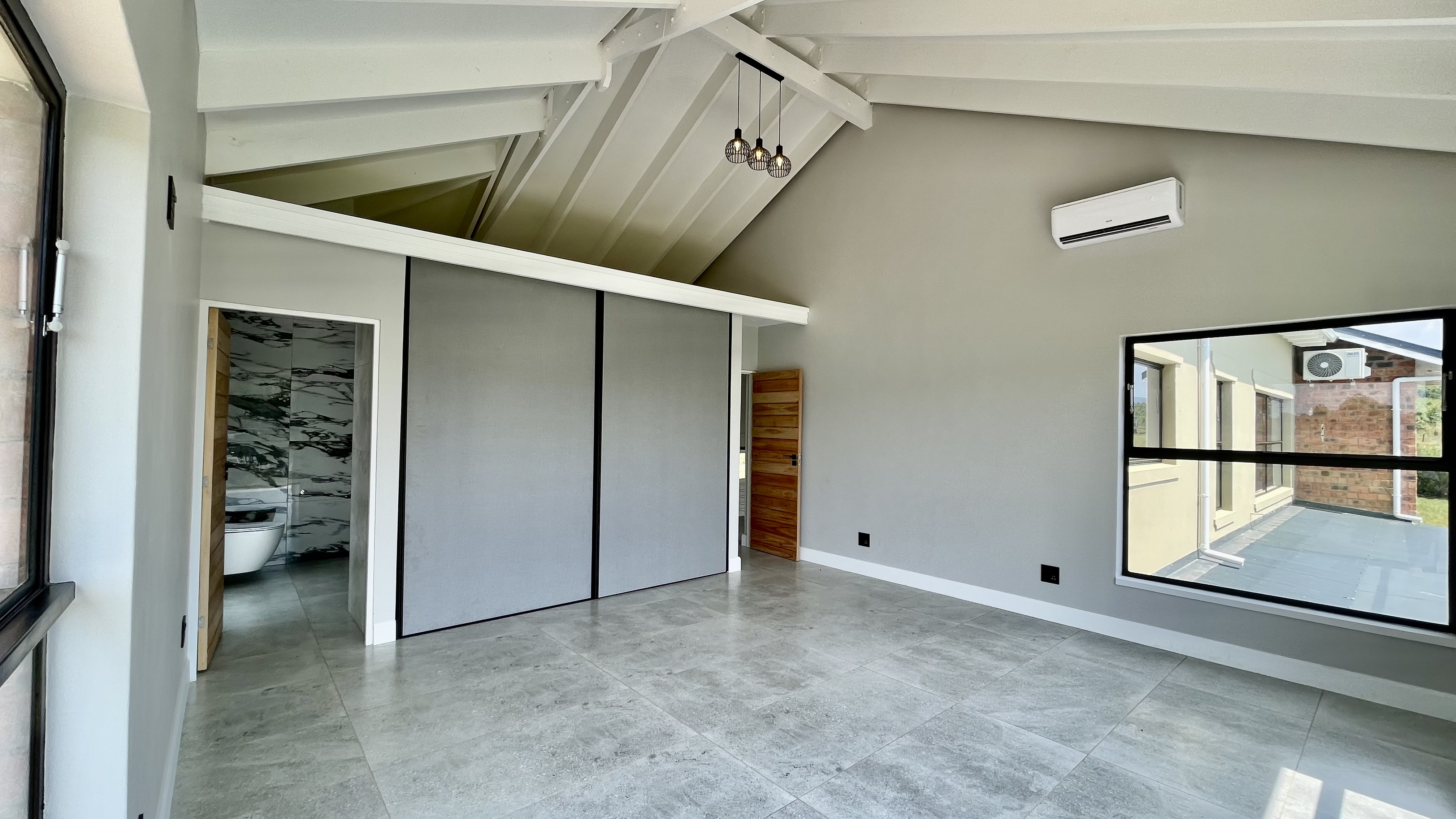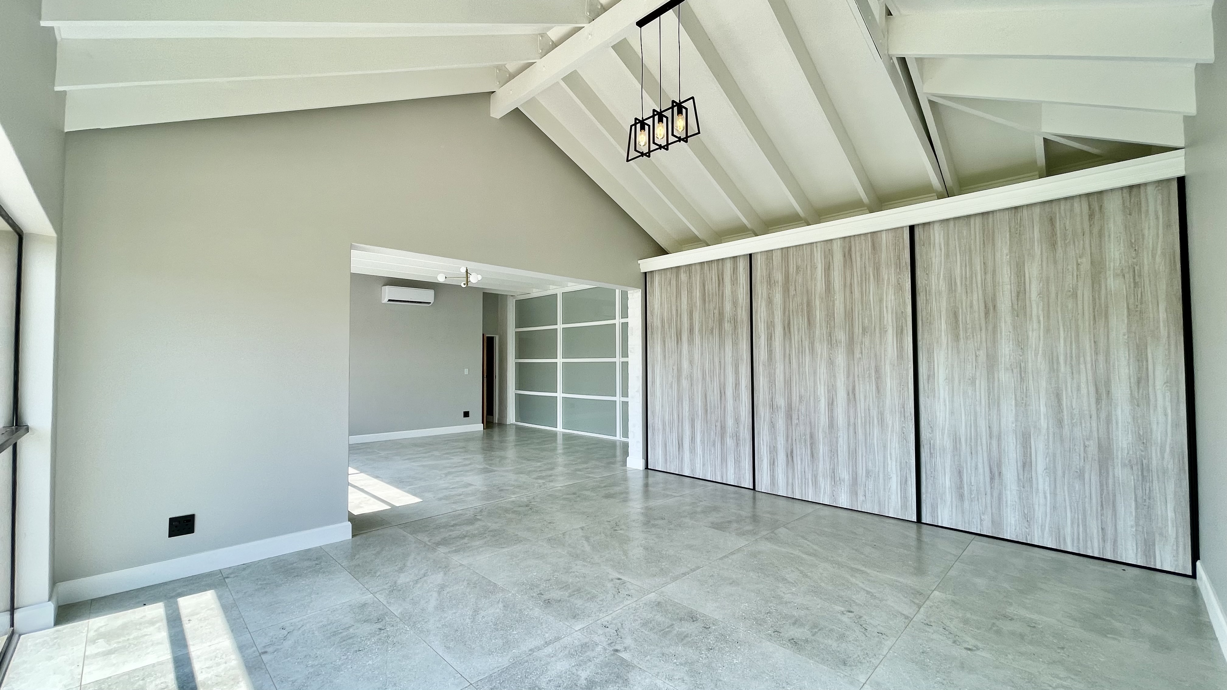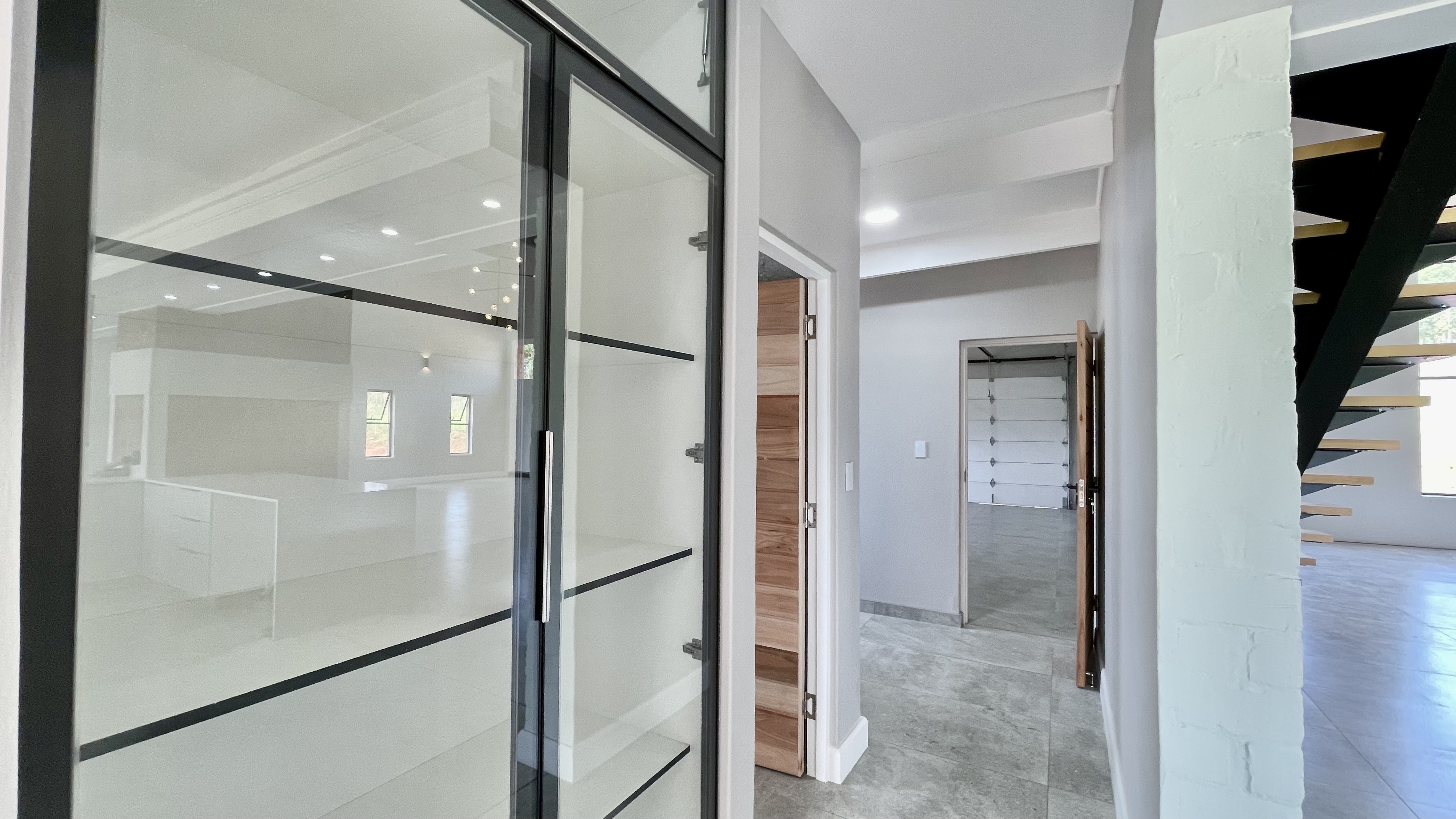 Automated doors allow the interior spaces to flow seamlessly onto the covered entertainment patio, complete with a built-in braai and fireplace — ideal for year-round entertaining. The designer kitchen anchors the space with a large central island, quality cabinetry, and effortless connection to both indoor and outdoor living areas.