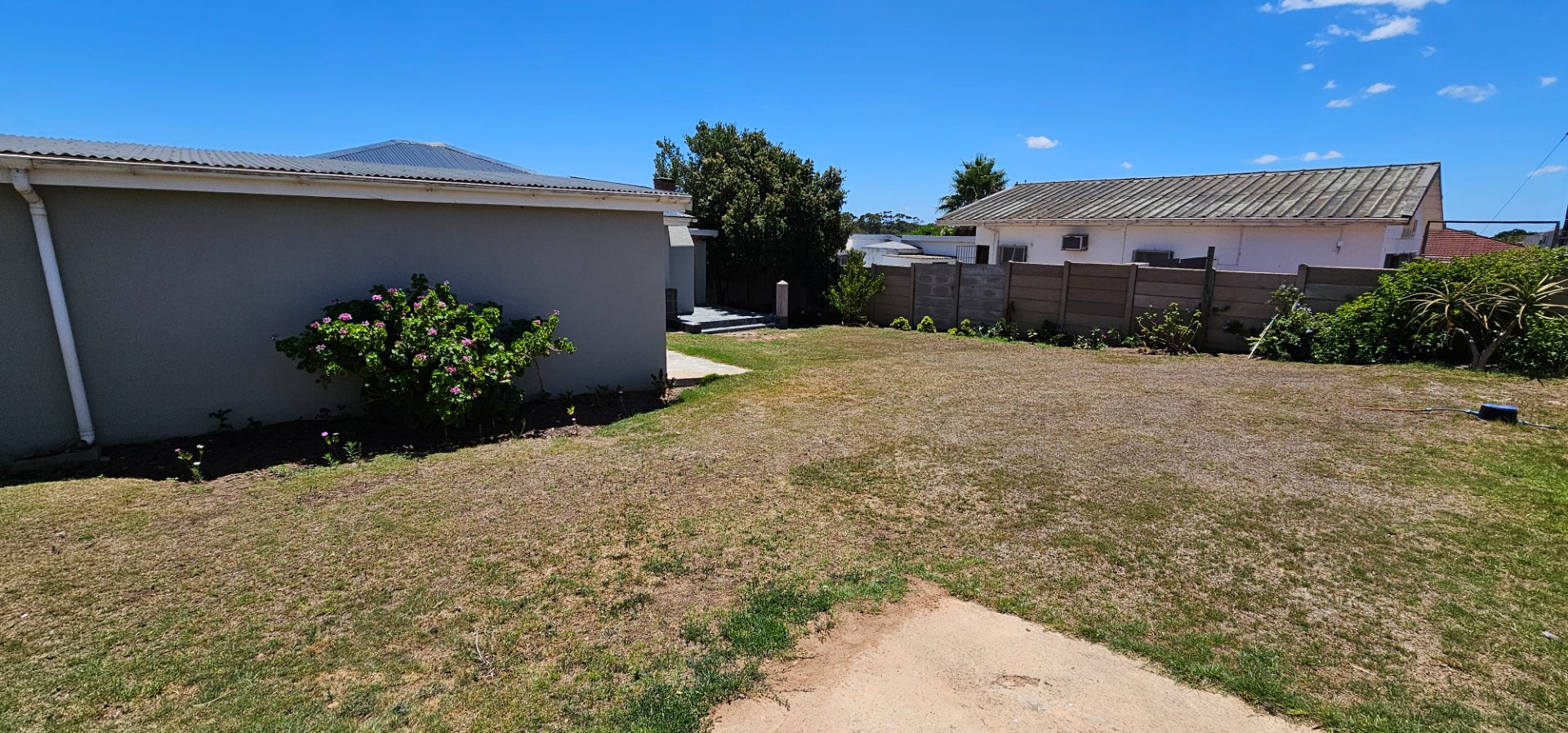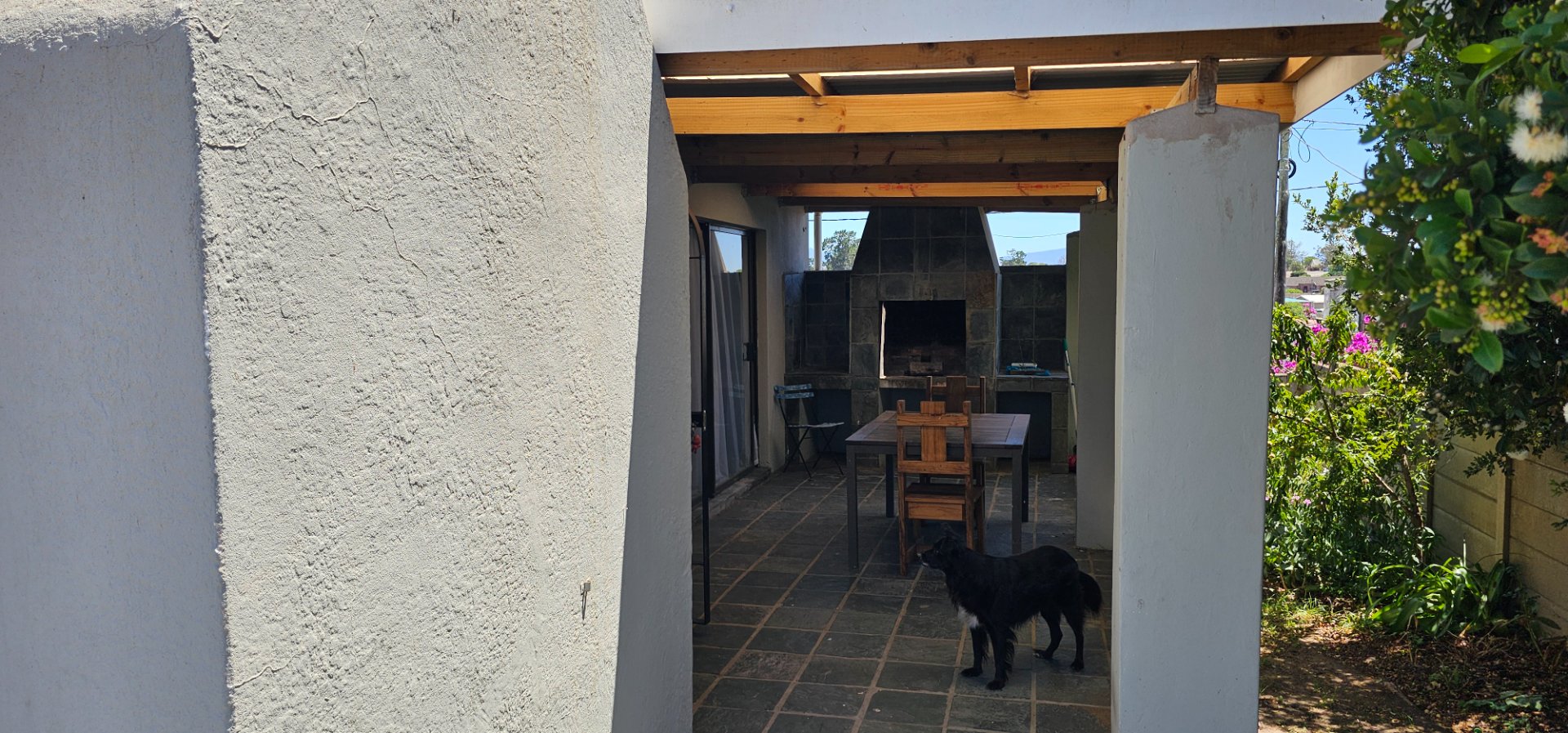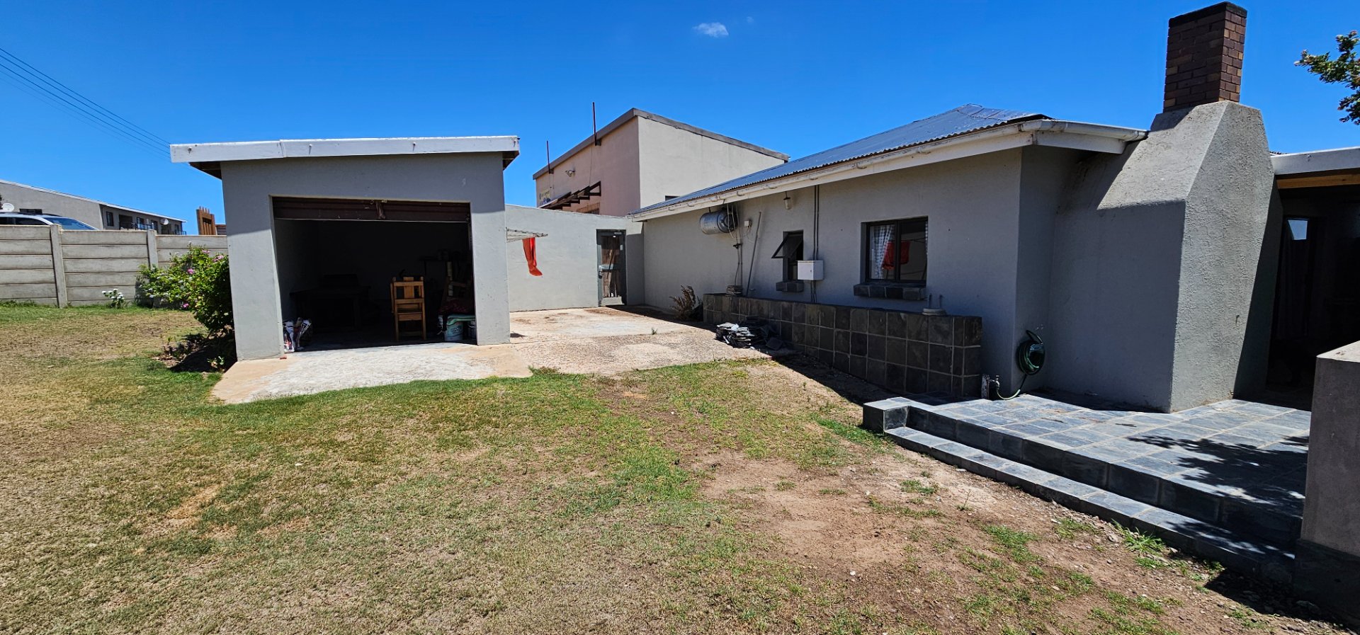 From the Main street running through the town, you walk on a large green Lawn. On your left is the lock up Garage and in front of you is the Stoep with a build in Braai. From there you enter the Kitchen with a open plan leading to the Lounge/Dinning area. Further in you get the Main bedroom with an en-suite Bathroom. The second bedroom has its own seperate Bathroom.