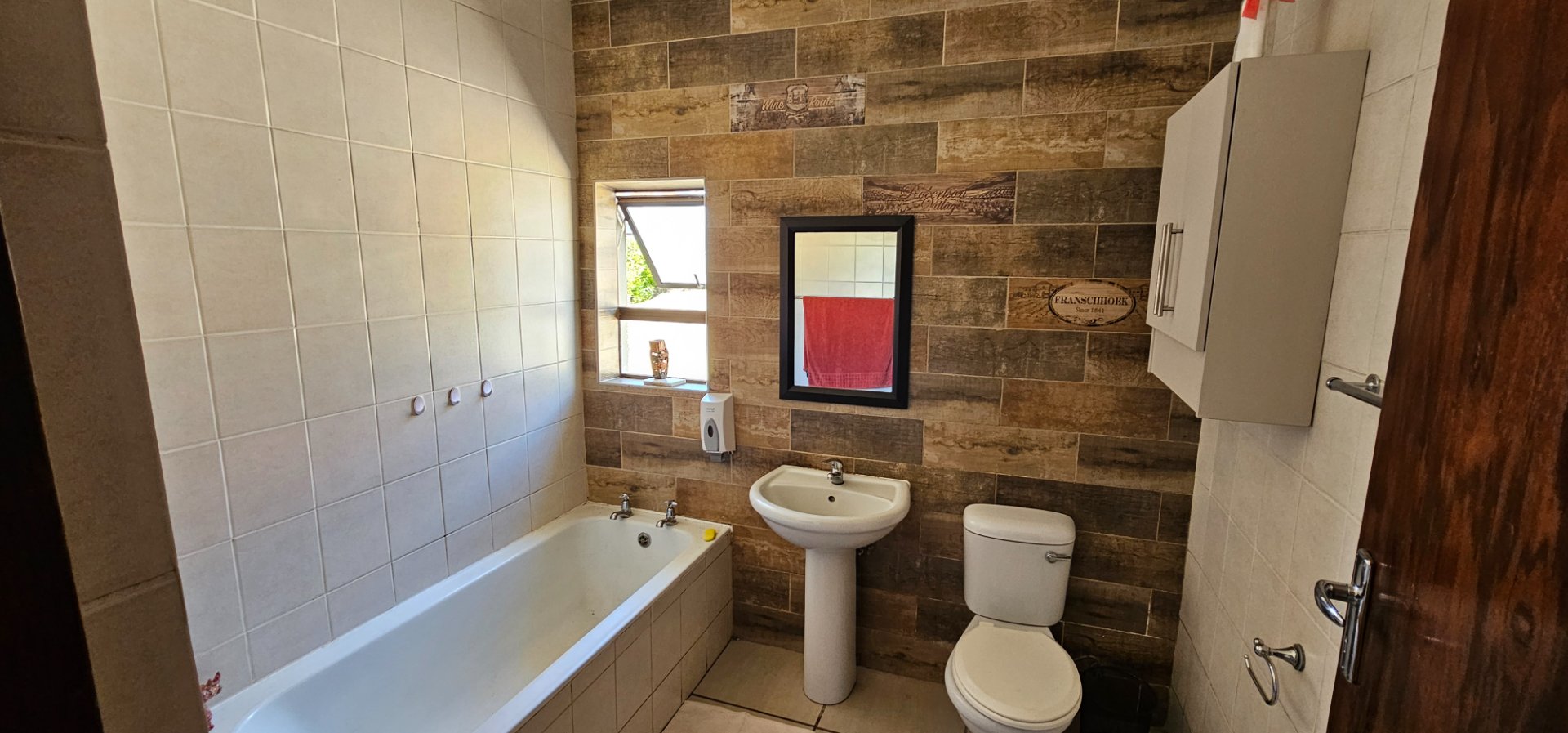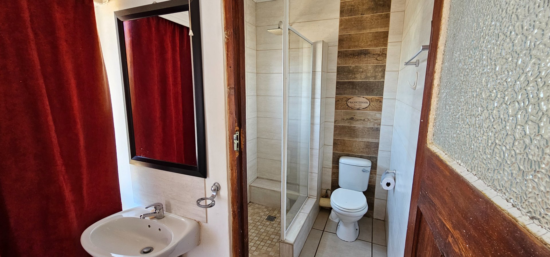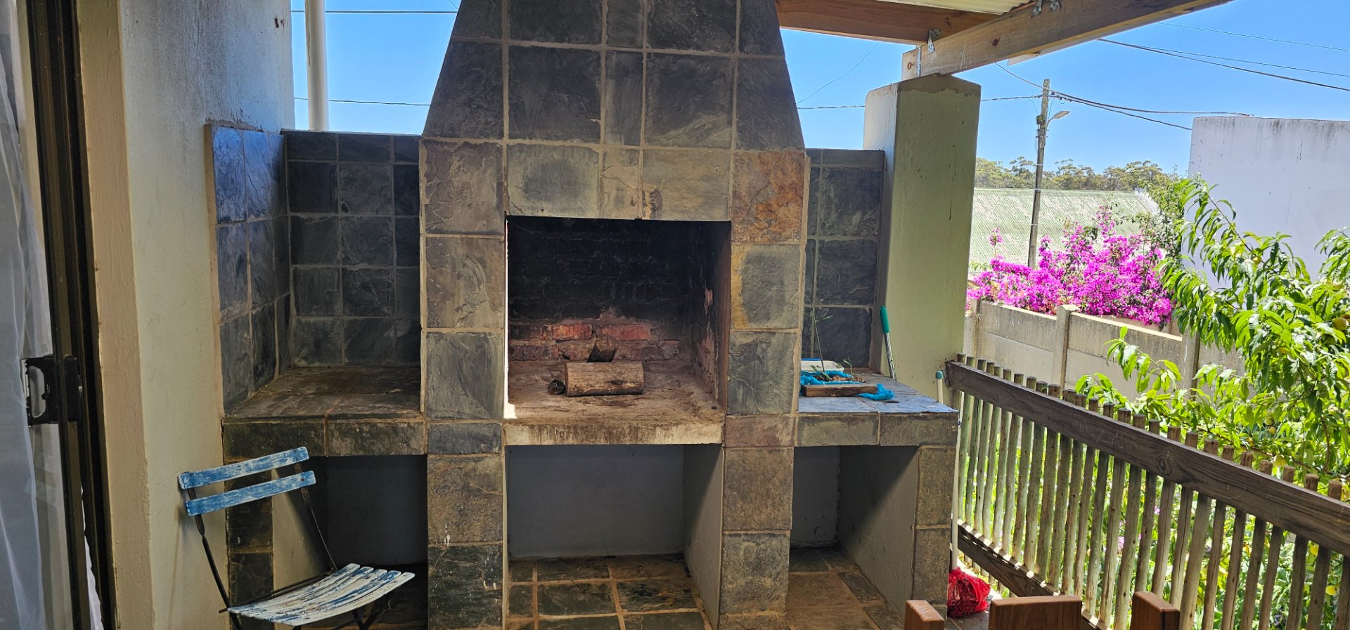 From the Main street running through the town, you walk on a large green Lawn. On your left is the lock up Garage and in front of you is the Stoep with a build in Braai. From there you enter the Kitchen with a open plan leading to the Lounge/Dinning area. Further in you get the Main bedroom with an en-suite Bathroom. The second bedroom has its own seperate Bathroom.