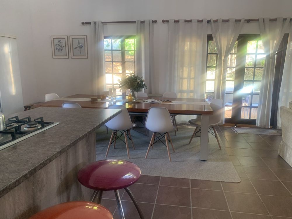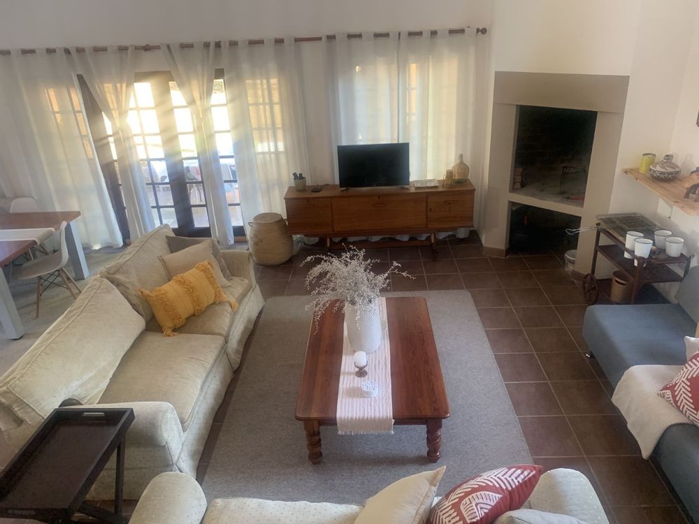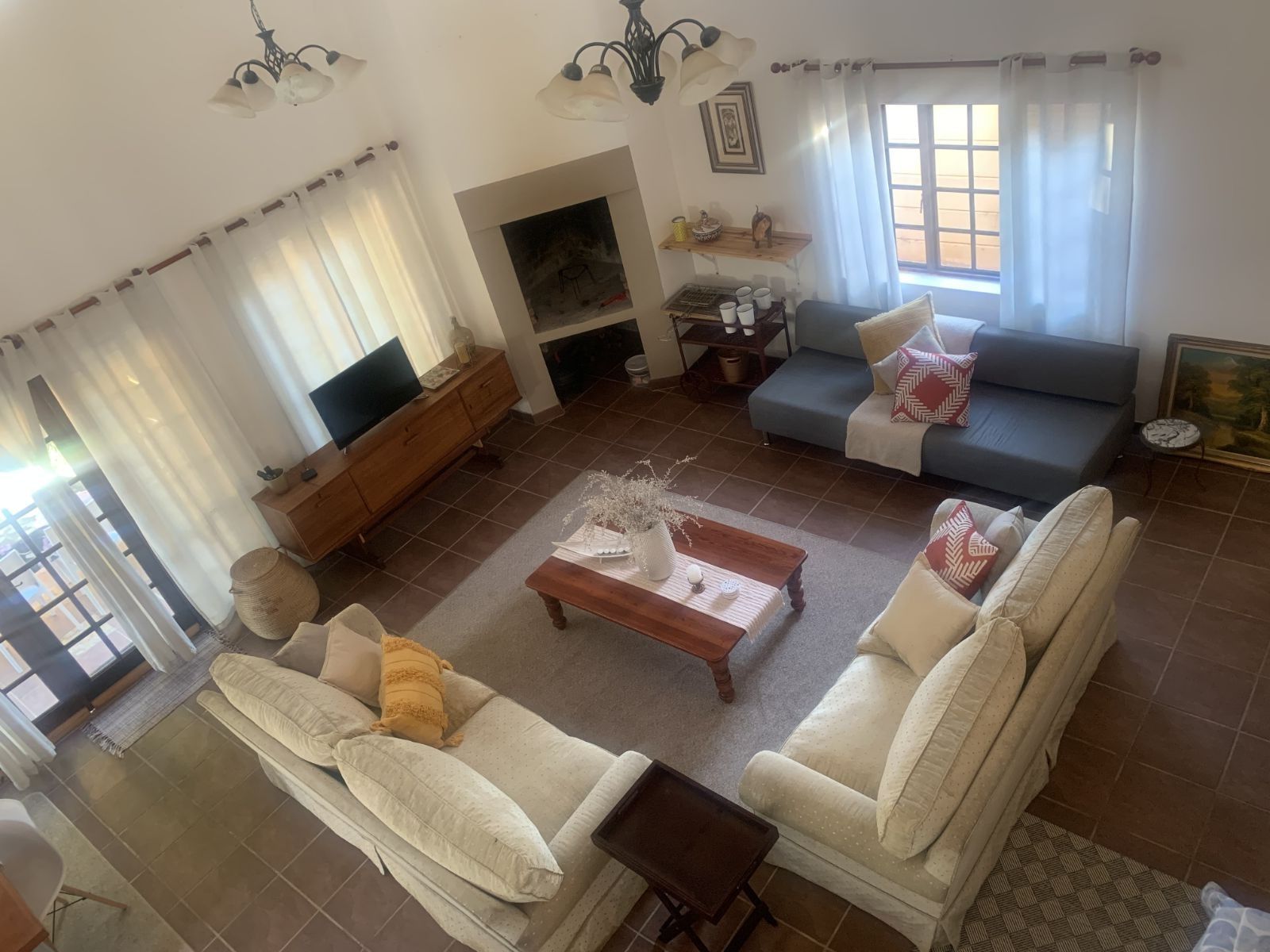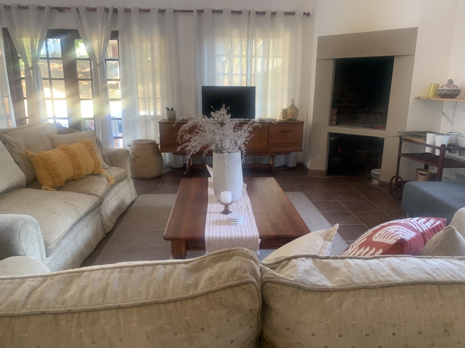 Sunlight floods the interior through charming wooden-framed windows a, creating a warm and welcoming atmosphere throughout. The spacious open-plan layout connects the living and dining areas seamlessly, with a built-in fireplace to keep thigs cozy on cooler days-perfect for family time or quiet evenings in.