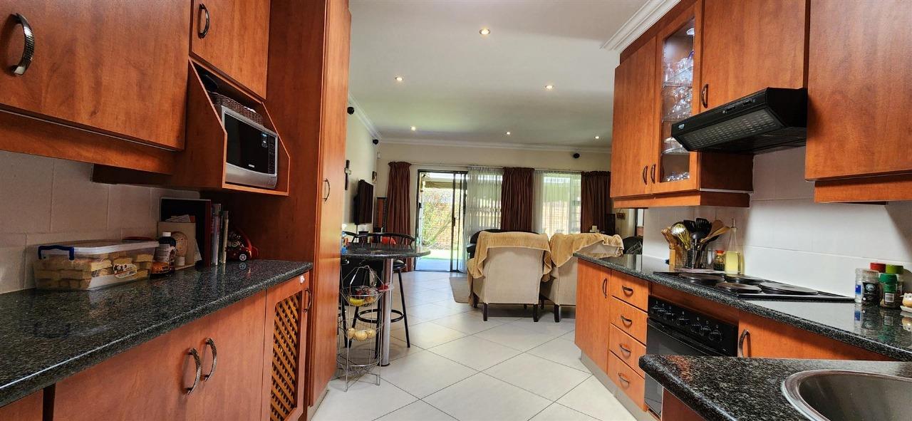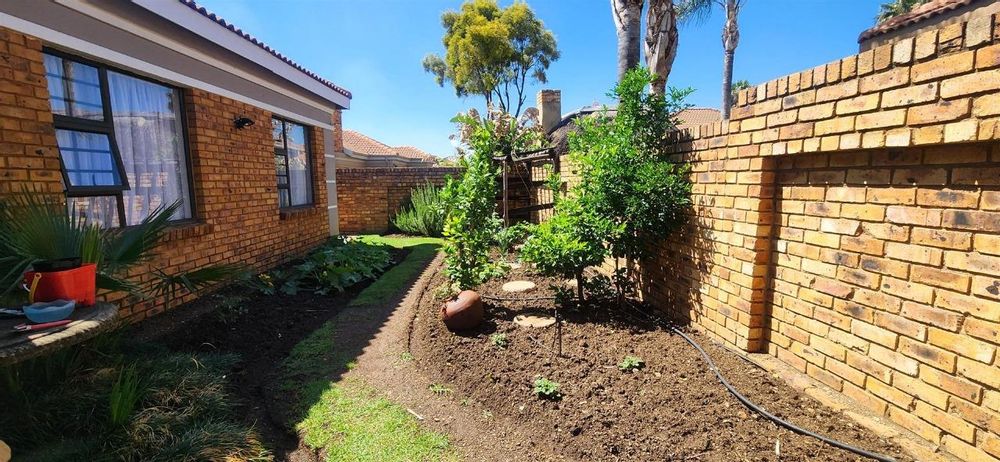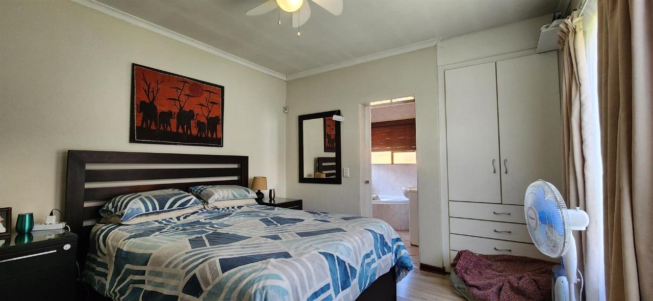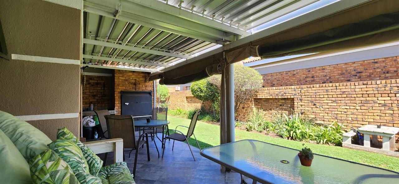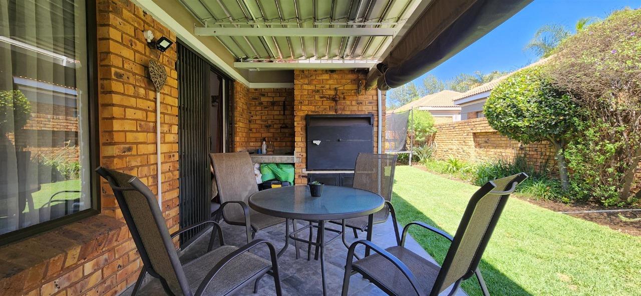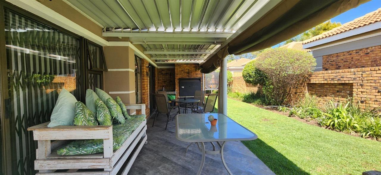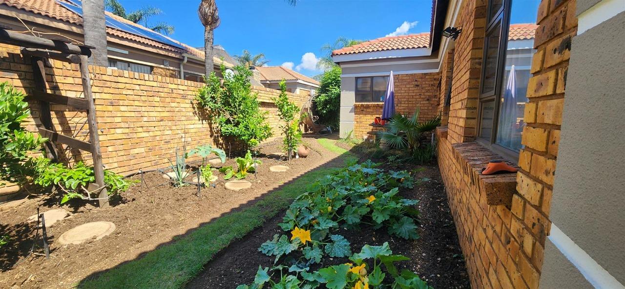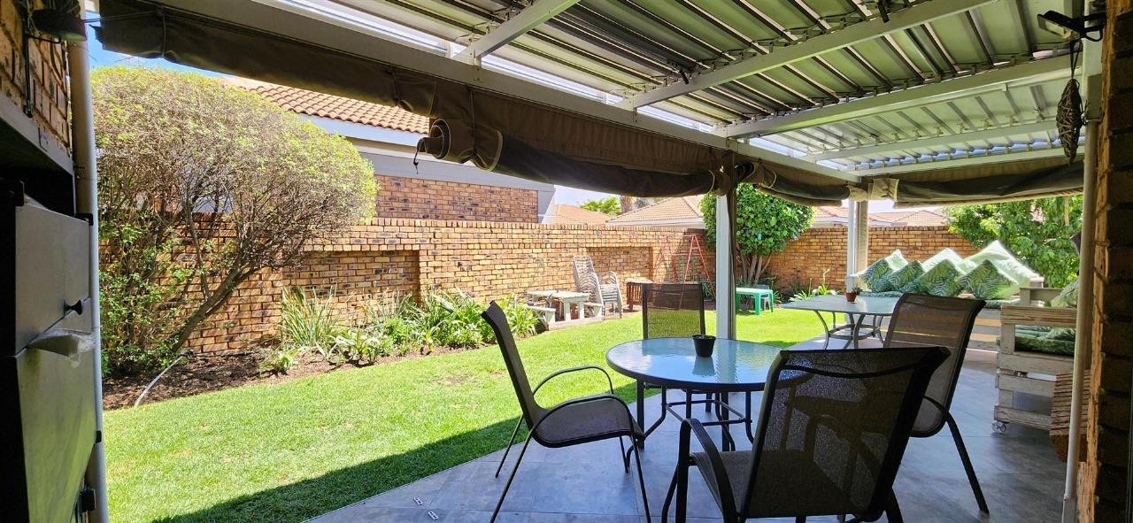 Outdoor living is a delight with the covered entertainer's patio, complete with a built-in braai and drop-down canvas sails for added privacy and comfort. The private garden offers a serene retreat, perfect for pets (excluding cats) to roam freely.