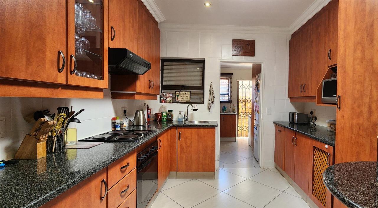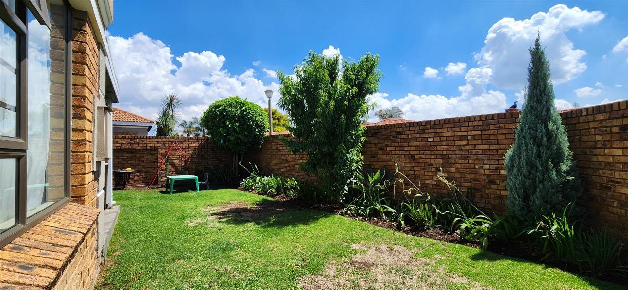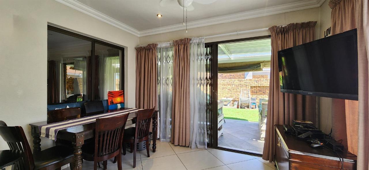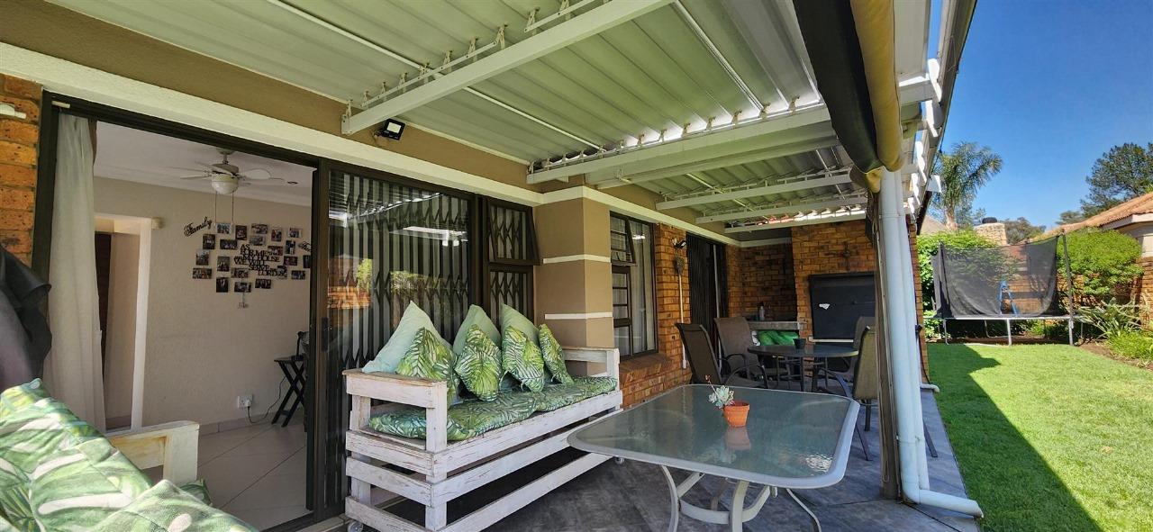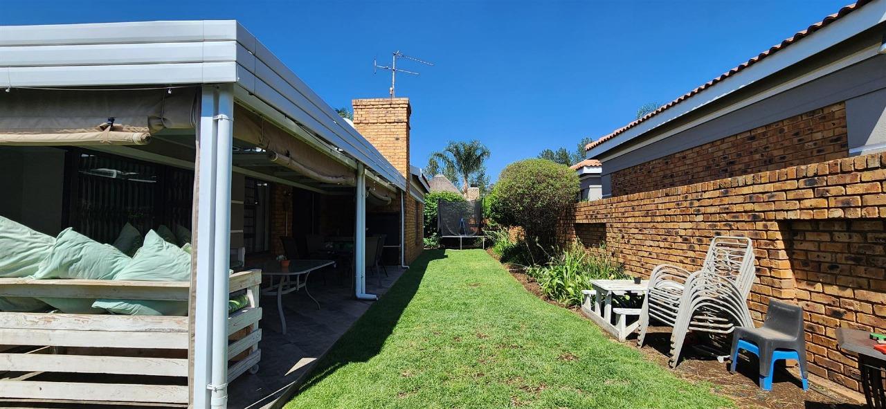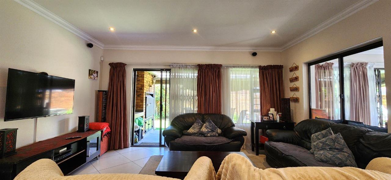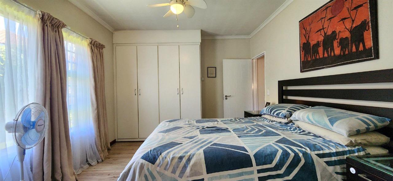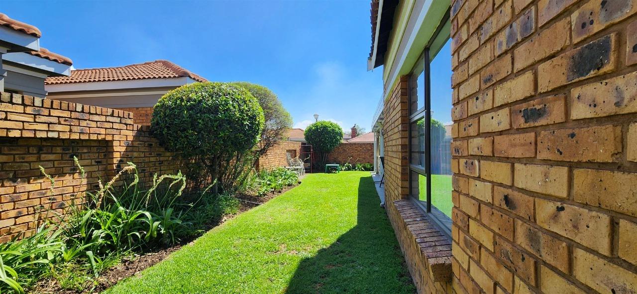 Outdoor living is a delight with the covered entertainer's patio, complete with a built-in braai and drop-down canvas sails for added privacy and comfort. The private garden offers a serene retreat, perfect for pets (excluding cats) to roam freely.