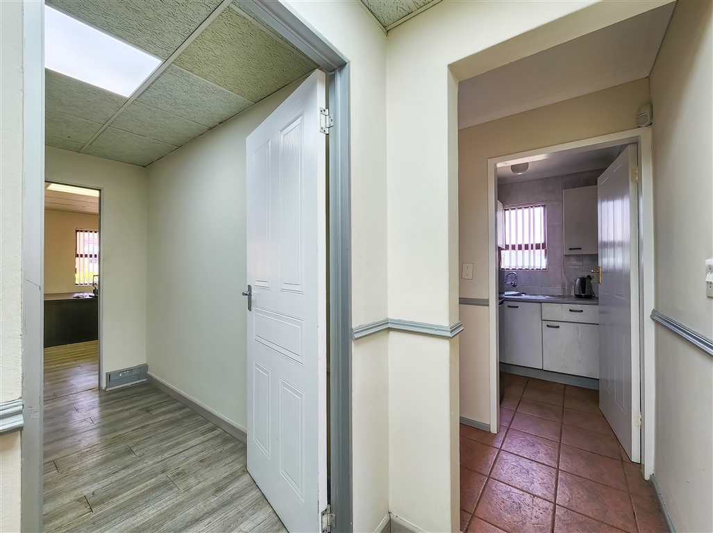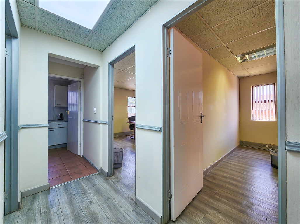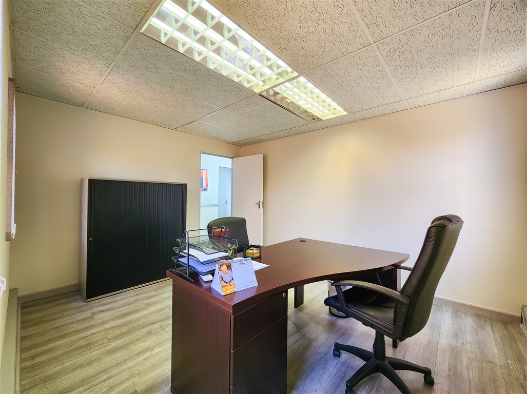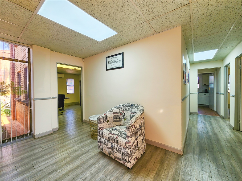 This moderrn office to let in Westwood Office Park is located on the ground floor and welcomes you with a spacious reception area followed by a boardroom that can accommodate a 6-seater. A passage further leads you to 4 individual offices, a private dedicated kitchen and private dedicated ladies and gents restrooms. All the windows have ready fitted blinds. The office enjoys vinyl floors throughout. Fibre ready and is conveniently supported by a backup generator.