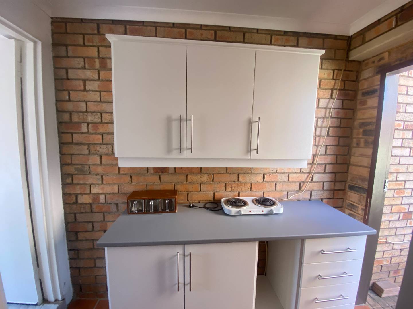 Room is furnished with bed and has a bathroom and small kitchenette.