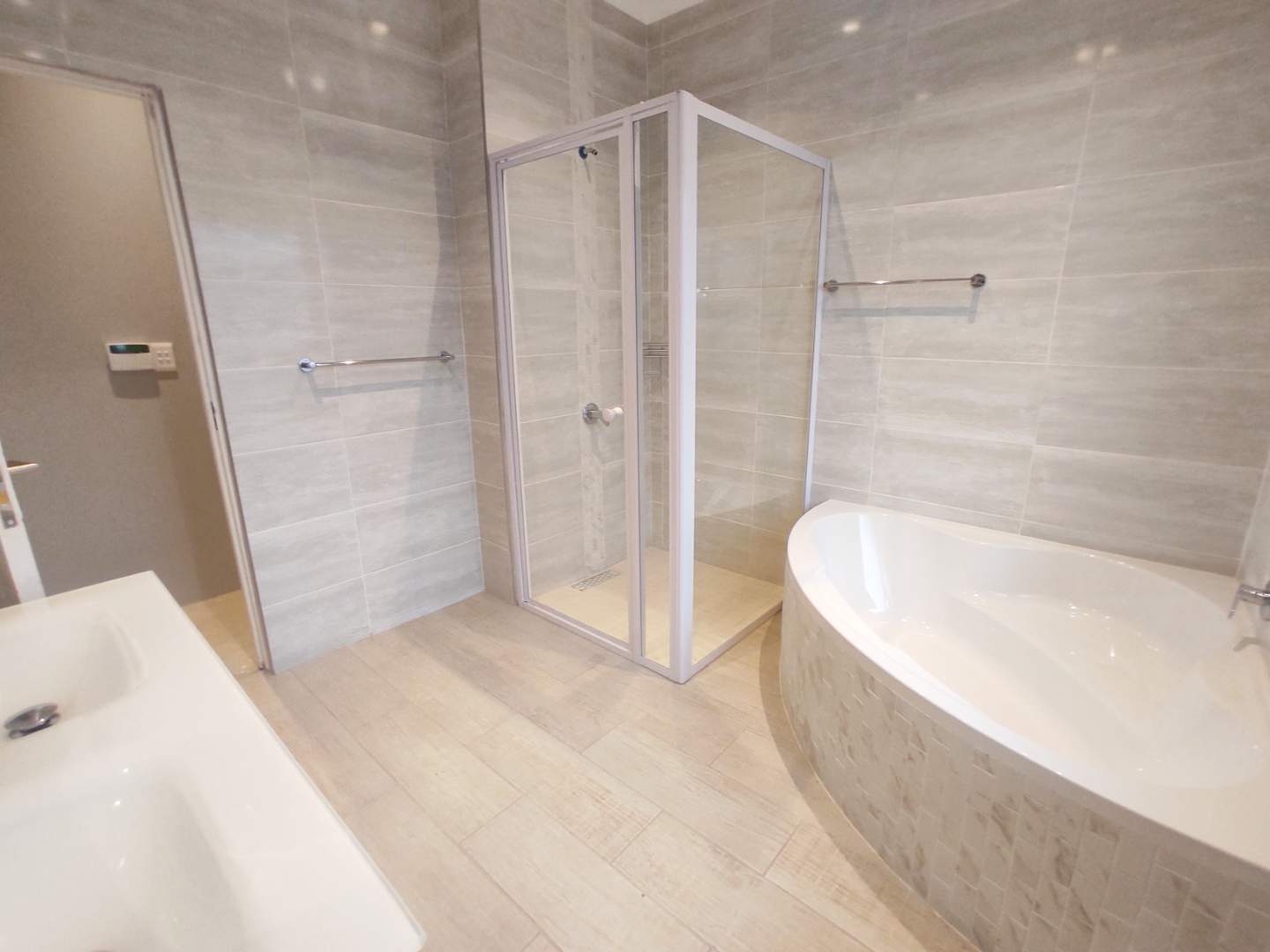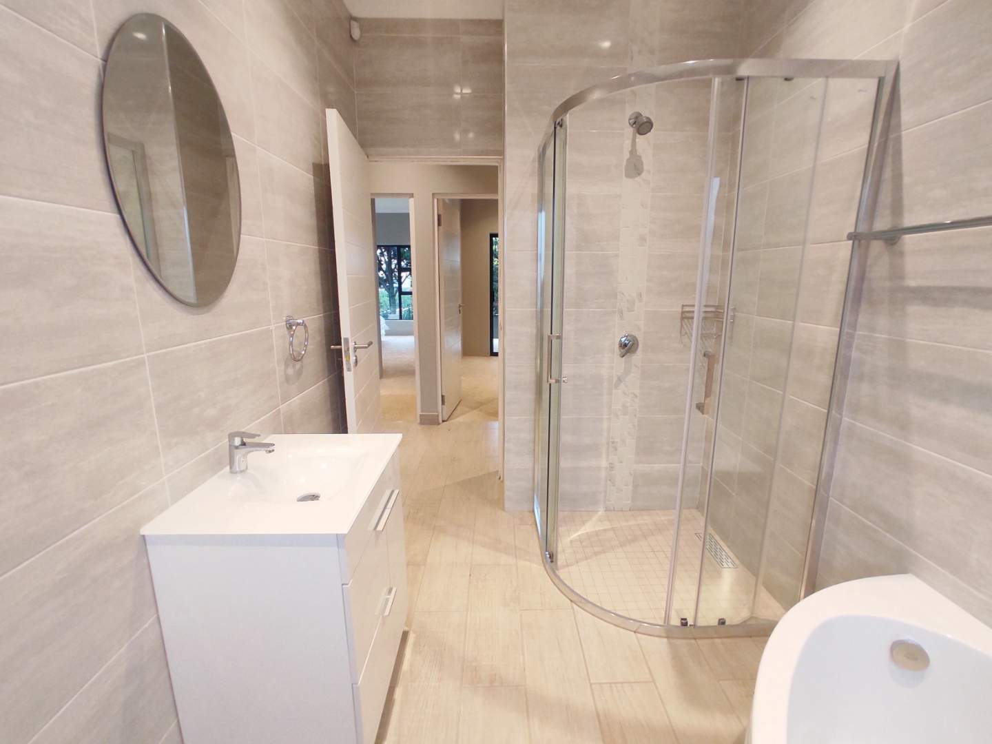 The interior features a spacious and bright living and dining area, a modern kitchen with ample cupboard space, a five-plate gas hob, an electric oven, and space for a double-door fridge. The scullery has space for one undercounter appliance. The large main bedroom includes sliding doors leading to the patio and an en-suite bathroom with a bath, shower, and his-and-hers basins. The second and third bedrooms both have ample built-in cupboards with sliding doors. The fourth bedroom includes built-in cupboards with sliding doors, and an en-suite bathroom. The first bathroom has a shower and serves as the en-suite to the guest bedroom. The second bathroom includes a corner bath and shower, and the third bathroom, en-suite to the main bedroom, features a bath, shower, and his-and-hers basins.