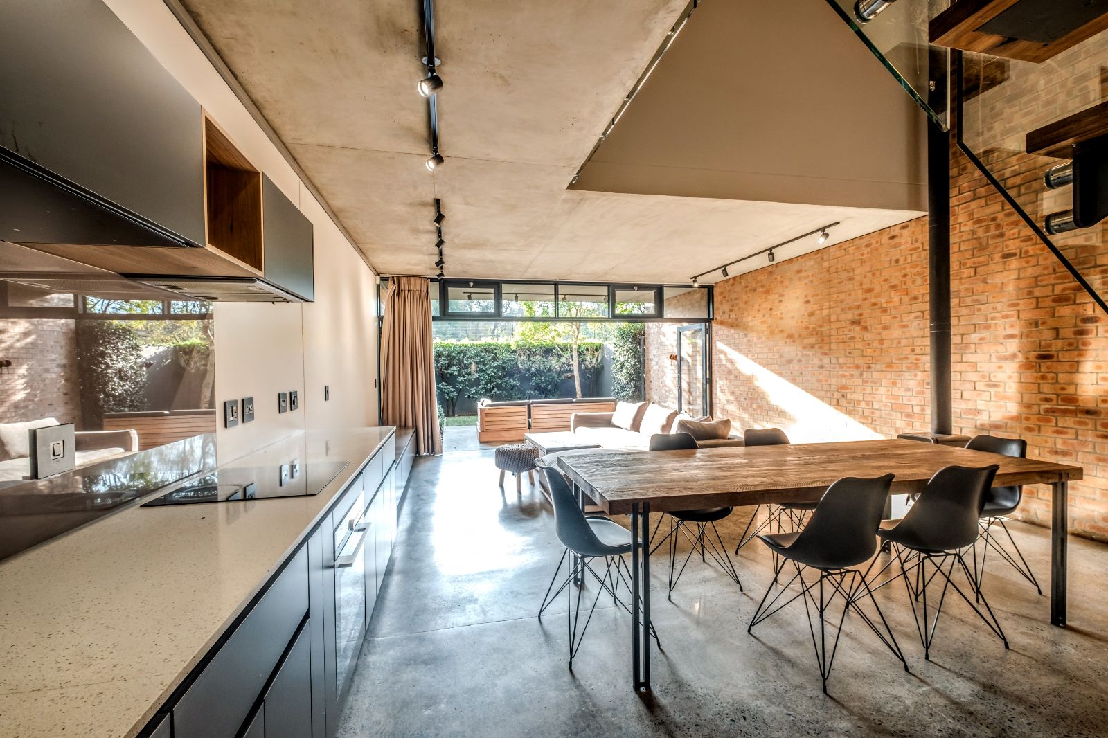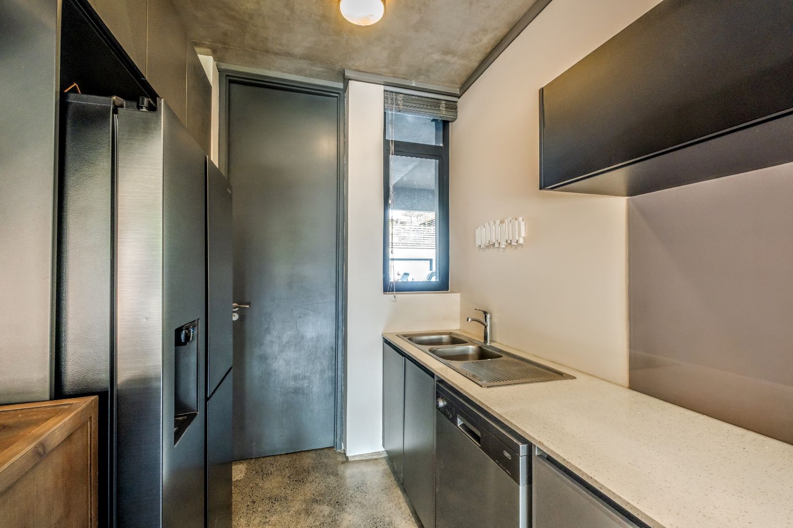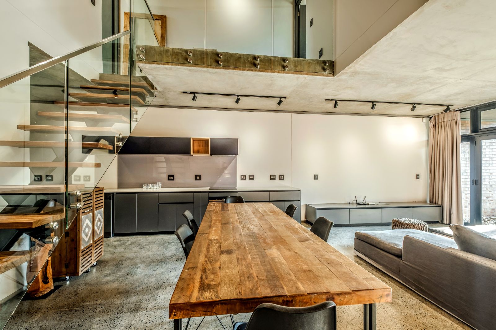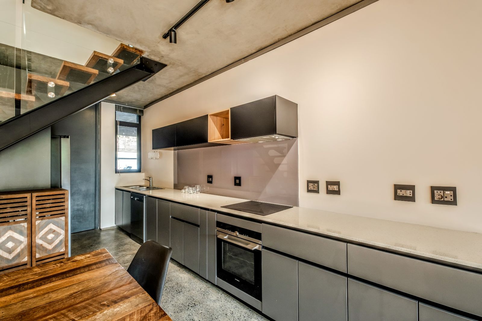 The architectural aesthetics of this uniquely styled duplex with its double volume concrete slab ceilings on the ground floor and quality wood panelled ceilings on the second floor is longing to be enhanced by your unequivocally tasteful interior.