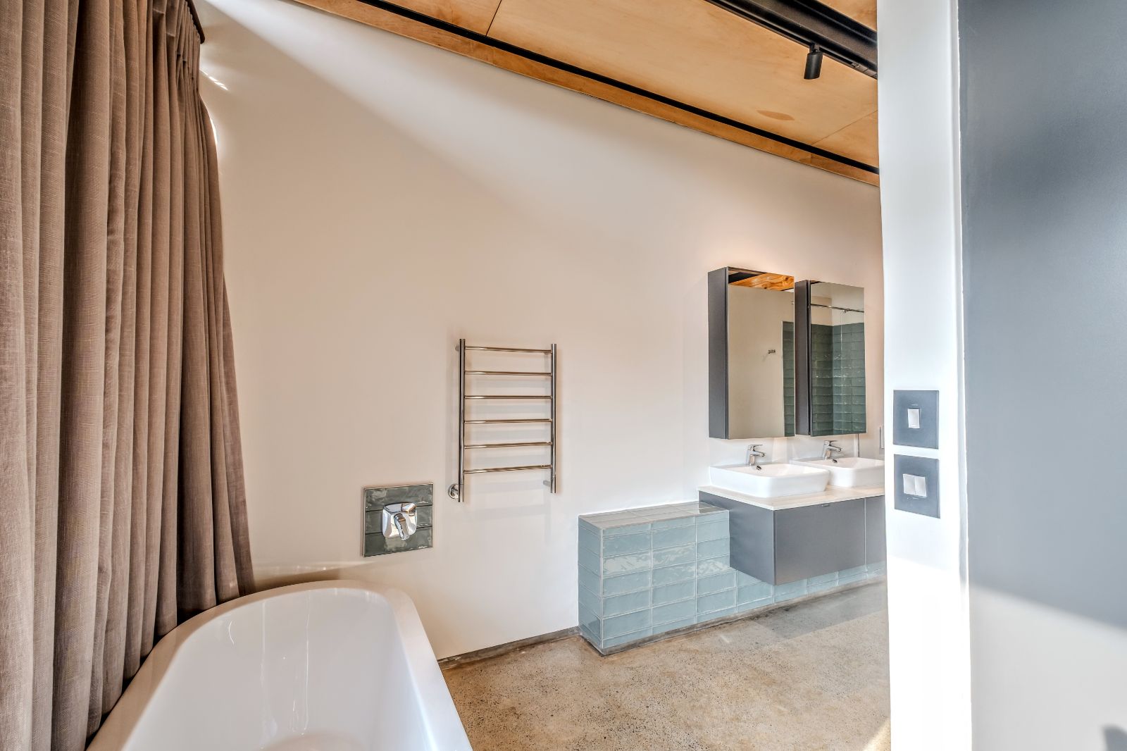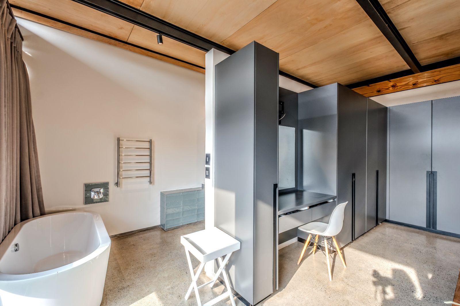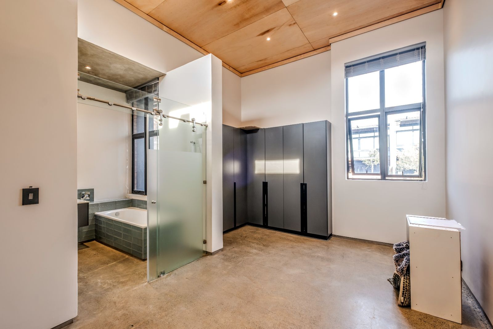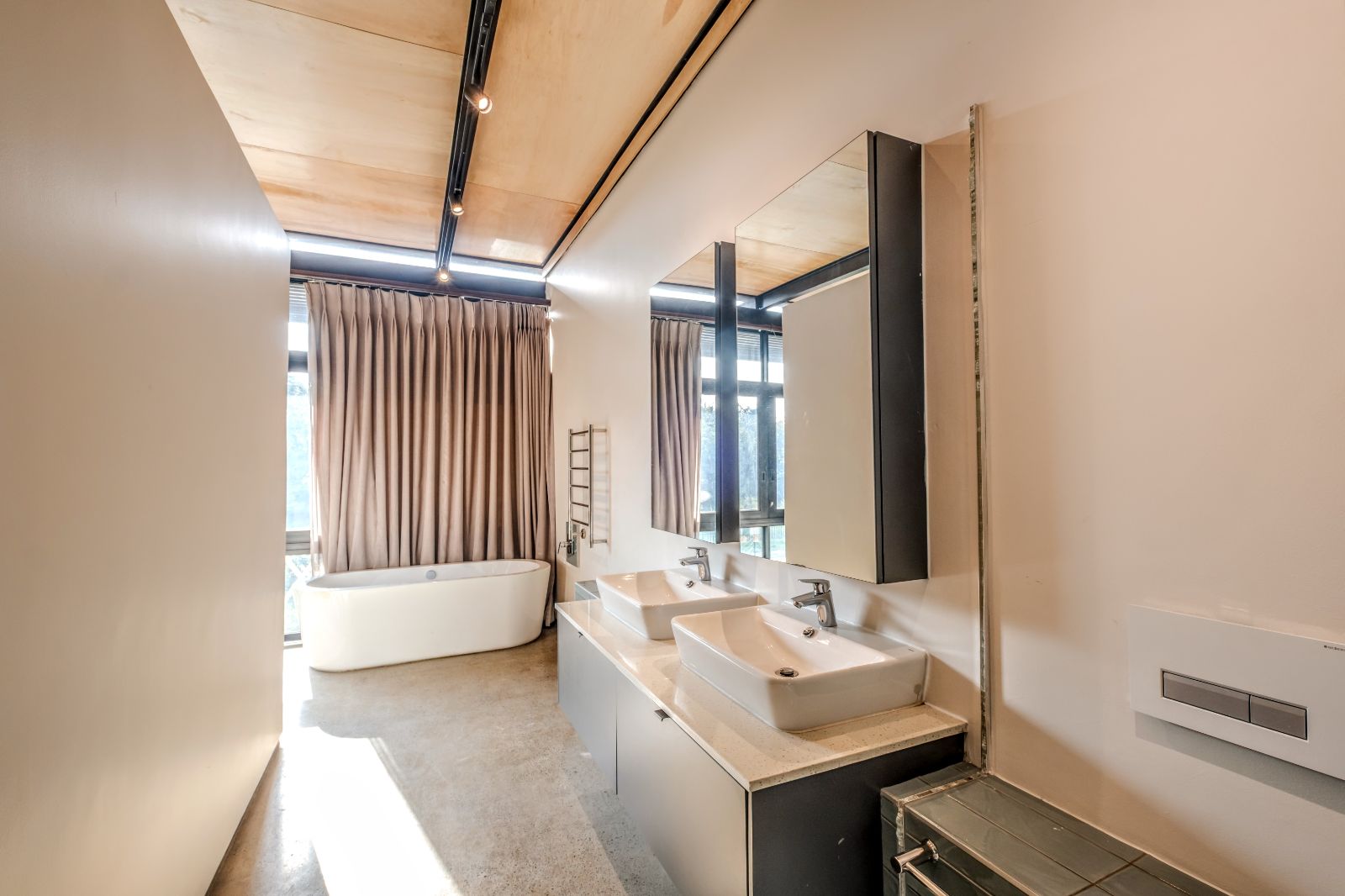 The architectural aesthetics of this uniquely styled duplex with its double volume concrete slab ceilings on the ground floor and quality wood panelled ceilings on the second floor is longing to be enhanced by your unequivocally tasteful interior.