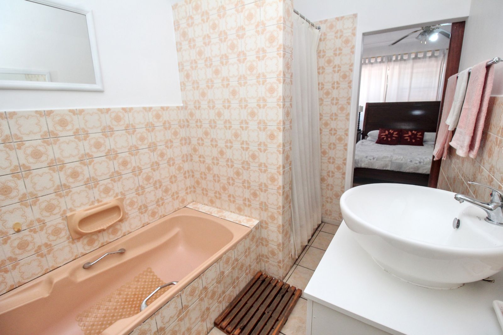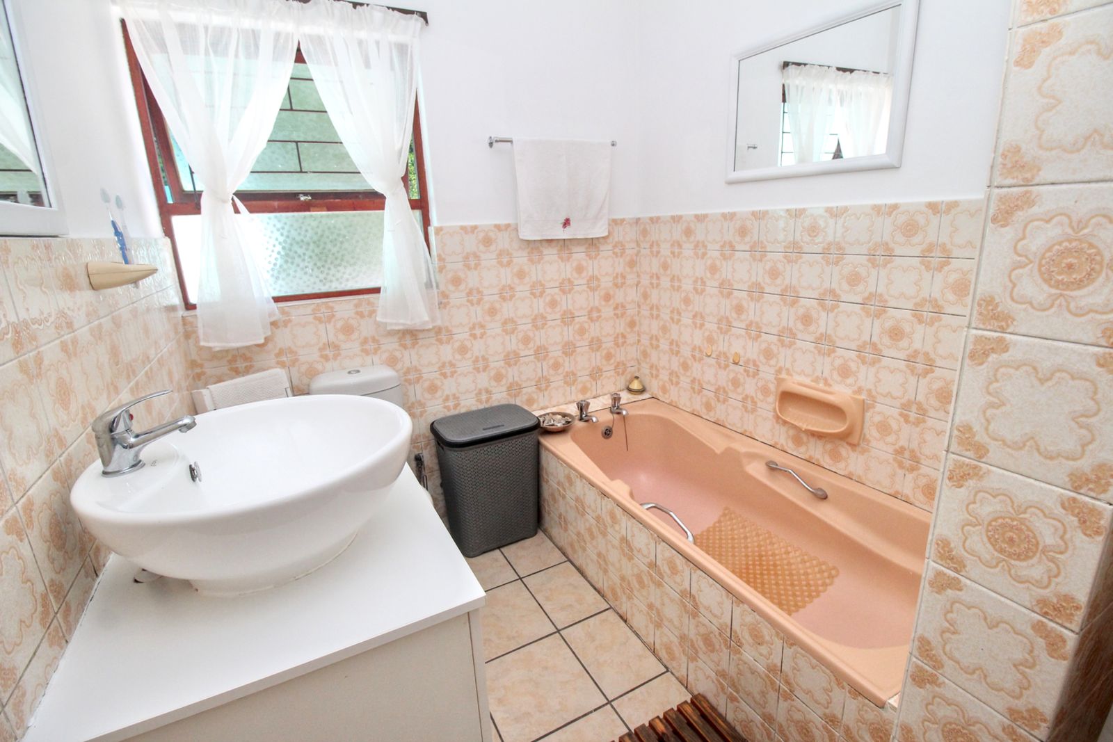 The main bedroom includes a full en-suite bathroom, while the second bathroom, positioned close to the additional bedrooms, offers a bath, basin and toilet. An entertainment room links the home to the garden and pool, functioning as a simple, practical transition space rather than a formal outdoor room. It provides straightforward access between indoors and outdoors. Built-in linen cupboards in the hallway add to the home's everyday convenience.