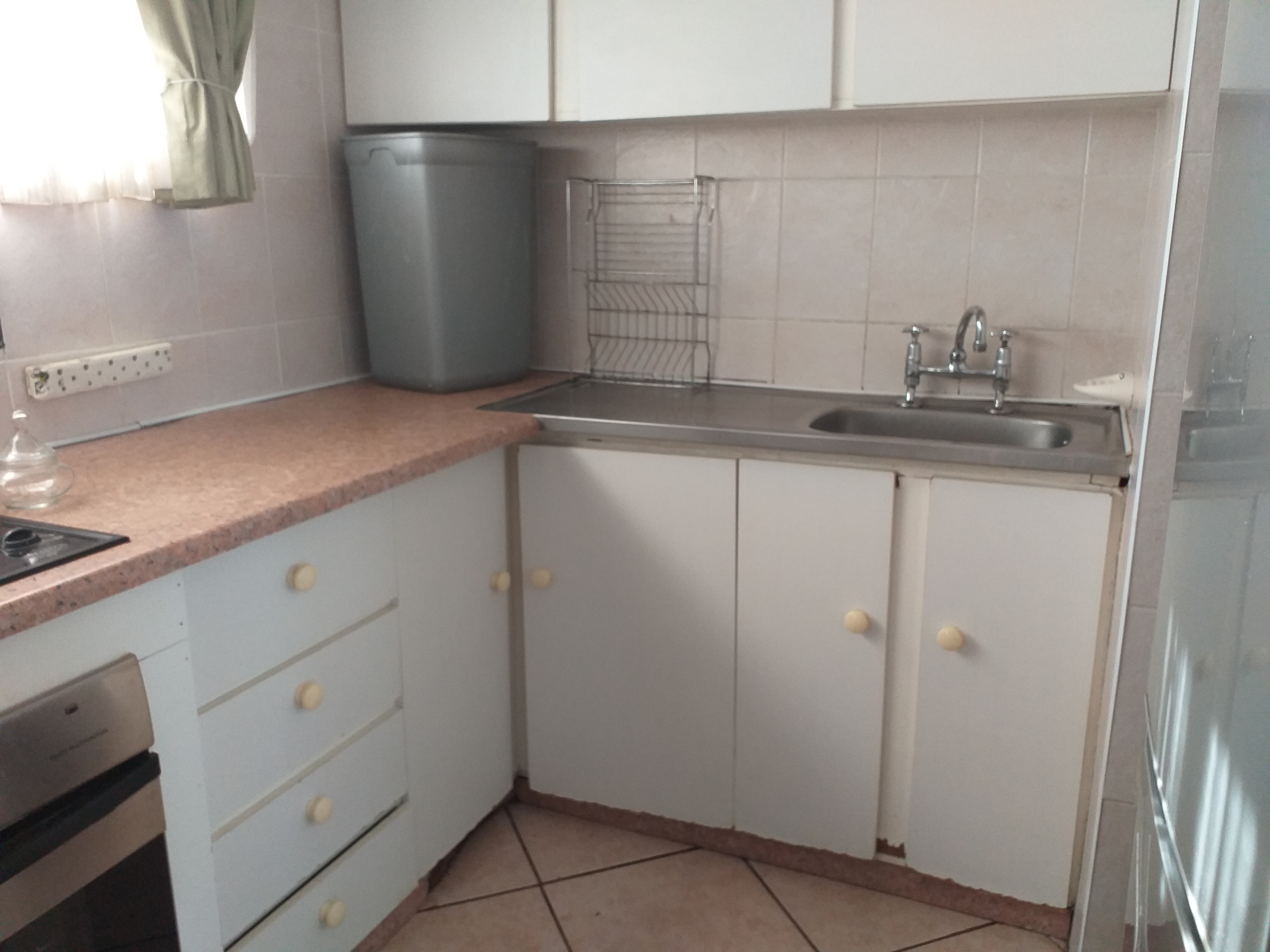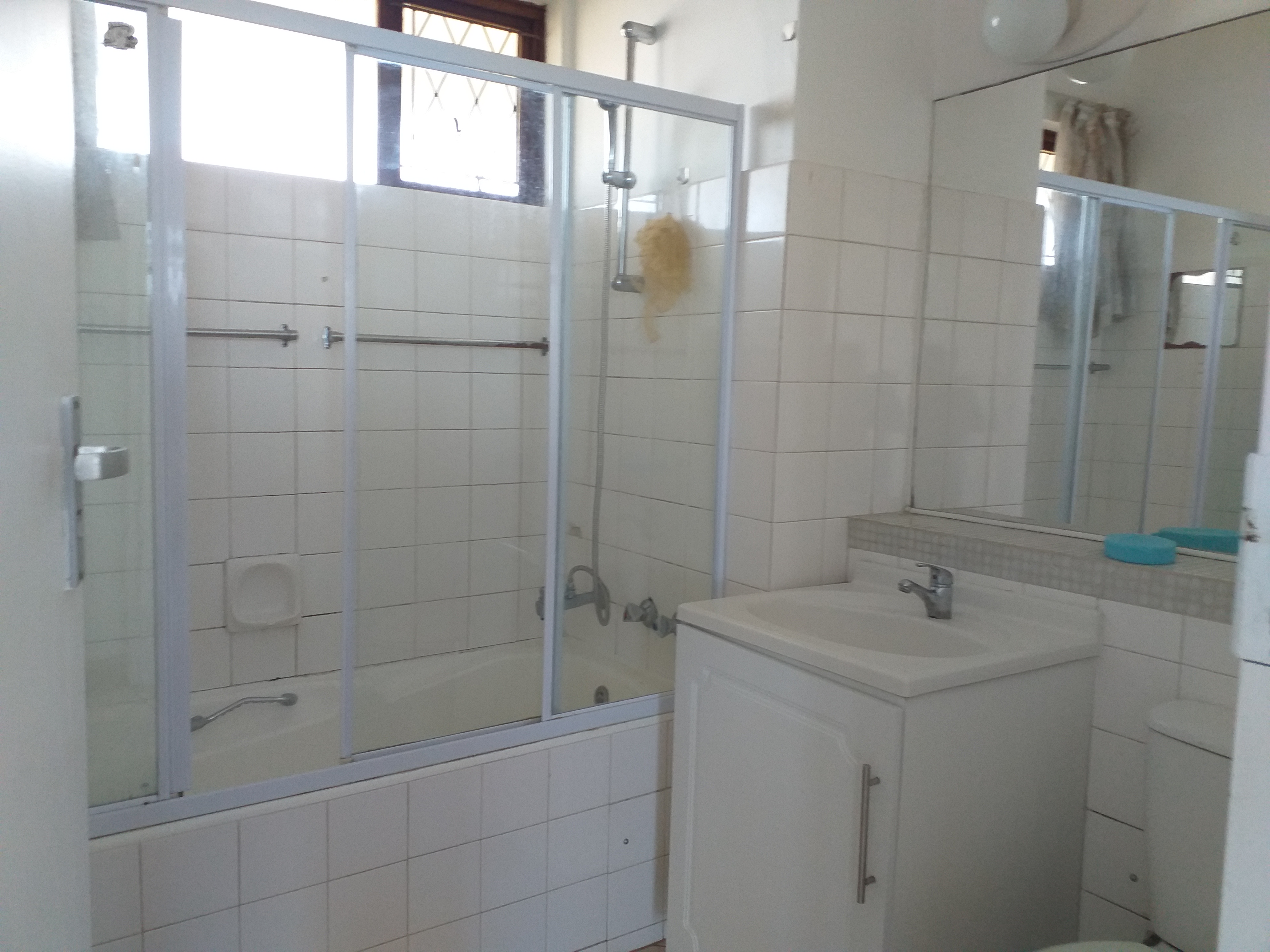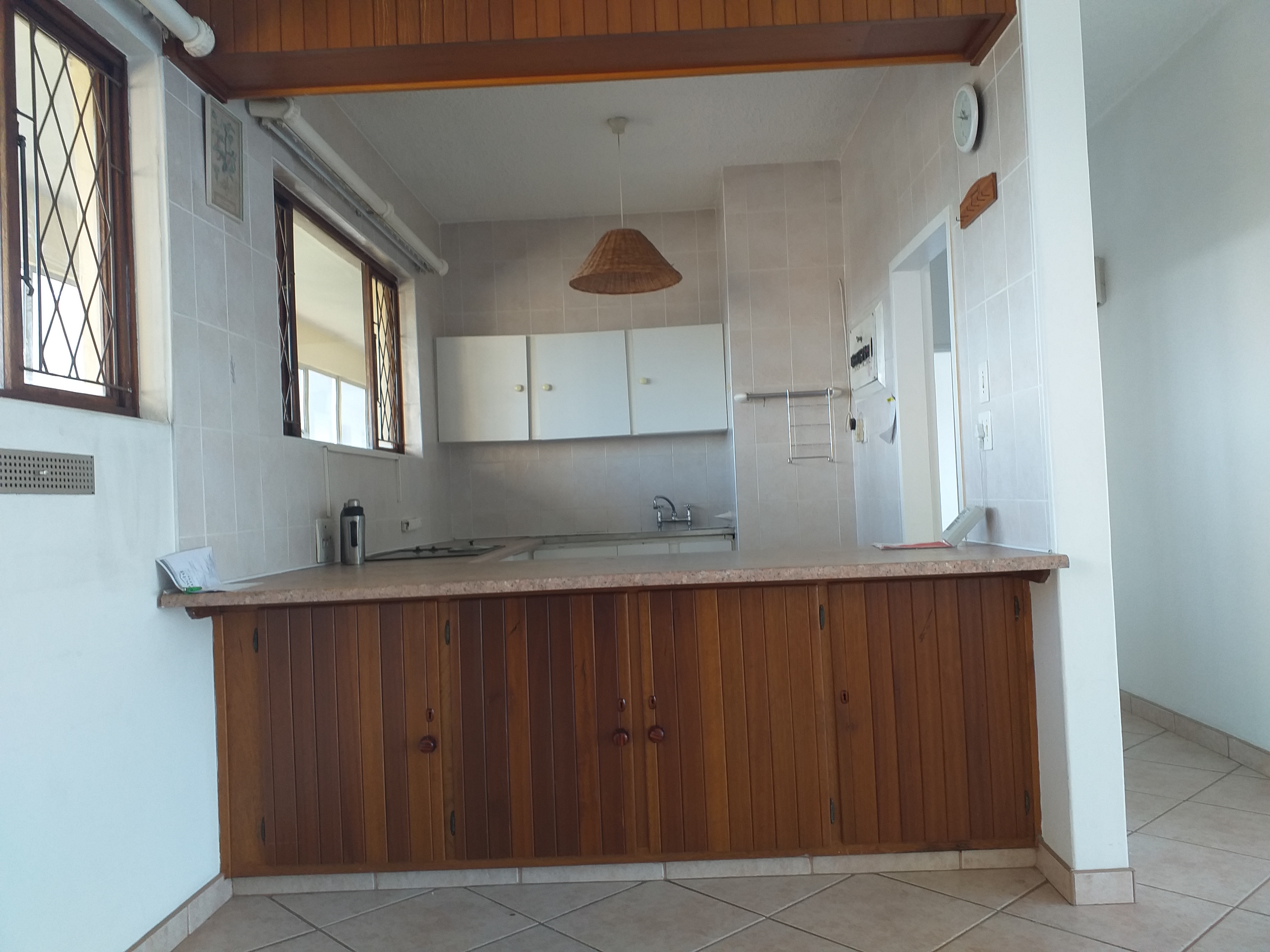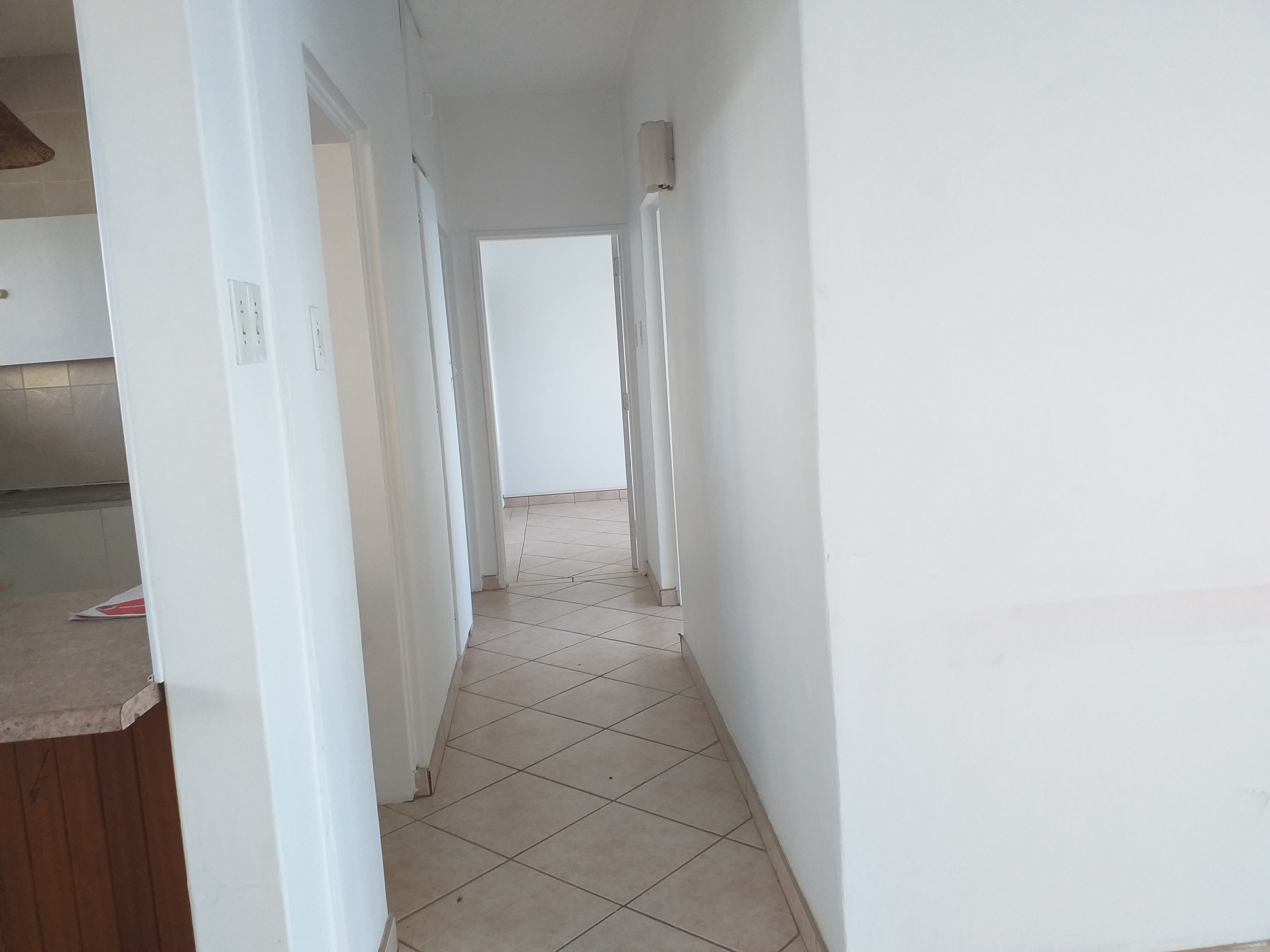 This property features two spacious bedrooms with built-in cupboards, as well as two bathrooms—one with a bath and the other with a separate shower. The open-plan design includes a generous lounge, dining area, and kitchen, complete with cupboard space and a stove.