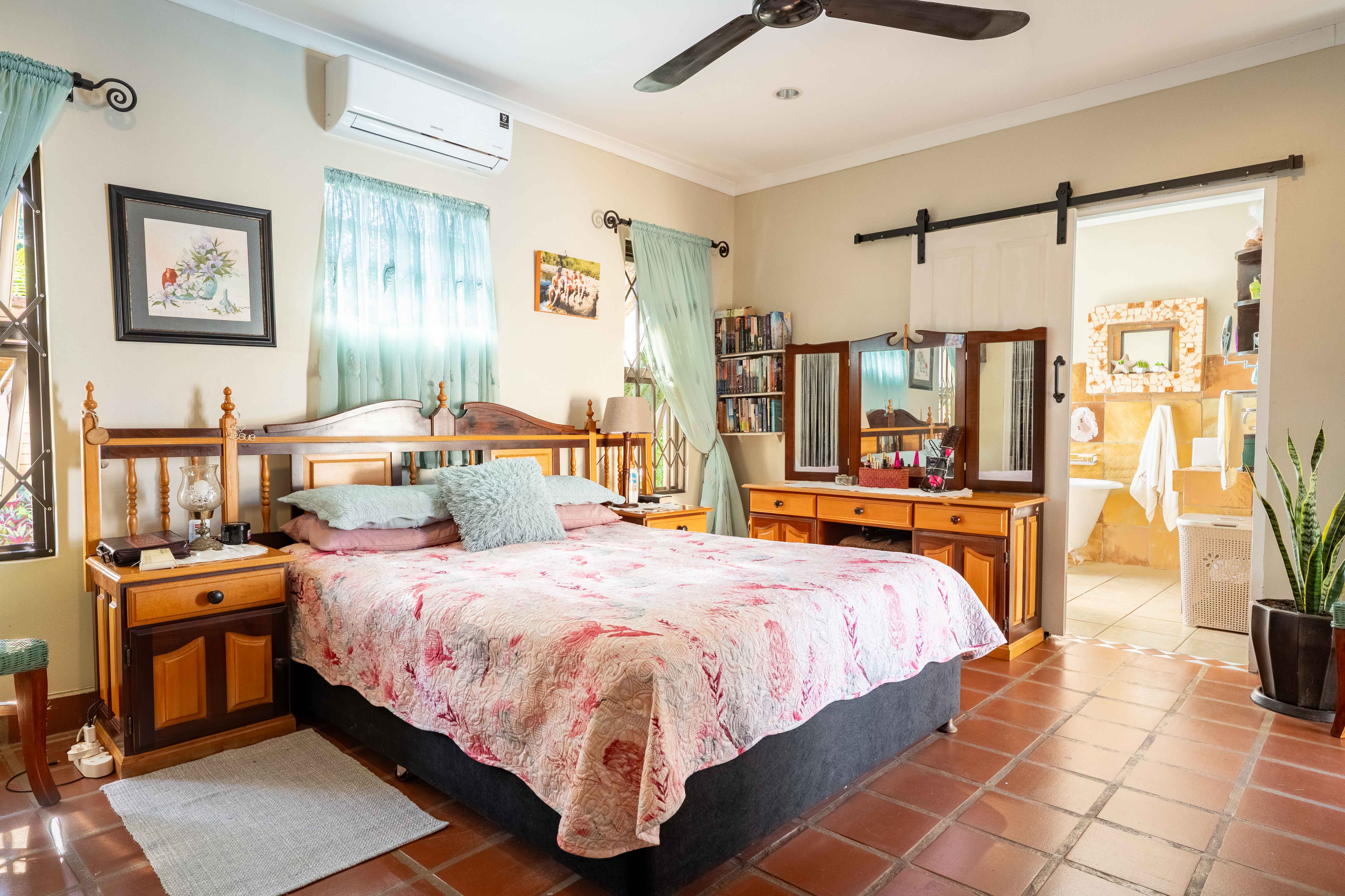 The generously sized main bedroom is conveniently located downstairs and includes direct access to the pool area, a walk-in closet, and a serene en-suite bathroom with a nature-inspired shower.