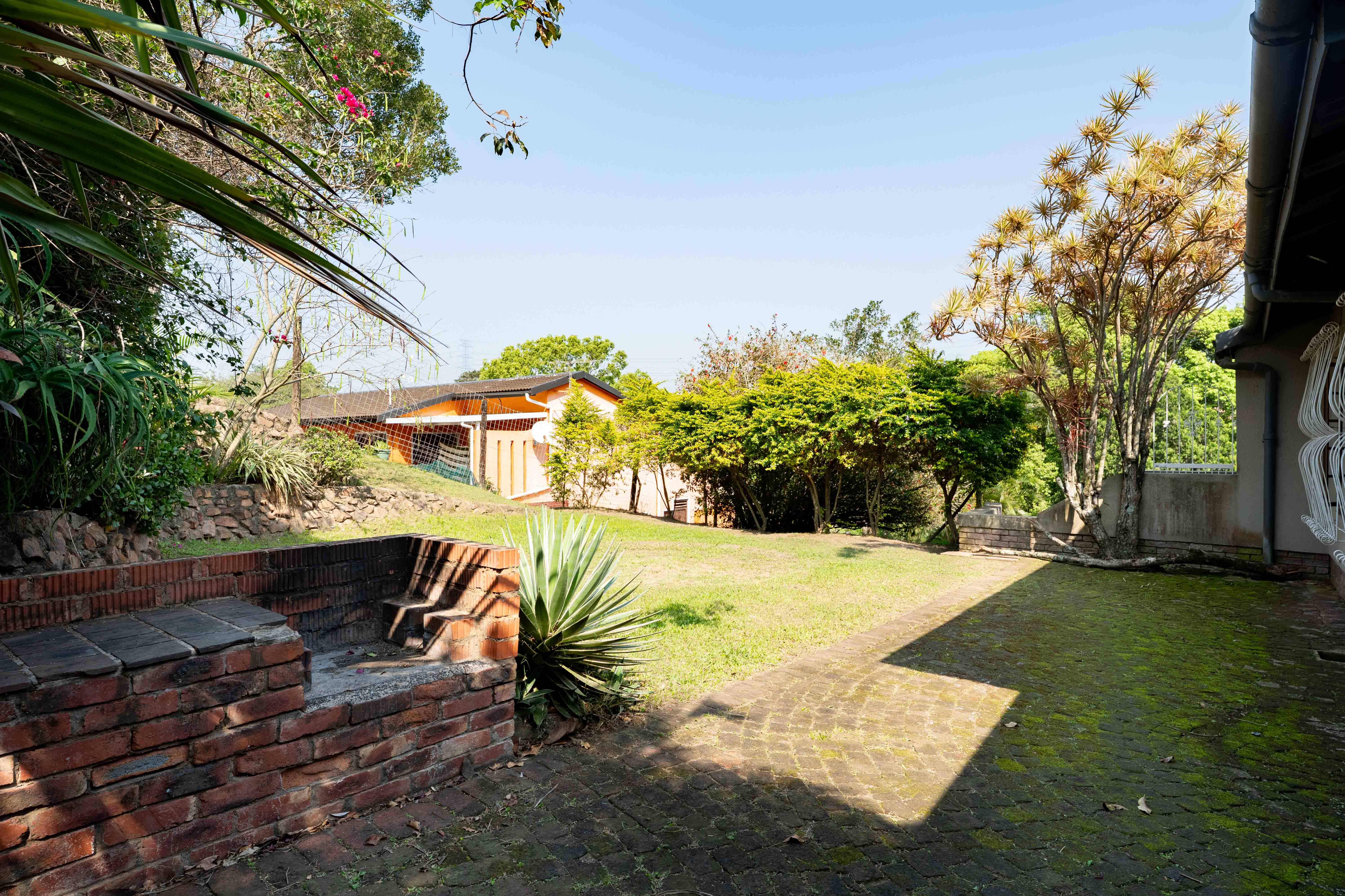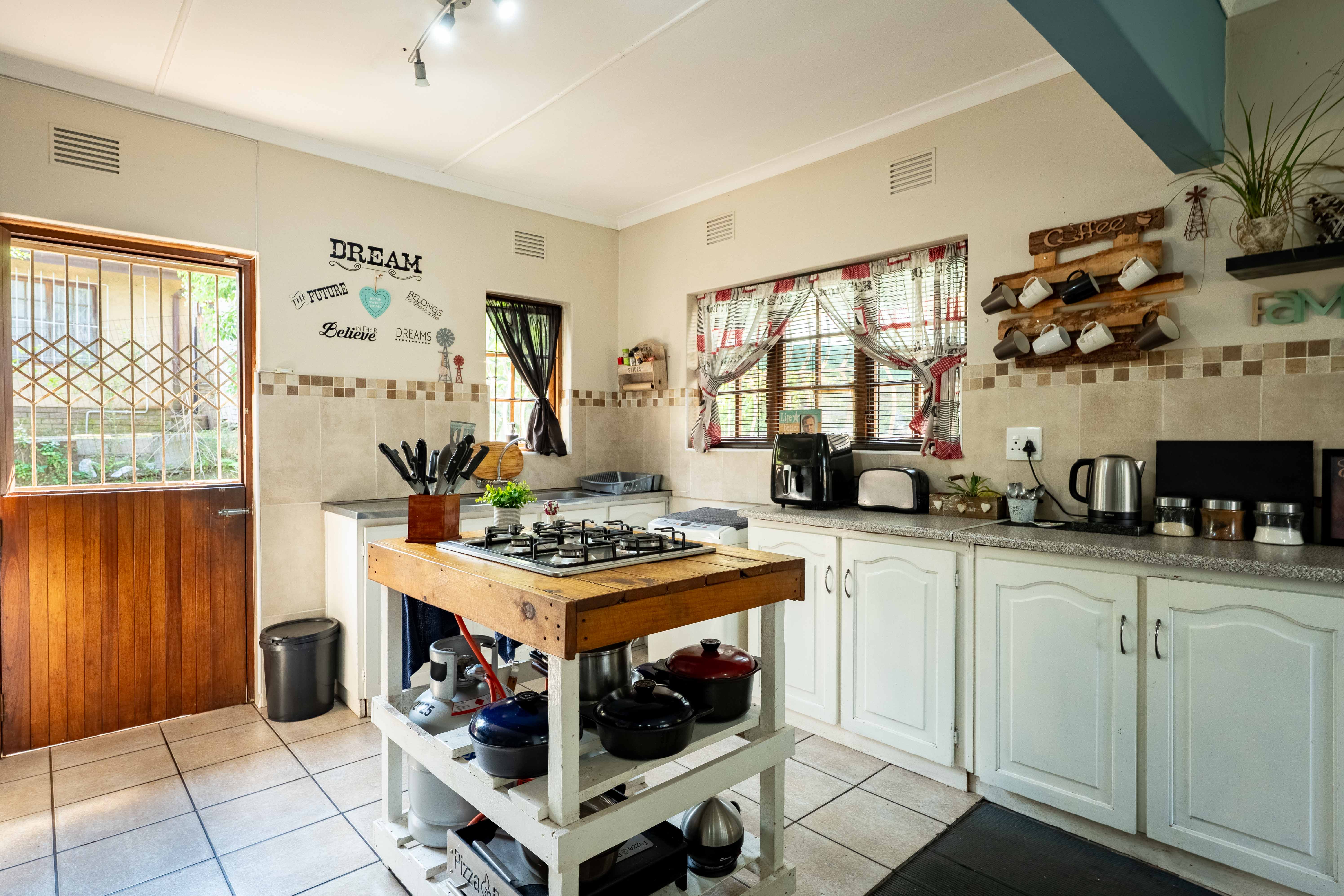 Step into a warm, open-plan living area where the lounge, dining space, and fully fitted kitchen flow seamlessly together – perfect for modern family living. The dining area opens directly onto an outdoor entertainment zone complete with a built-in braai – ideal for weekend gatherings and summer evenings.