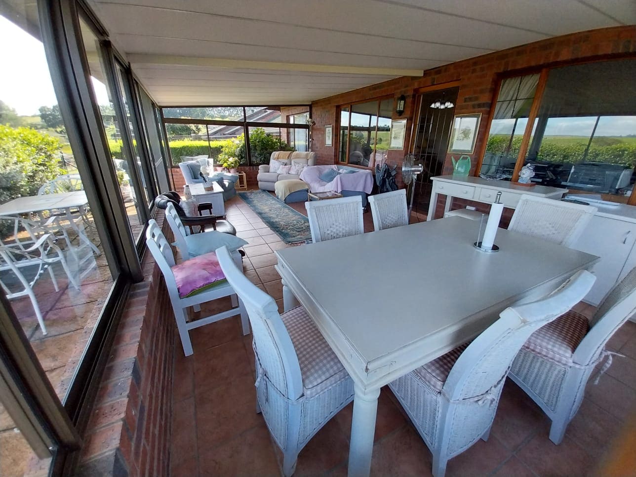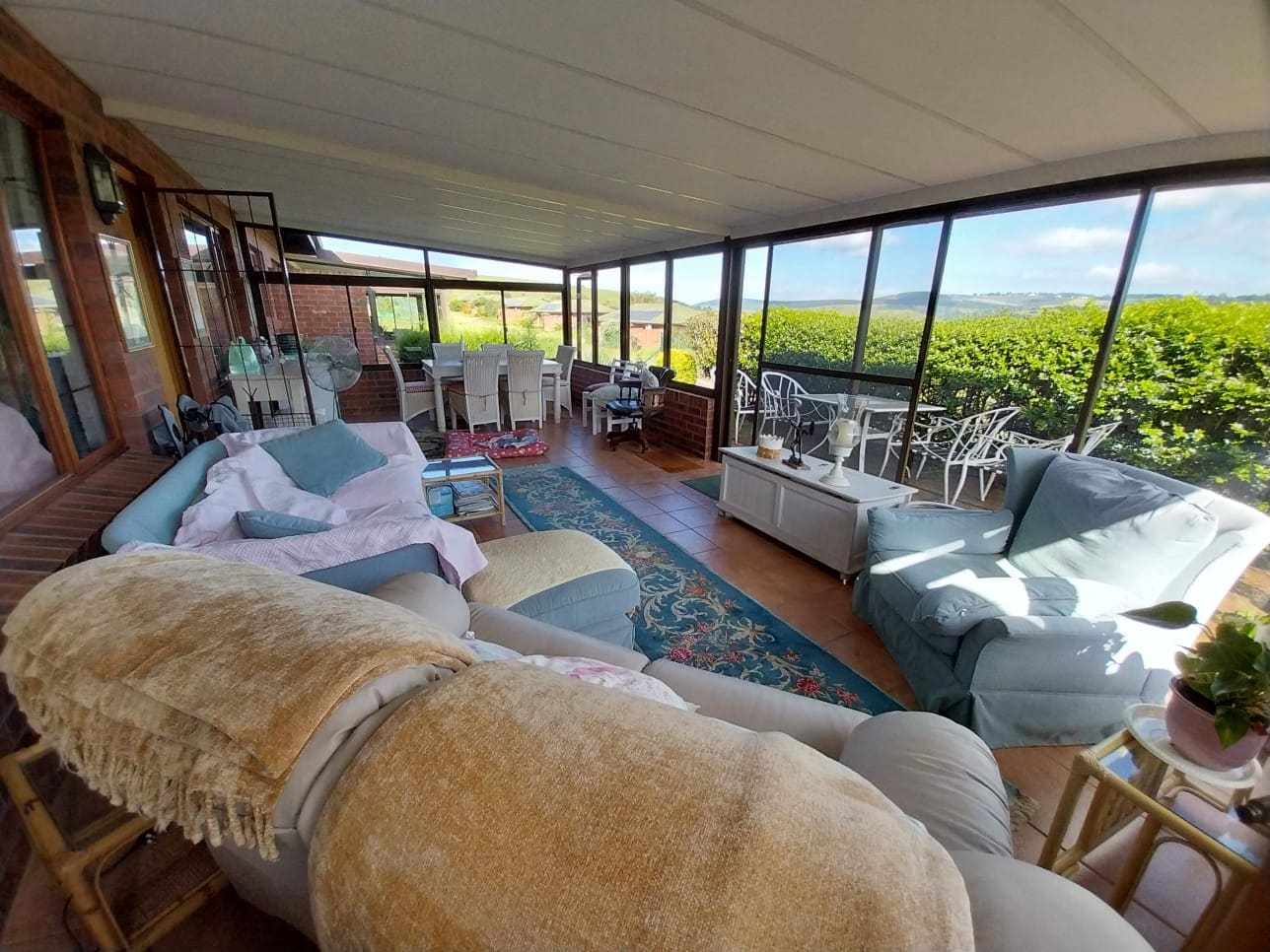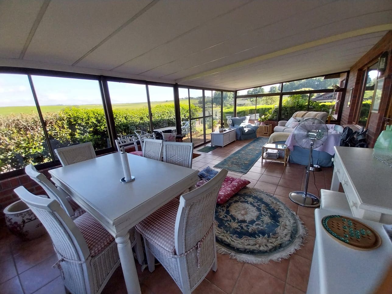 The living area is open-plan and leads out onto a huge, glassed-in front patio which offers spectacular views of the surrounding countryside.