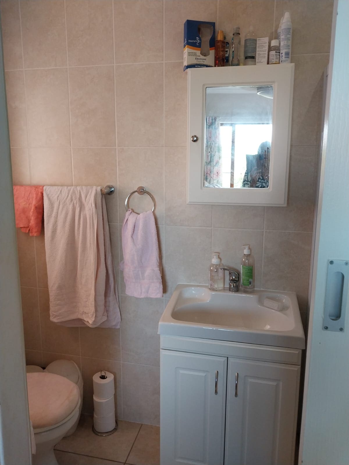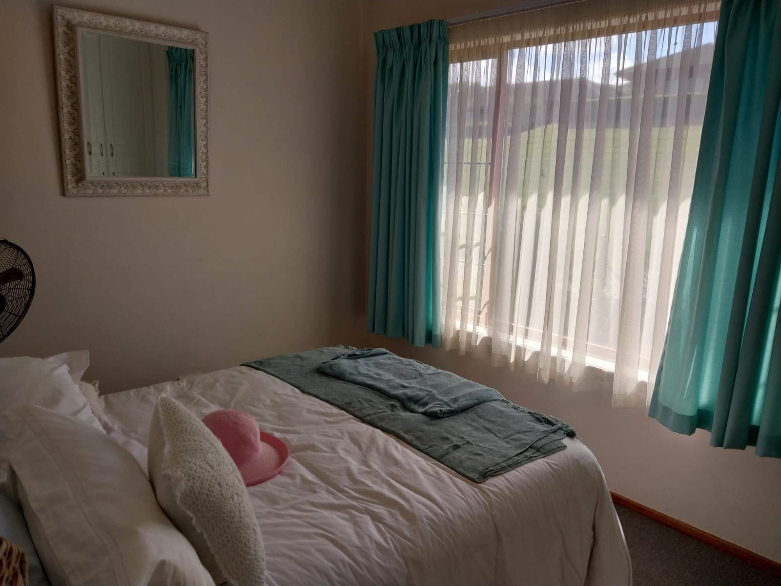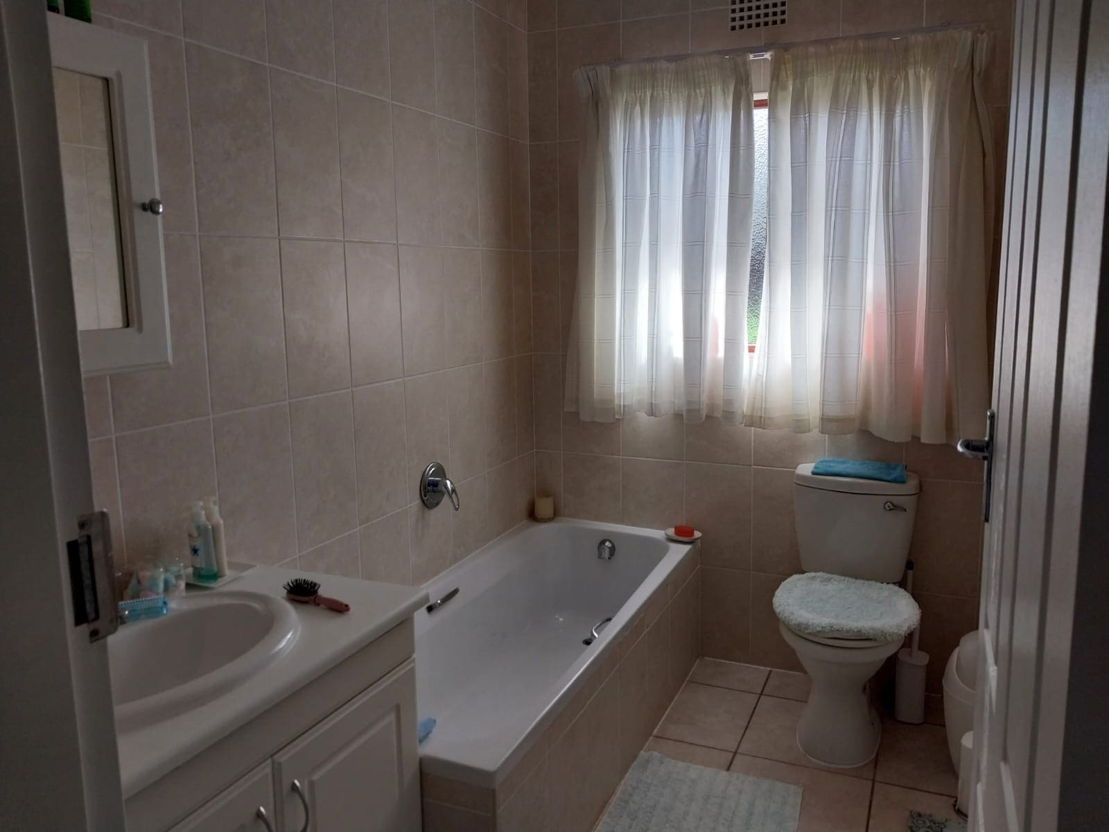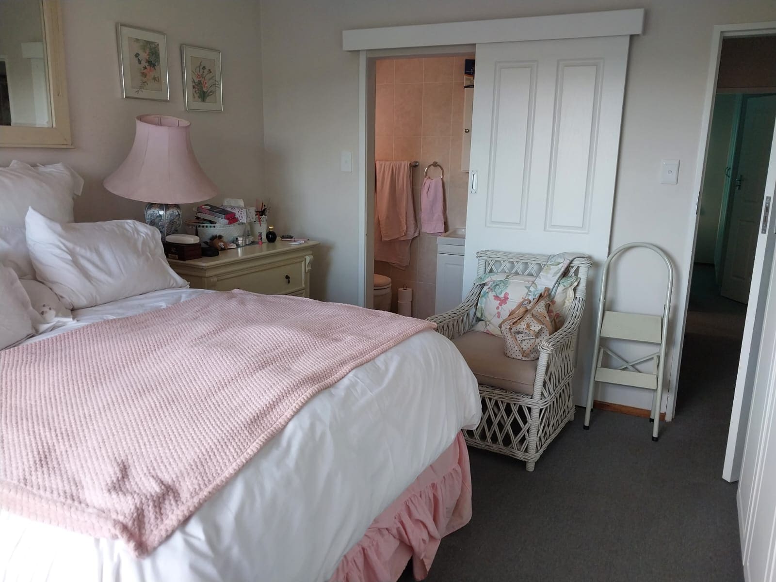 The main bedroom has plenty of built-in cupboards plus an en-suite bathroom with a shower, basin and toilet. The guest bedroom also has built-in cupboards and is served by a second bathroom which has a bath, basin and toilet.