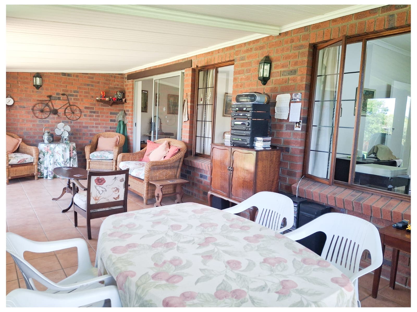 A fully enclosed veranda adds additional living space that can be used year-round and overlooks a large grassed area in front.
