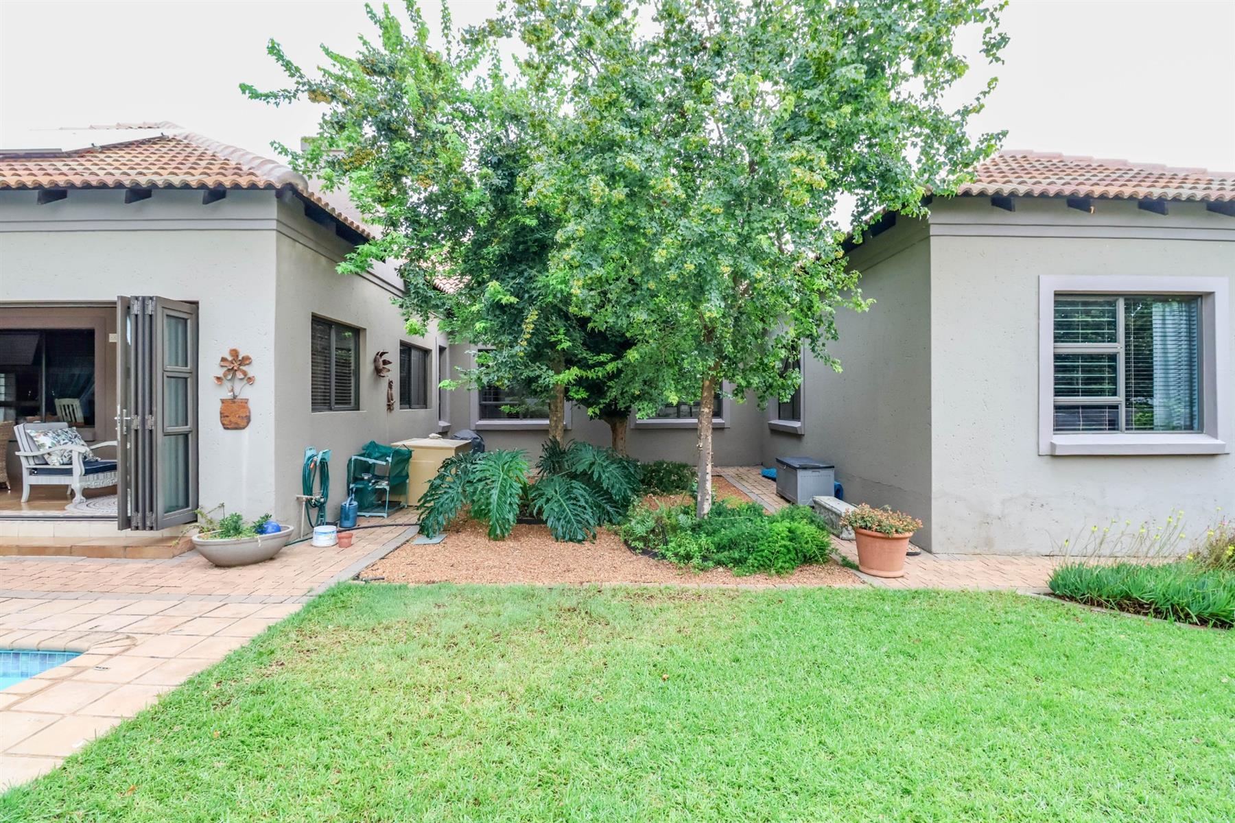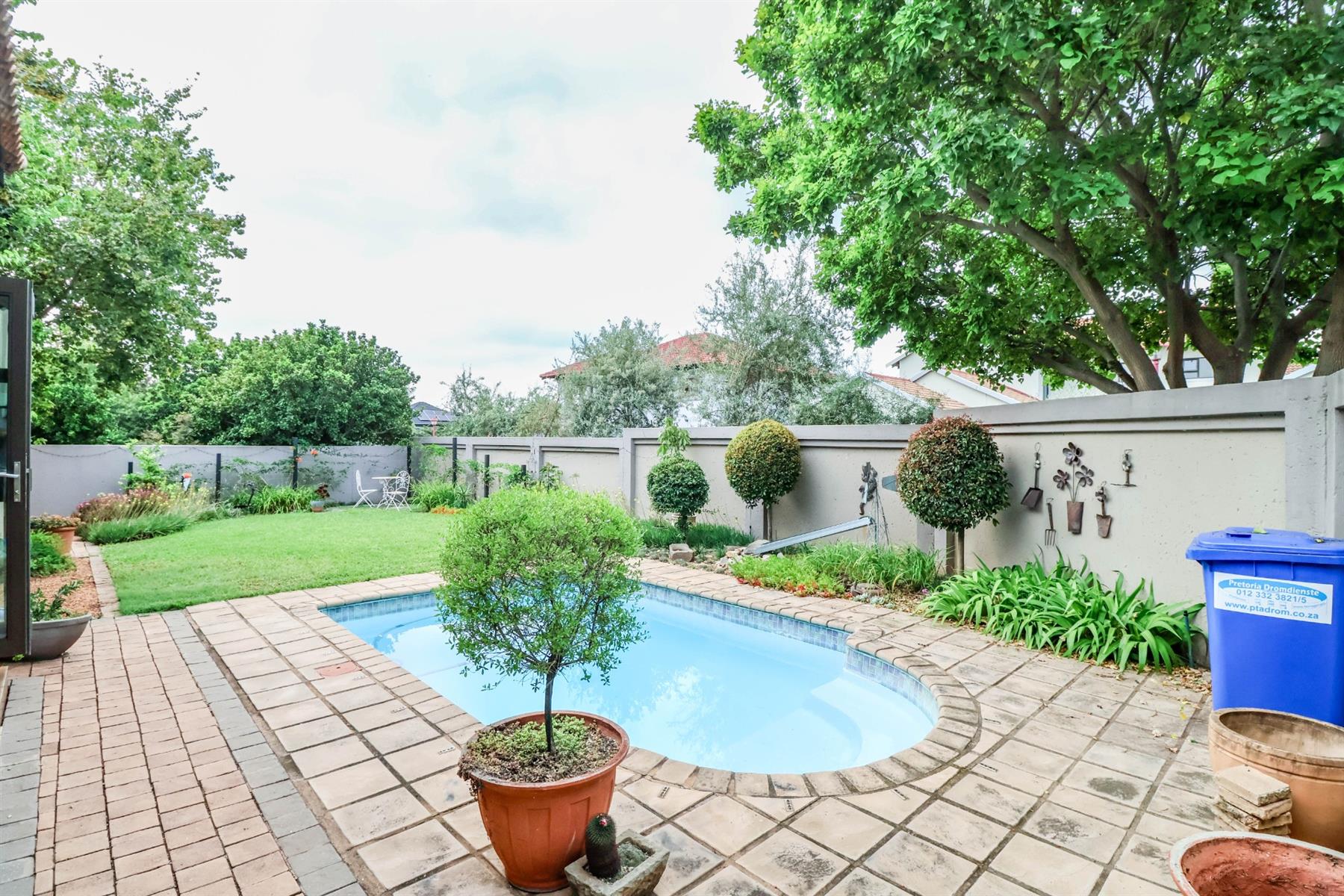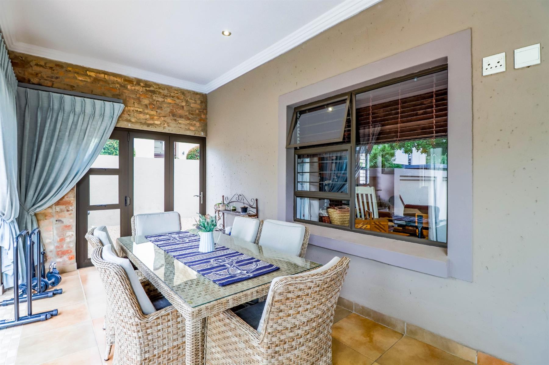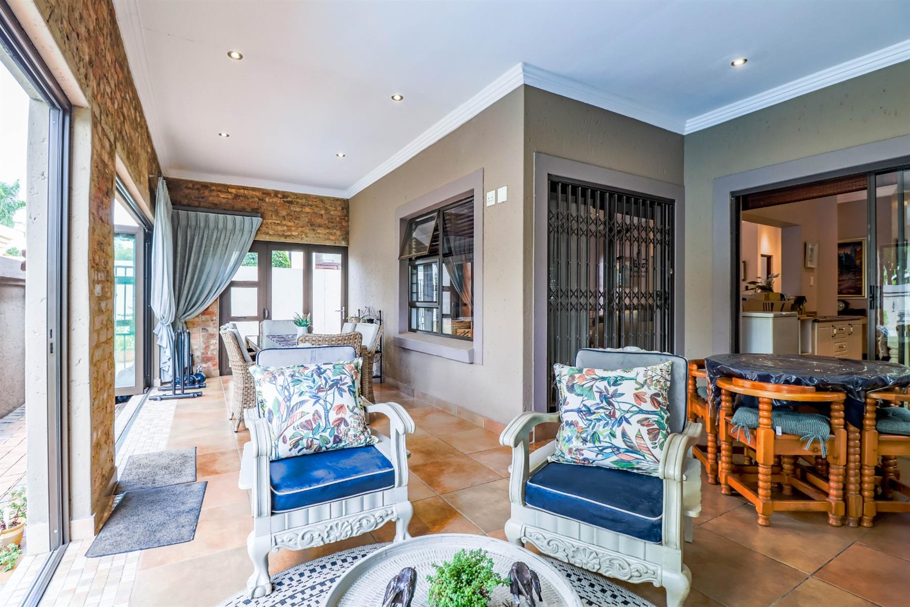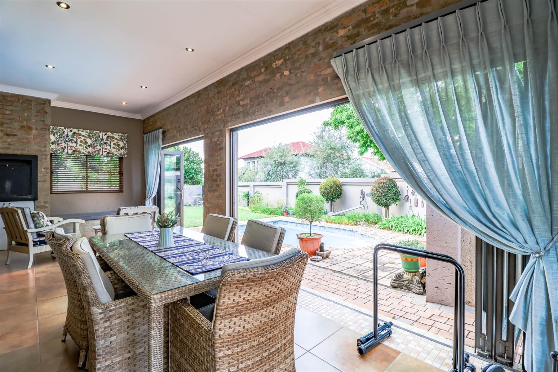 The enclosed entertainment area includes a built-in braai and opens onto a sparkling pool and a beautifully maintained garden — perfect for entertaining family and friends.
