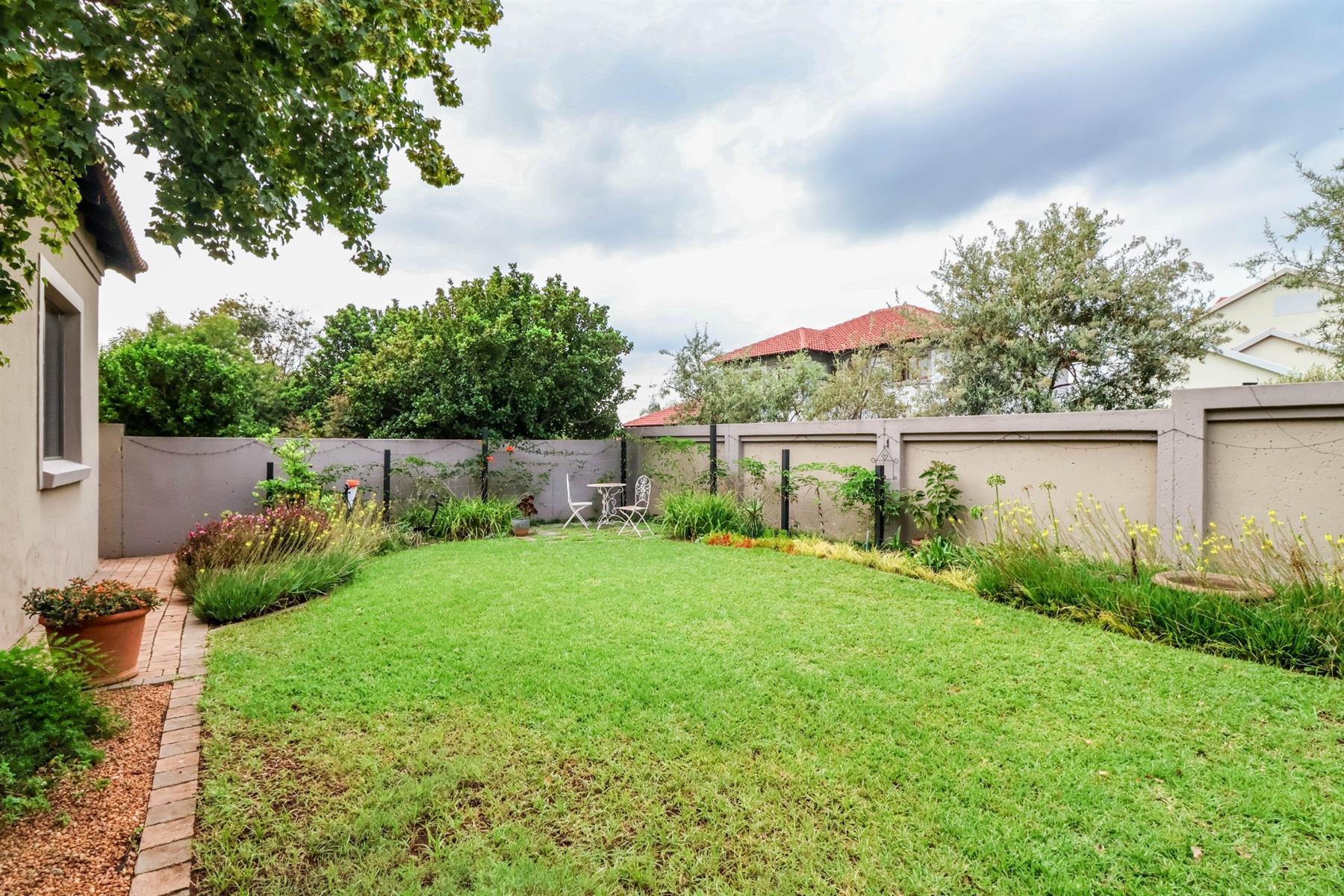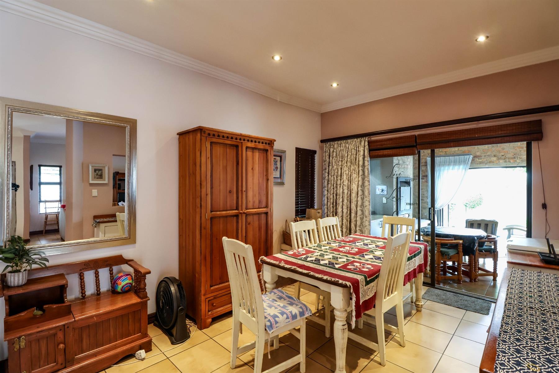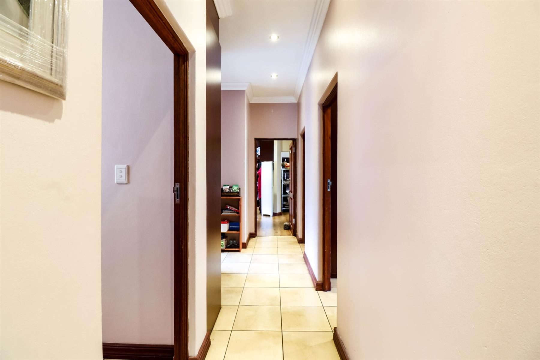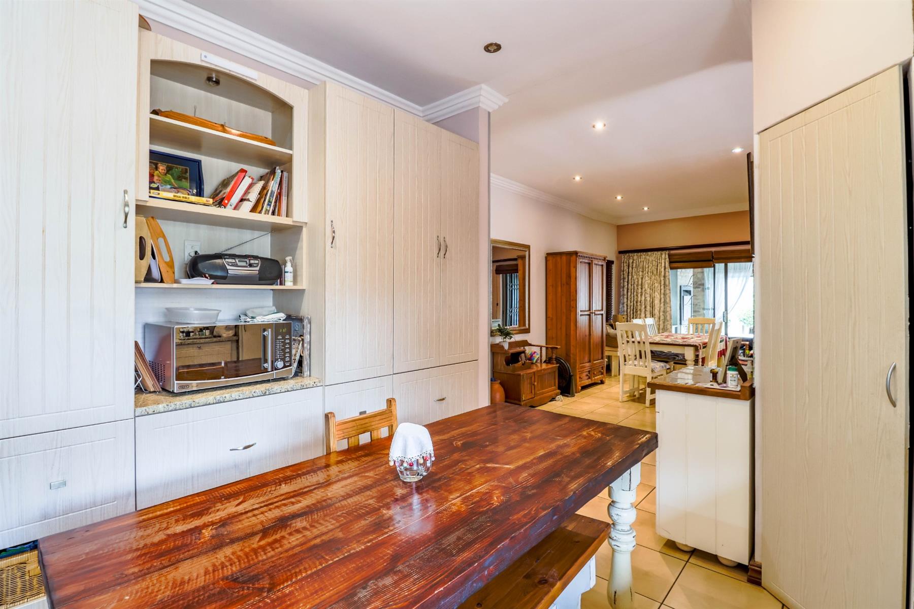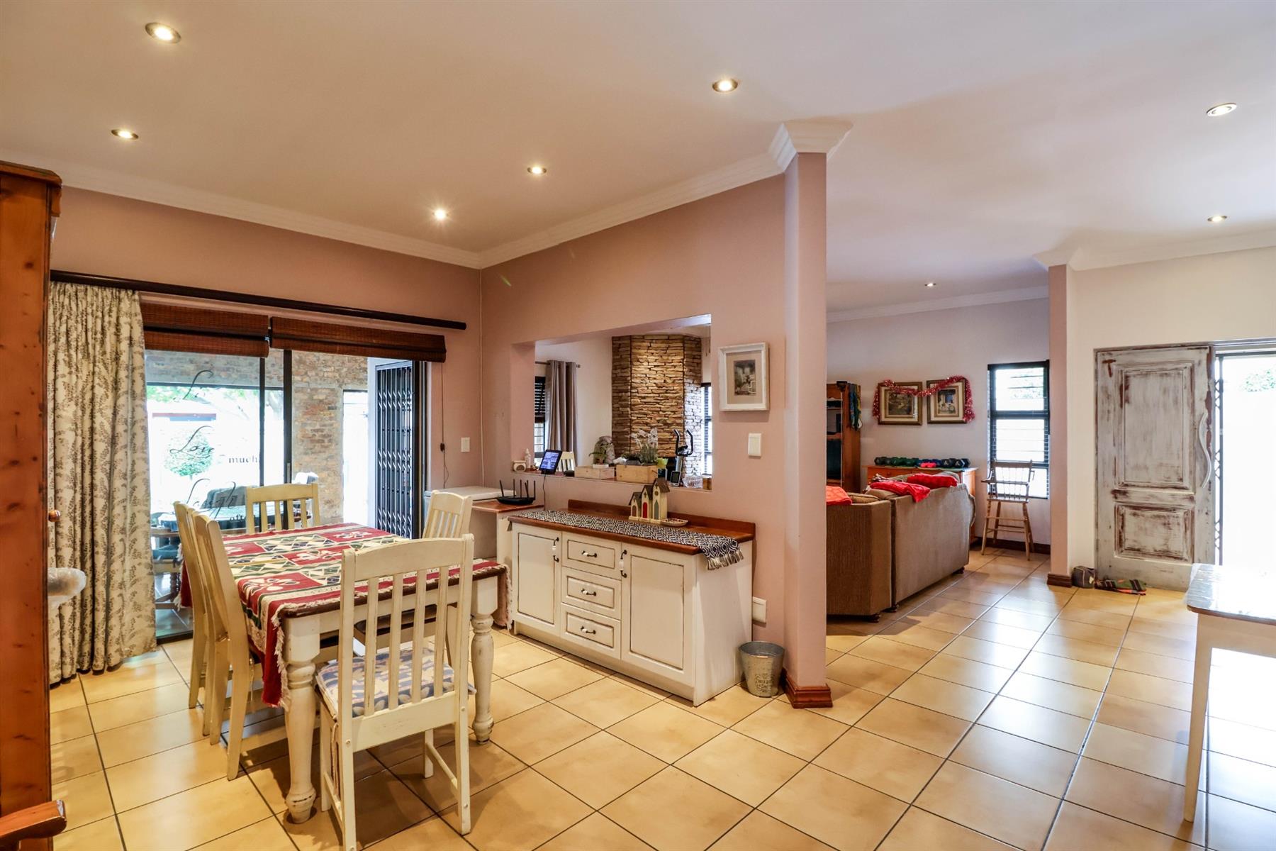 The enclosed entertainment area includes a built-in braai and opens onto a sparkling pool and a beautifully maintained garden — perfect for entertaining family and friends.