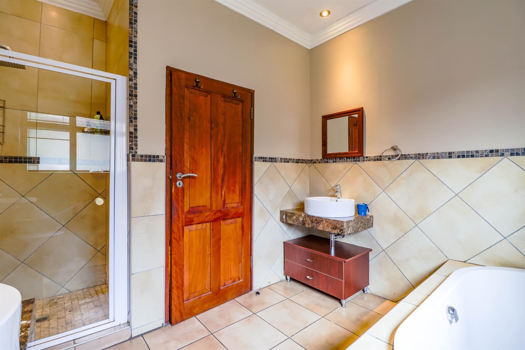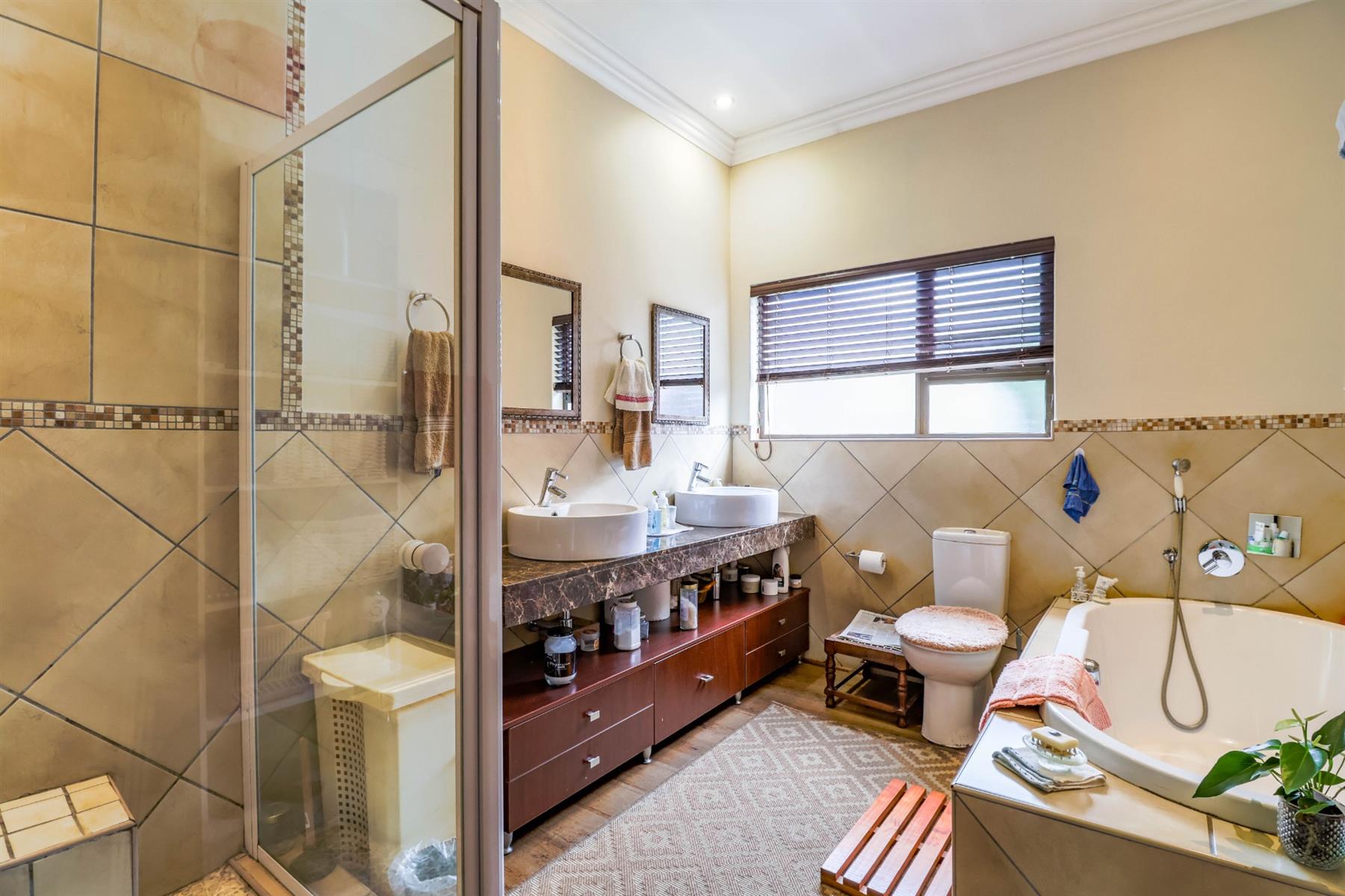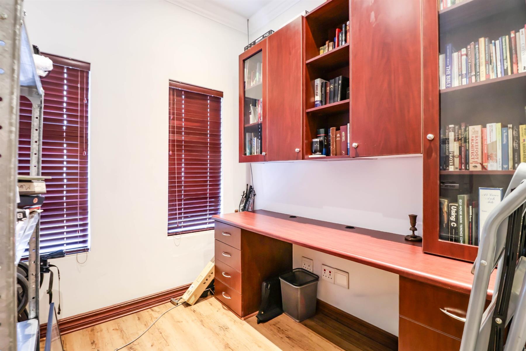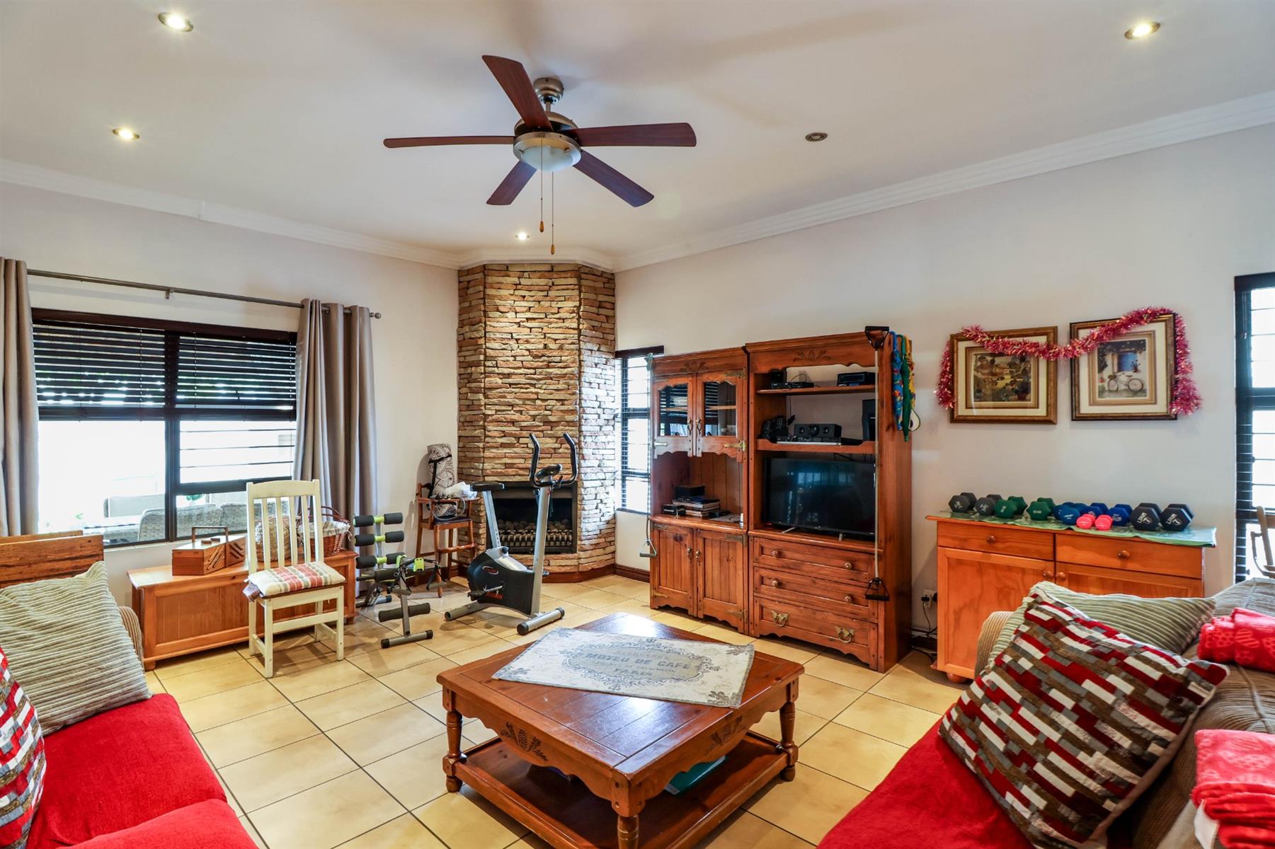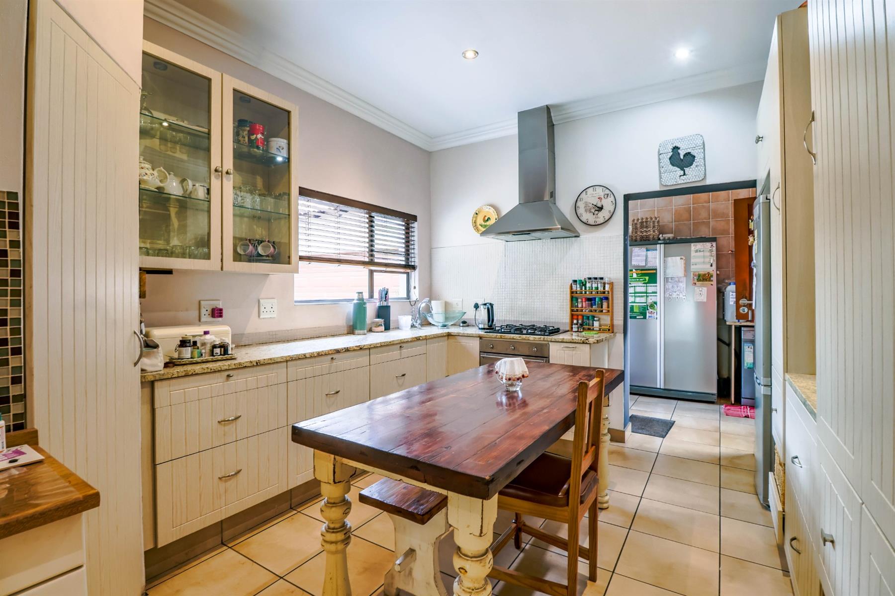 The enclosed entertainment area includes a built-in braai and opens onto a sparkling pool and a beautifully maintained garden — perfect for entertaining family and friends.
