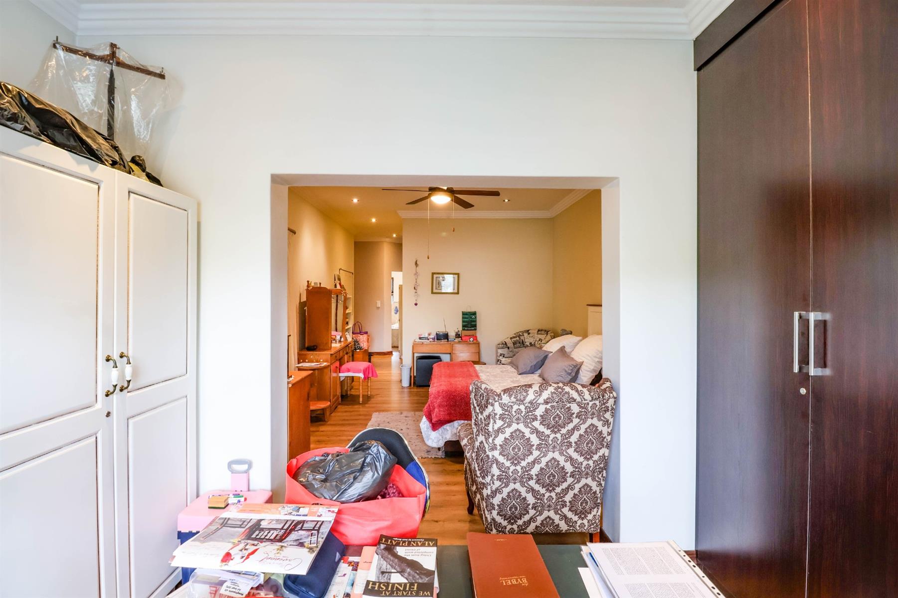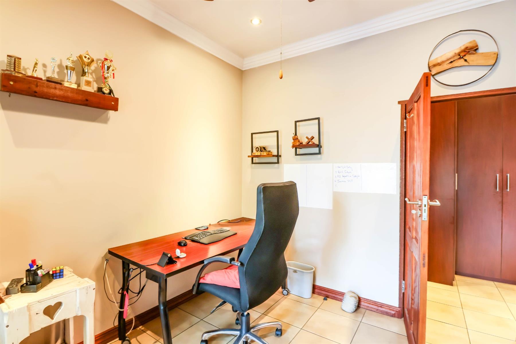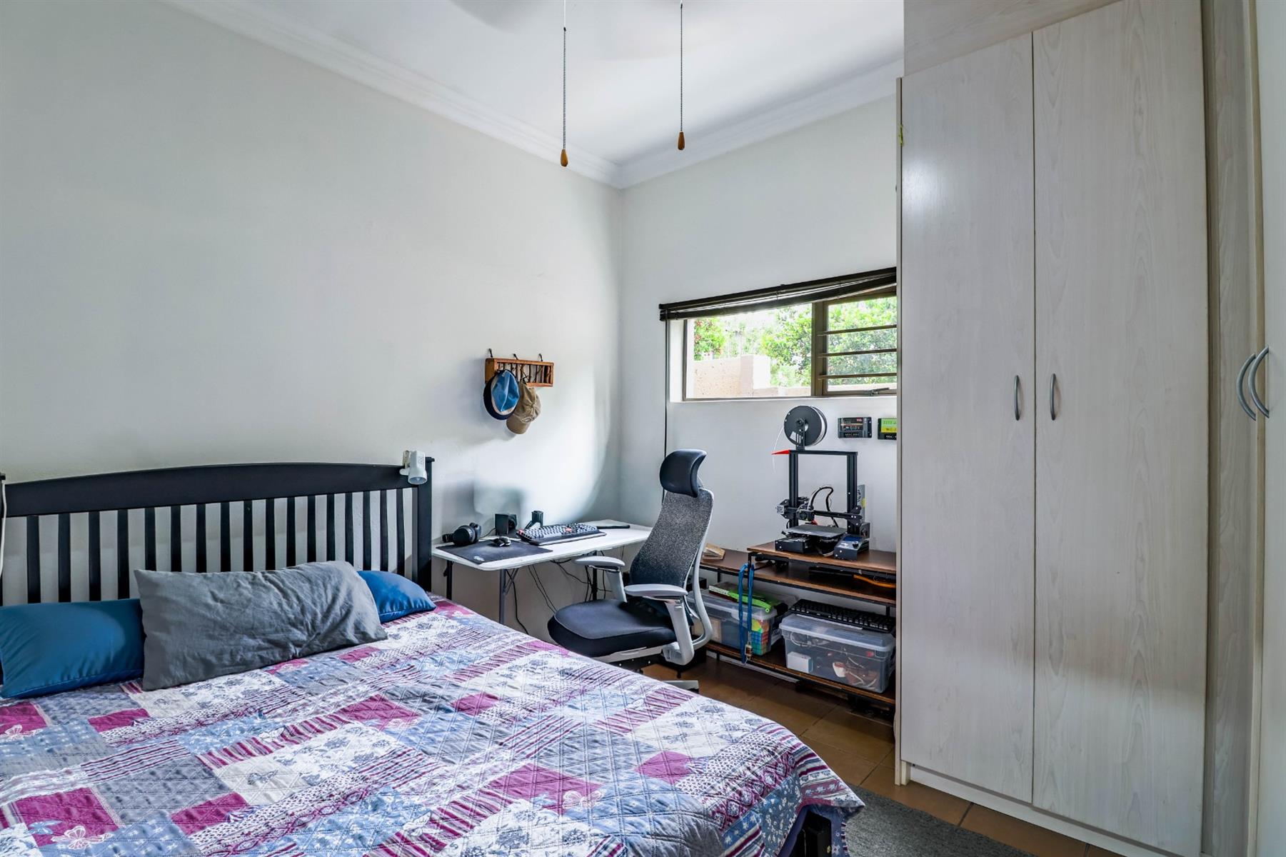 The spacious main bedroom features a walk-in cupboard and a full en-suite bathroom, as well as a private study area and additional space ideal for hobbies or relaxation.