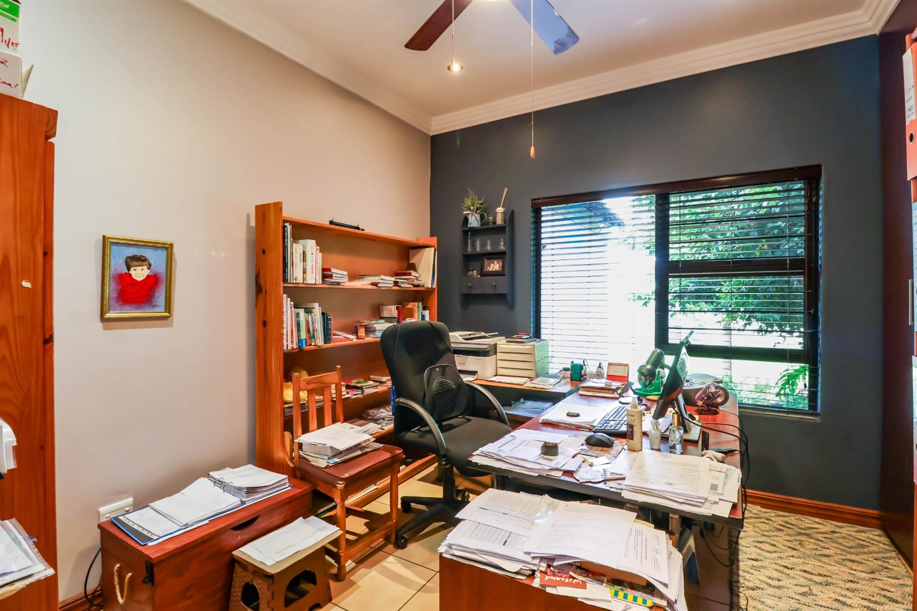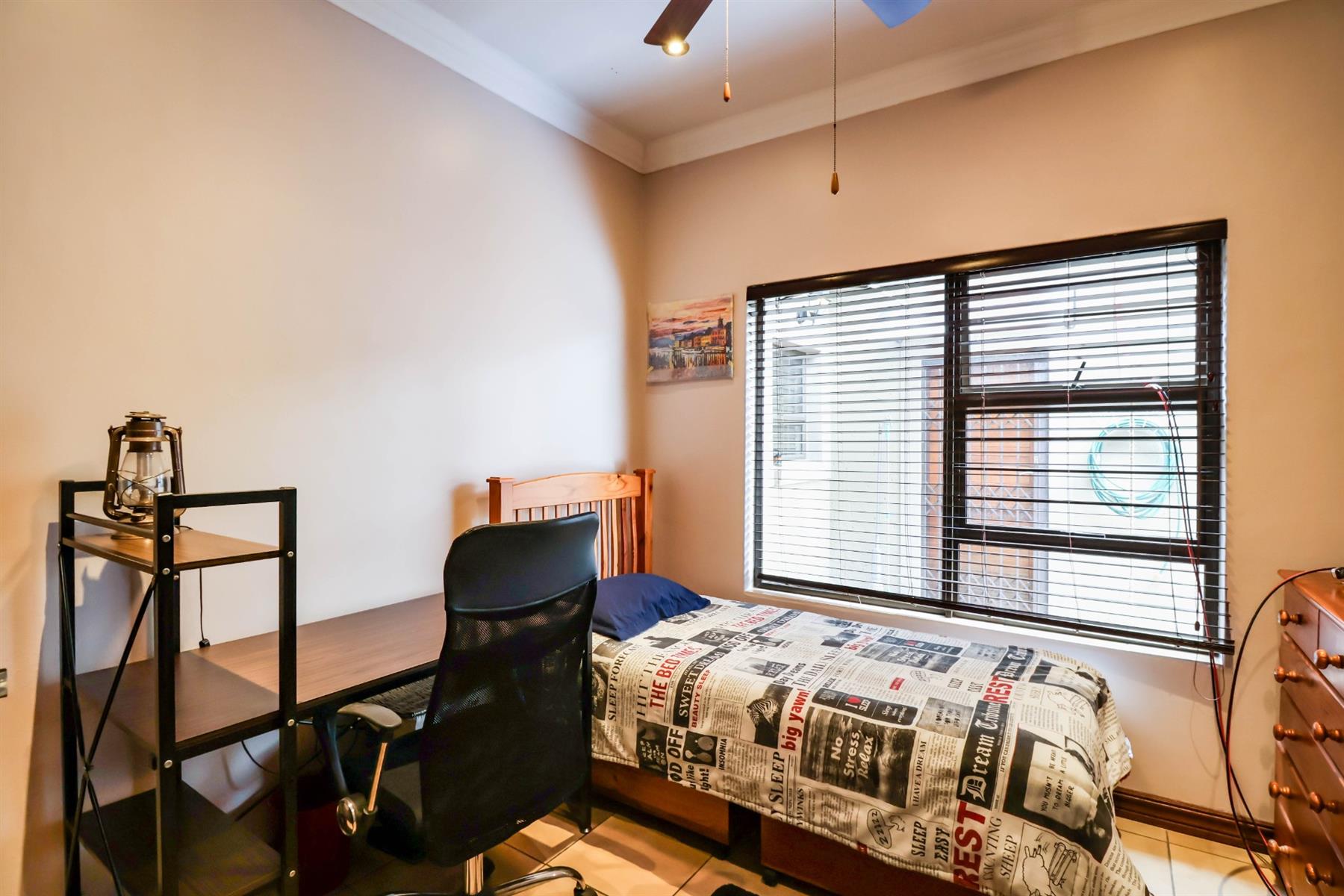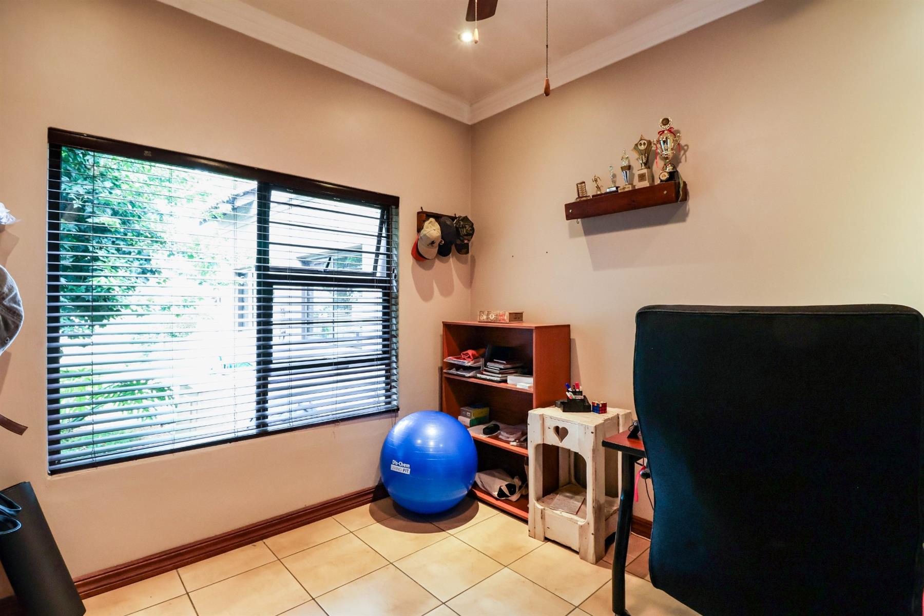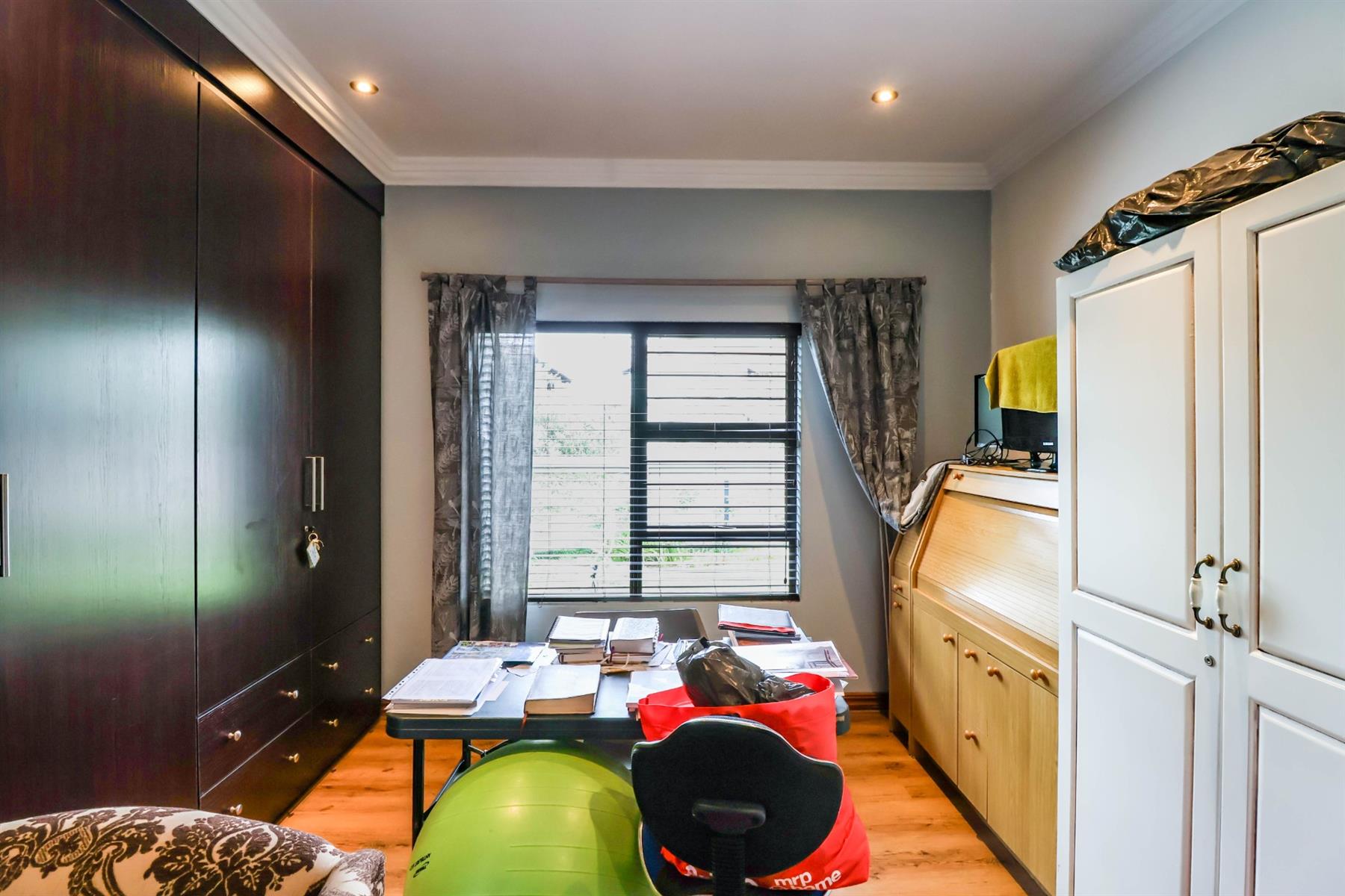 The spacious main bedroom features a walk-in cupboard and a full en-suite bathroom, as well as a private study area and additional space ideal for hobbies or relaxation.