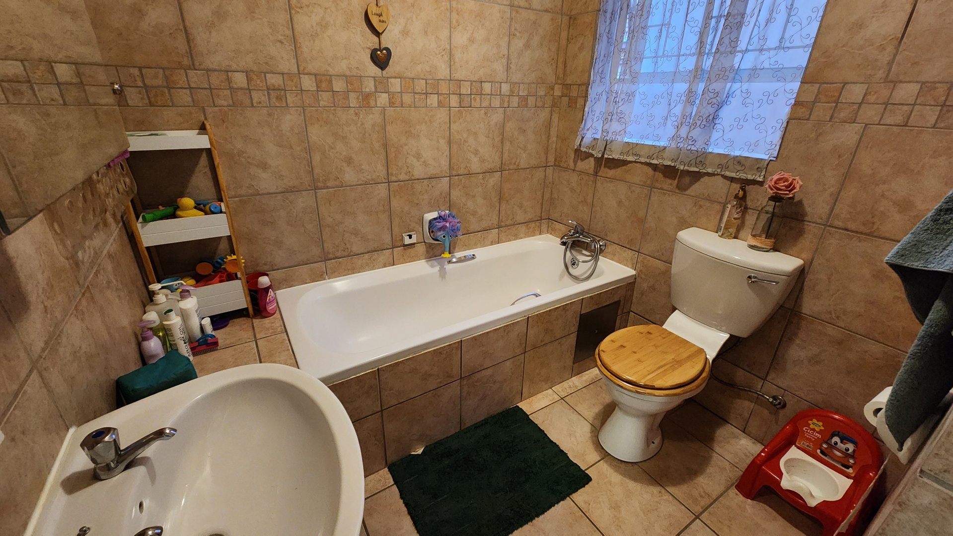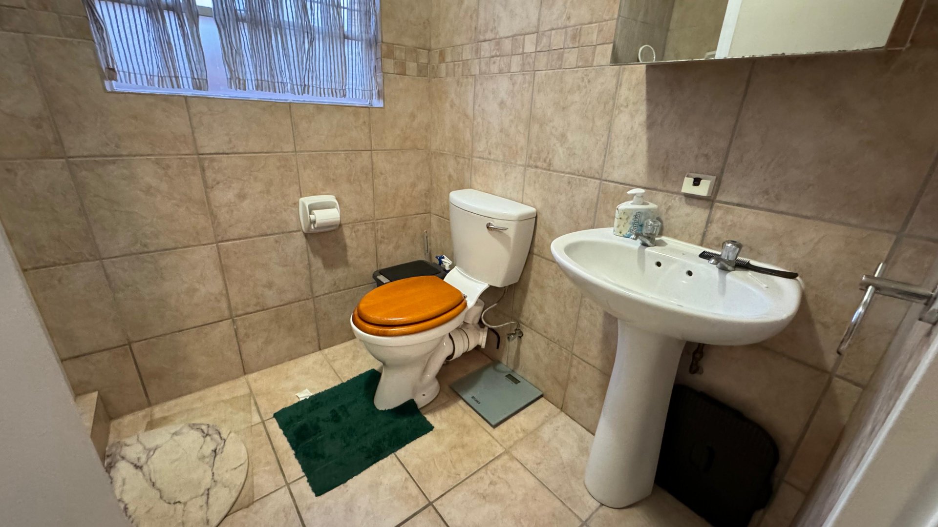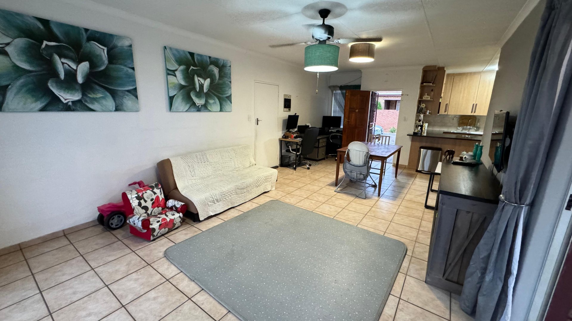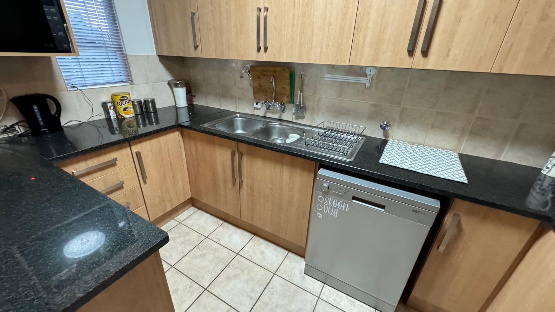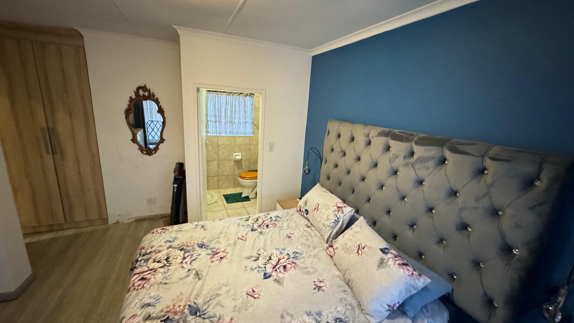 Each room is upgraded with modern tiled flooring, enhancing both the beauty and ease of maintenance. The main bedroom is a generously sized retreat with built-in cupboards and a chic en-suite bathroom, which includes a spacious, fully-tiled shower. The versatile second bedroom is ideal as a guest room, child’s room, or office.
