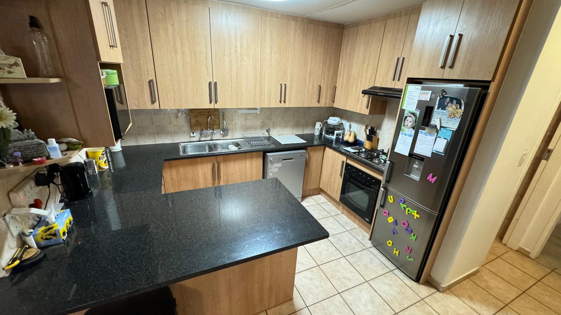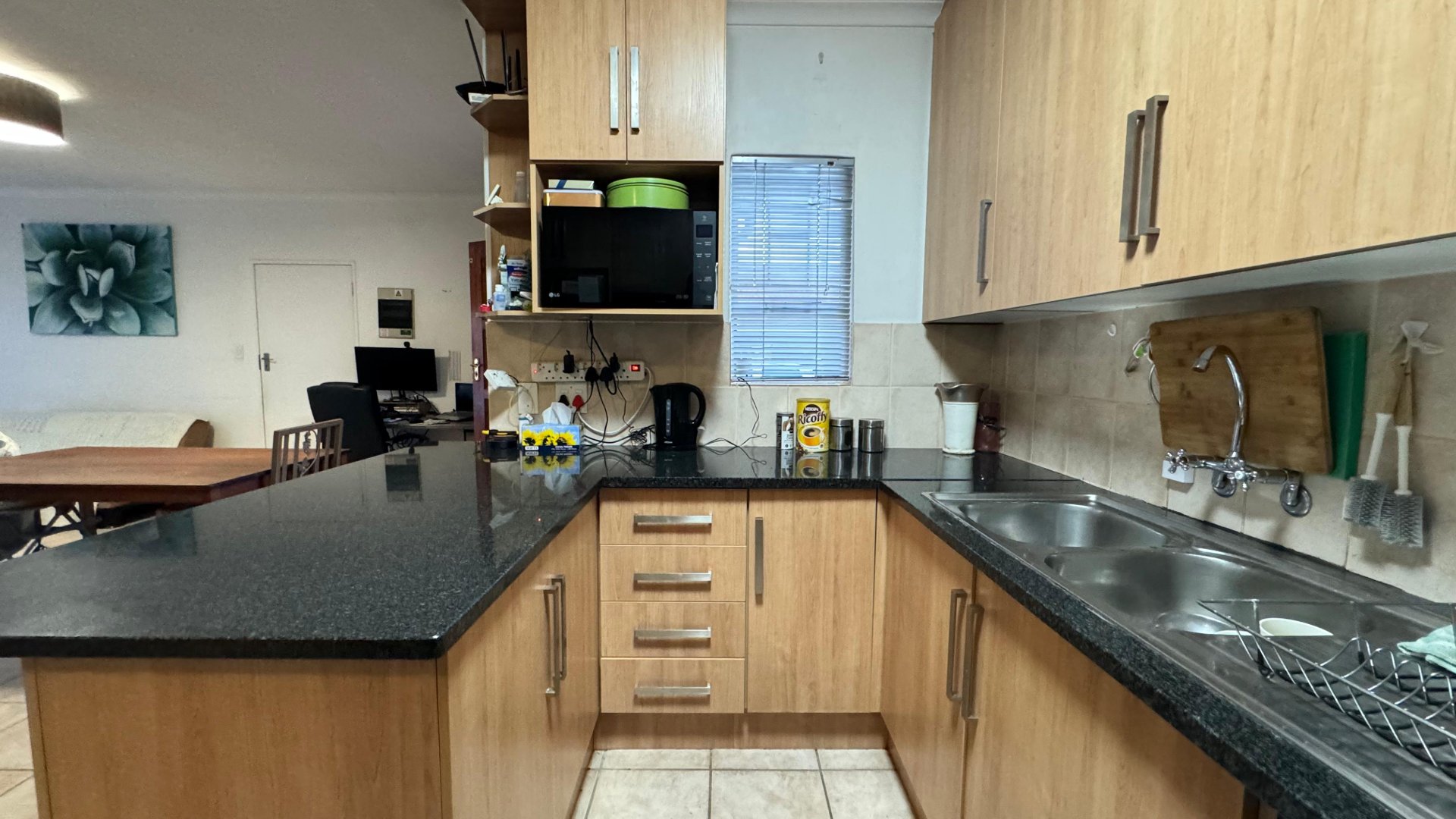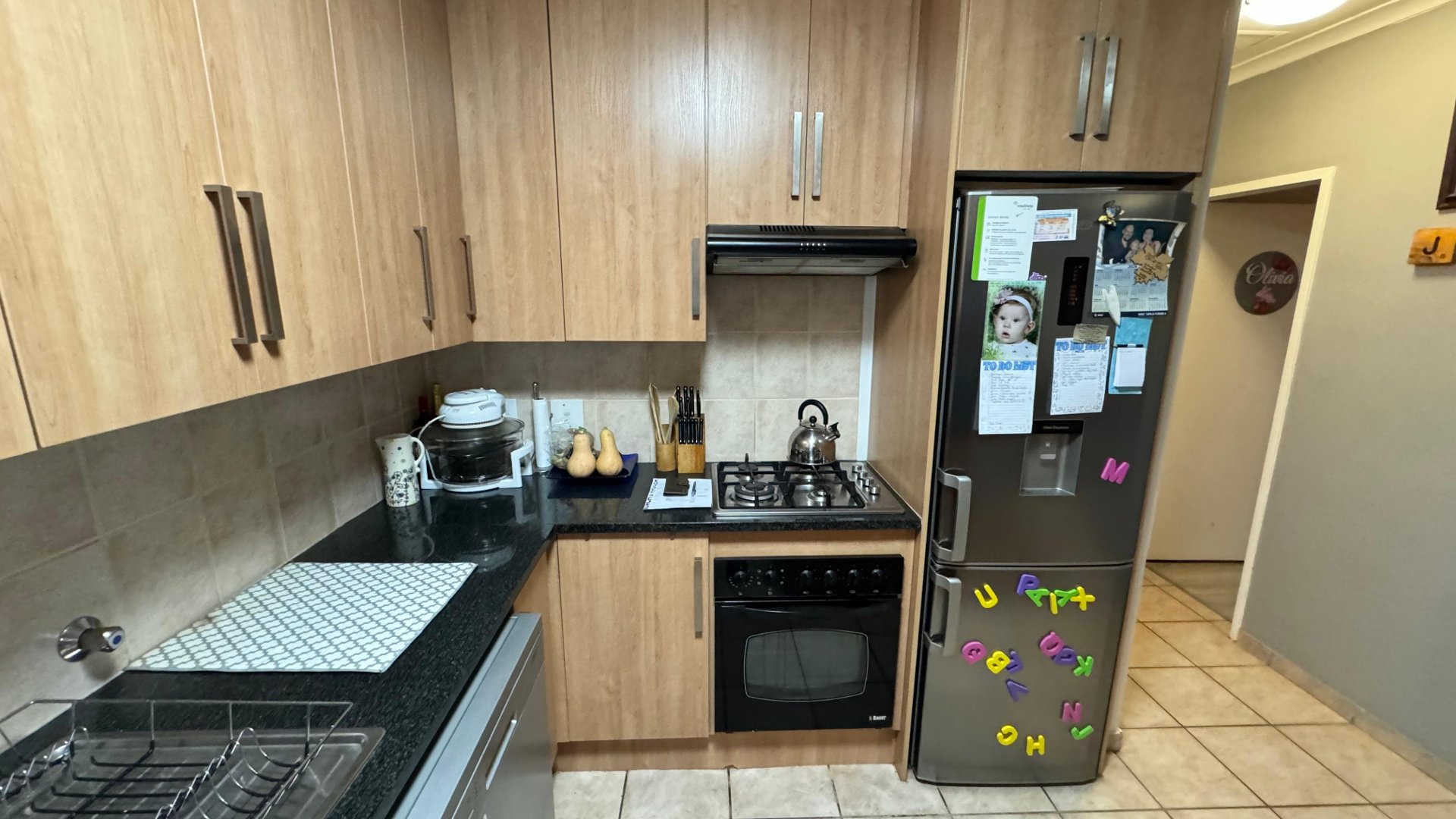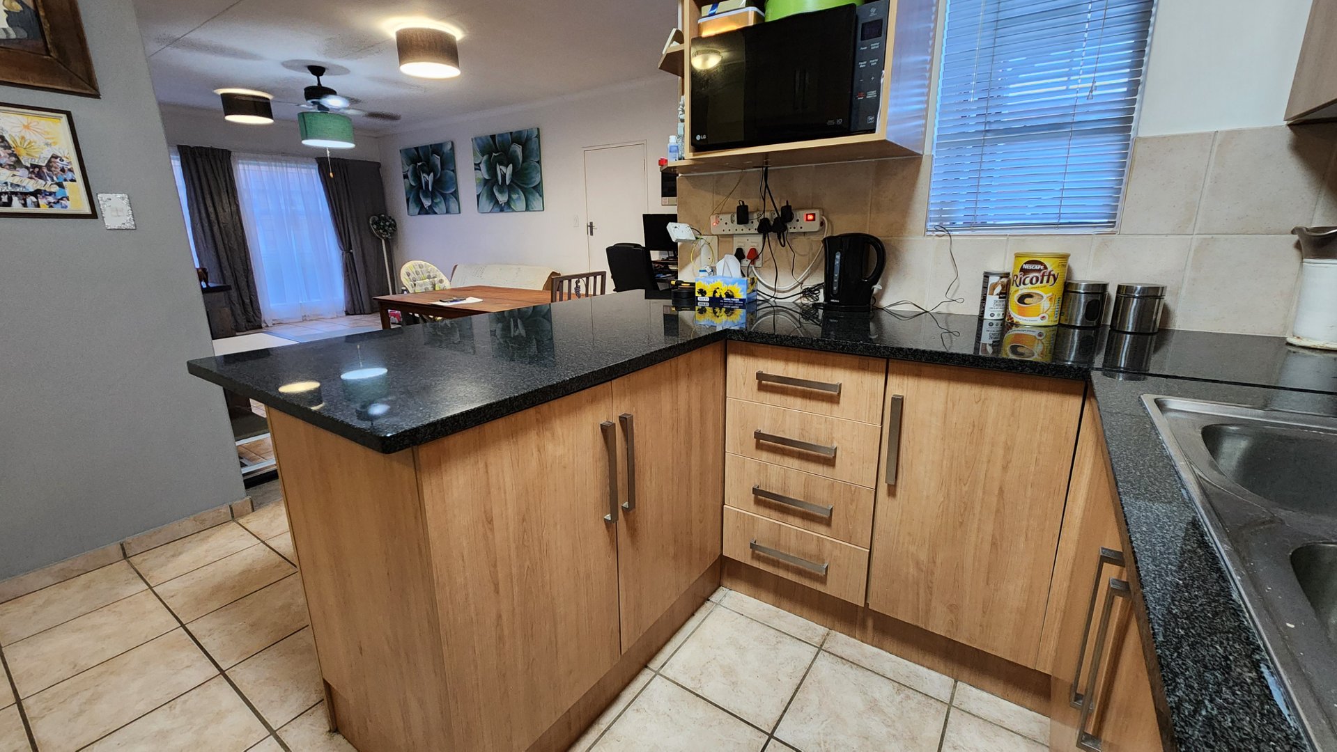 Step inside to a welcoming open-plan living and dining area that flows effortlessly into the stylish kitchen—ideal for both relaxing and entertaining. The kitchen combines elegance with functionality, boasting solid granite countertops, sleek modern cabinetry, and a convenient four-plate gas stove. Designed for both style and function, it features ample storage and workspace.