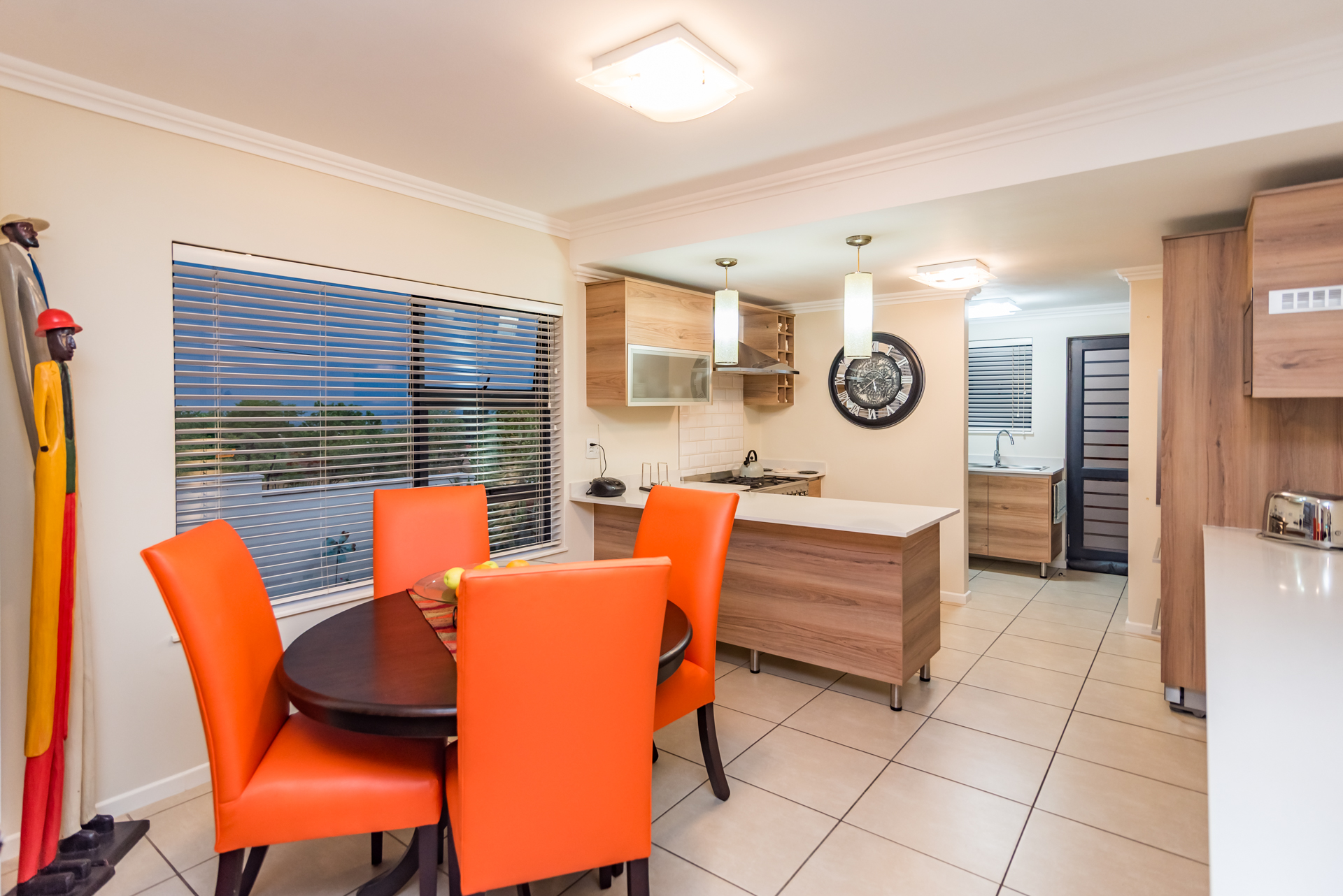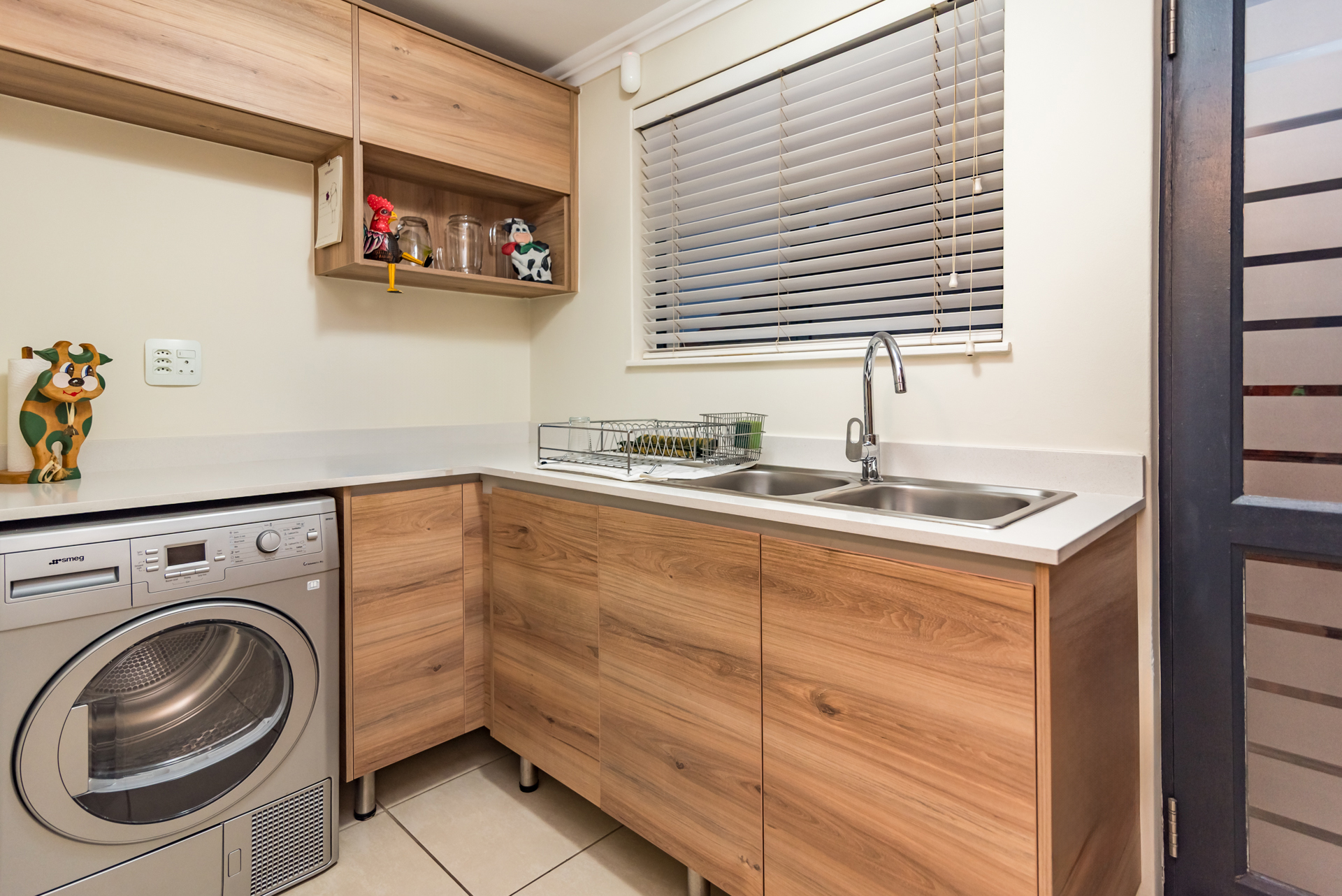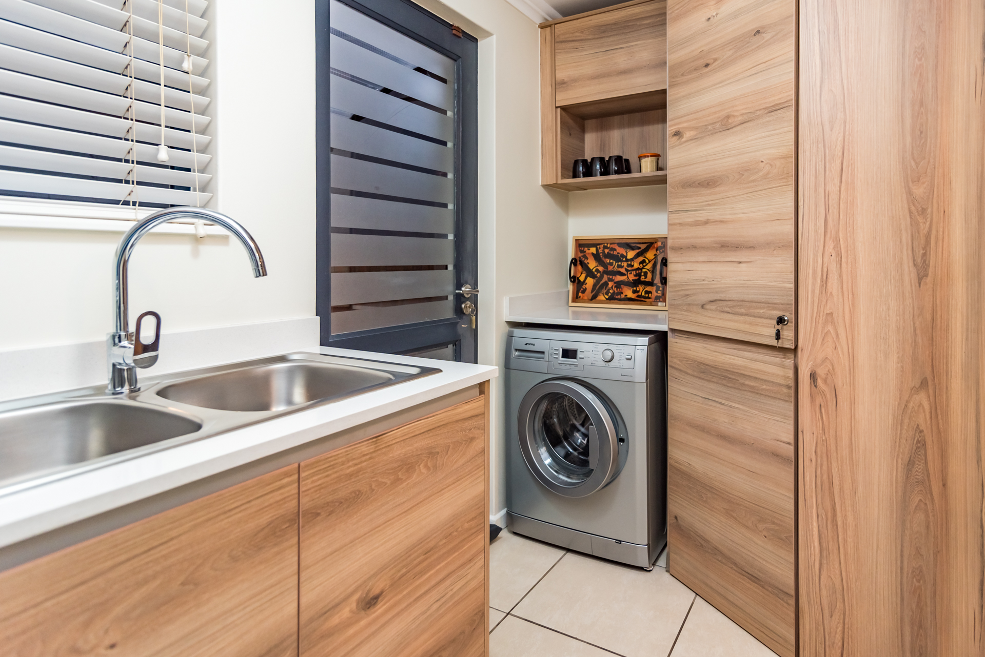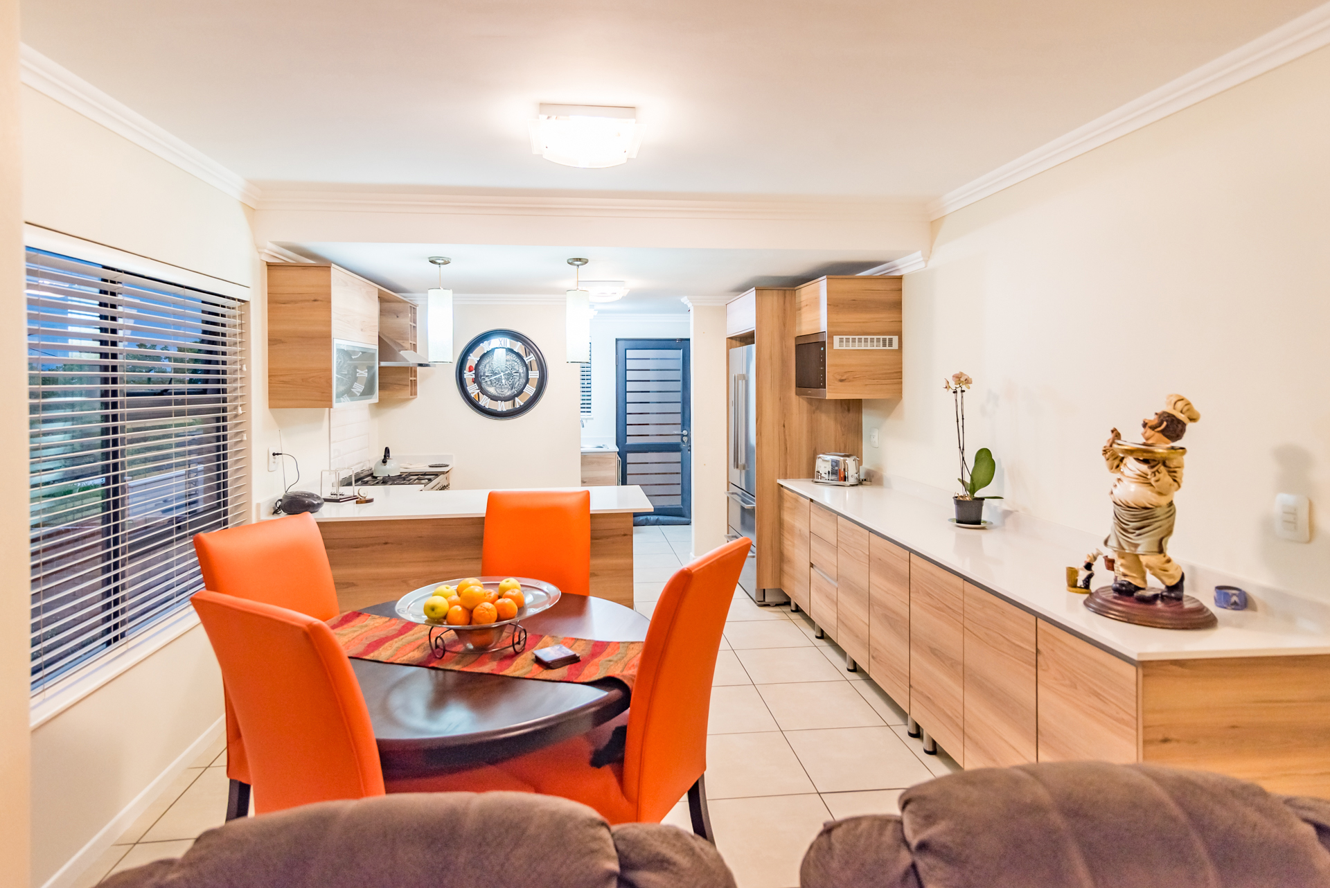 The open-plan living and dining areas create a seamless flow, complemented by a sleek, fully fitted kitchen. The butler-style scullery and laundry add both convenience and sophistication, keeping the heart of the home neat and uncluttered.