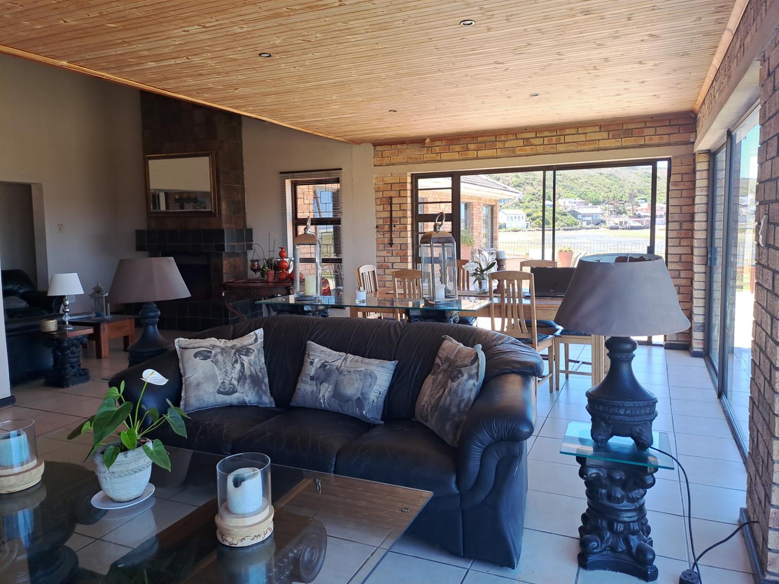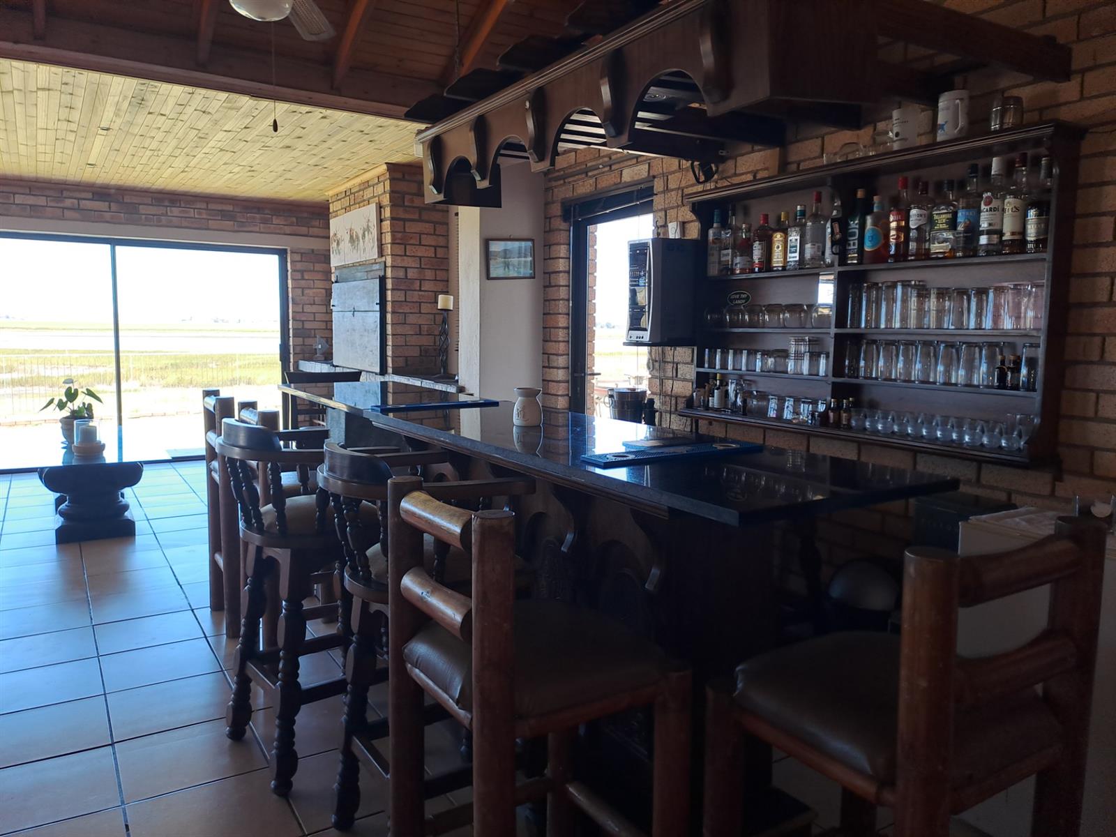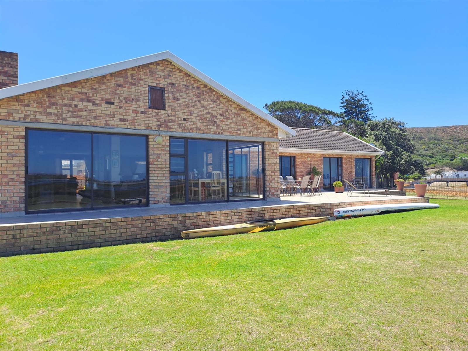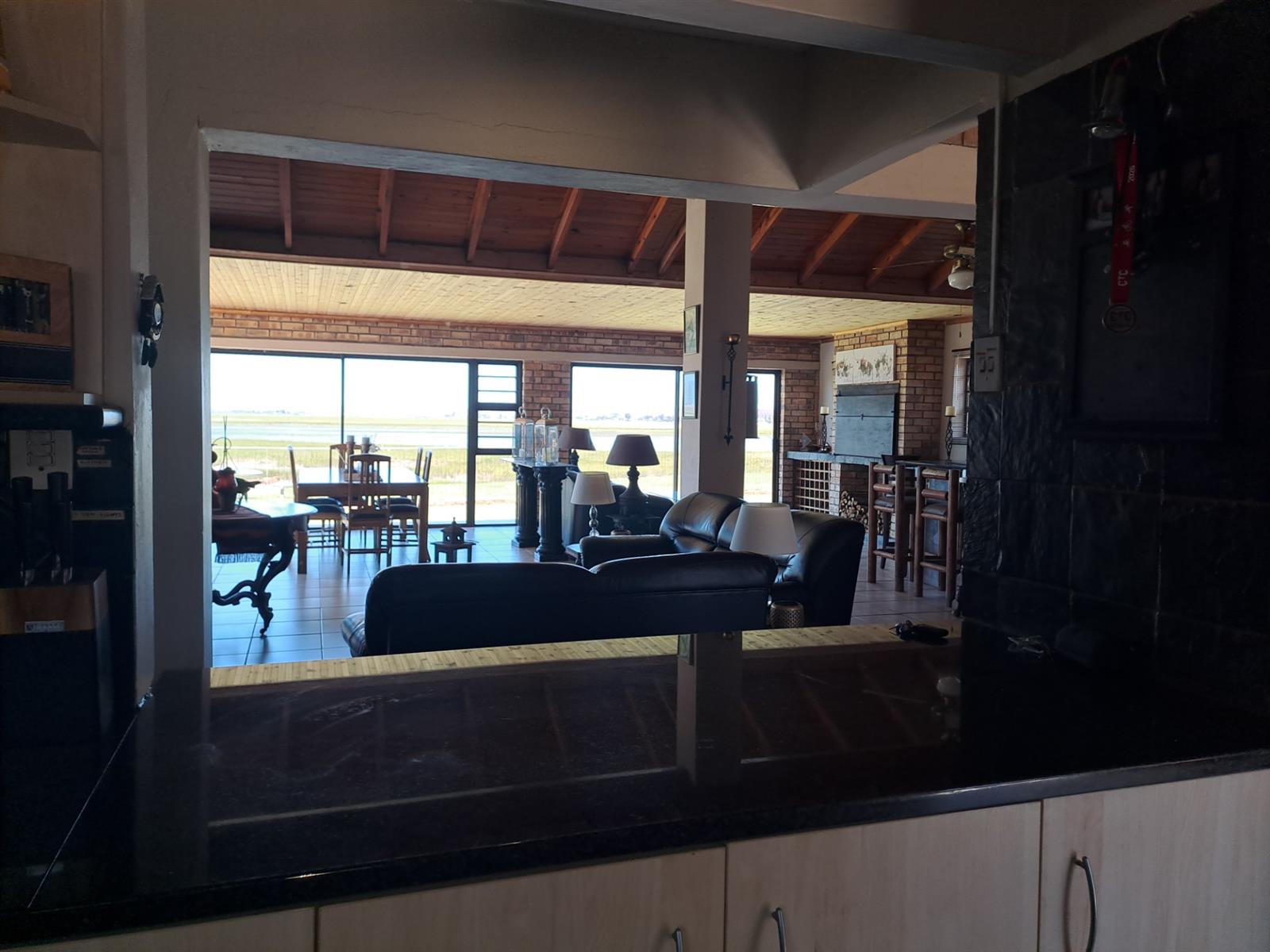 The main house features four generously sized bedrooms, each with sliding doors leading out onto the patio—allowing you to wake up to uninterrupted river vistas. The open-plan kitchen, dining, and living areas are wonderfully spacious, flowing effortlessly into two lounges that can be used as additional living spaces or a dedicated dining area. A built-in braai and bar make this home ideal for entertaining, while a cosy fireplace in the main living area adds warmth and charm during cooler months.