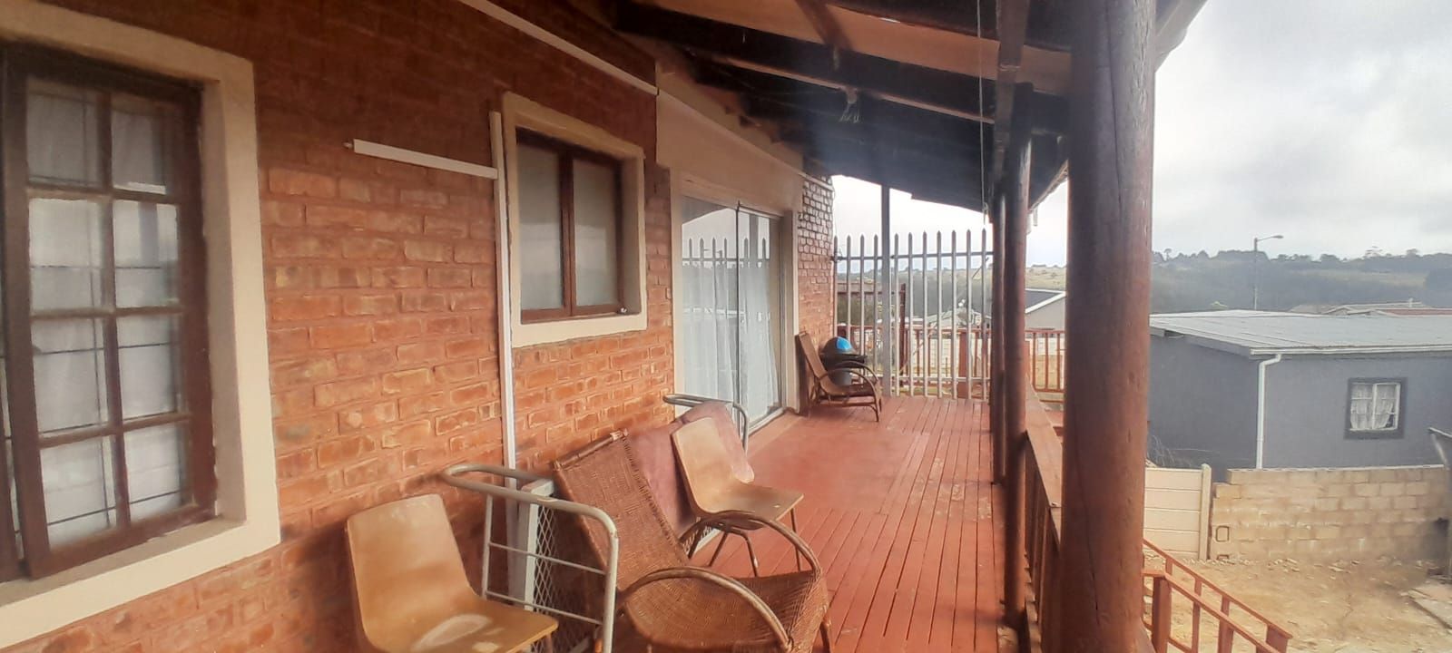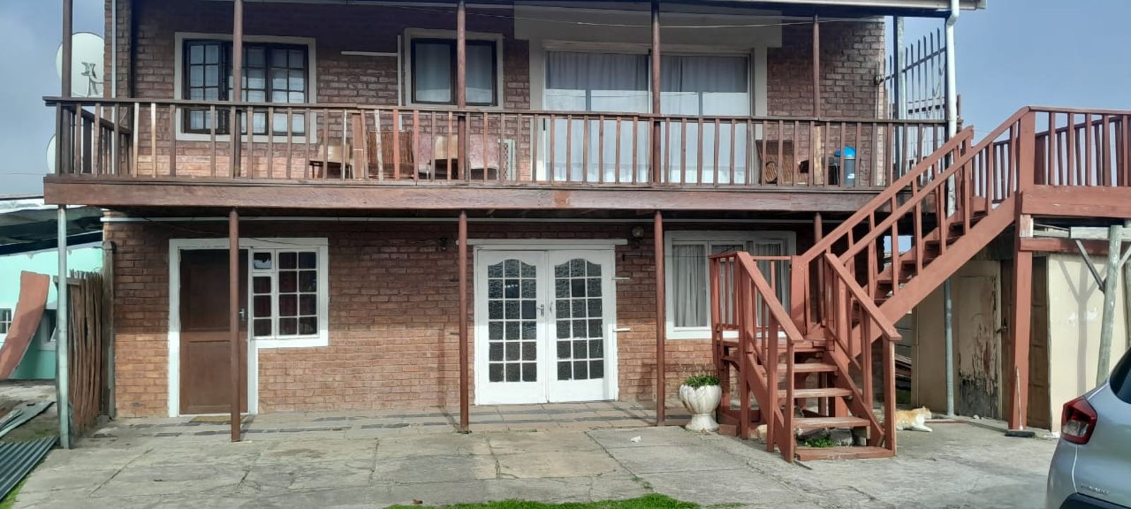 This inviting home features a rustic brick façade complemented by warm wooden finishes. The upper level boasts a generous balcony with an external staircase, while the ground floor welcomes you through elegant French doors leading into the main living area.