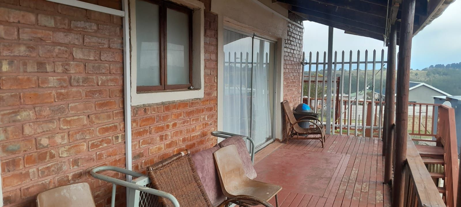 Spacious upstairs balcony with wooden railing and outdoor seating area.