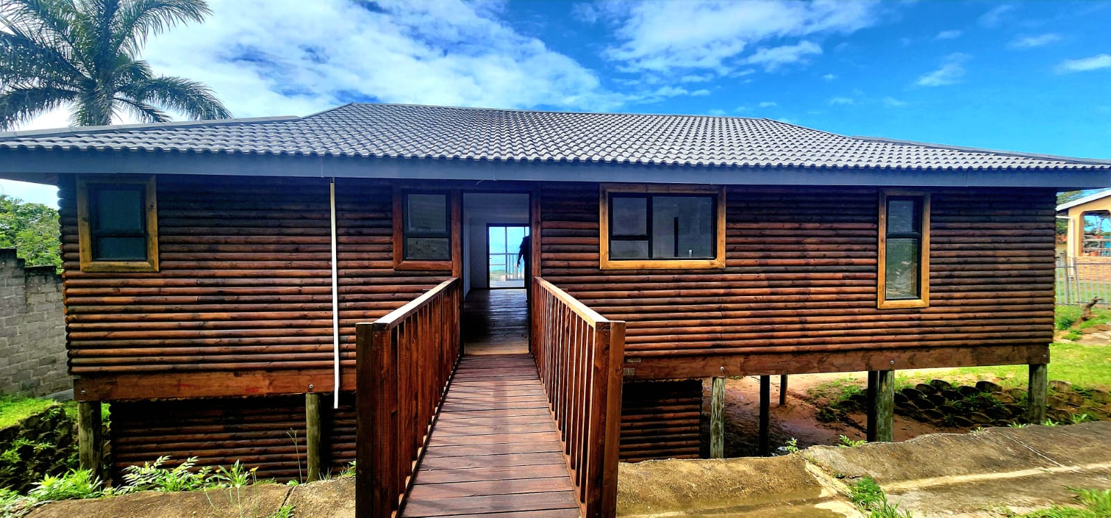 The log homes are all built to the highest standards (CCA treated timber) and come complete with fitted kitchens, bathrooms and built-in cupboards (there is a selected range to choose from) Low maintenance aluminium window frames and exterior doors and tiled pitched roofs with feature gables, the large decks are perfect for relaxing and taking in the natural beauty that surrounds one. The cabins will fit seamlessly into the surroundings of the natural forest, creating harmony with nature. The estate is pet friendly and will be secured with electrified fencing, ensuring safety for the residents.