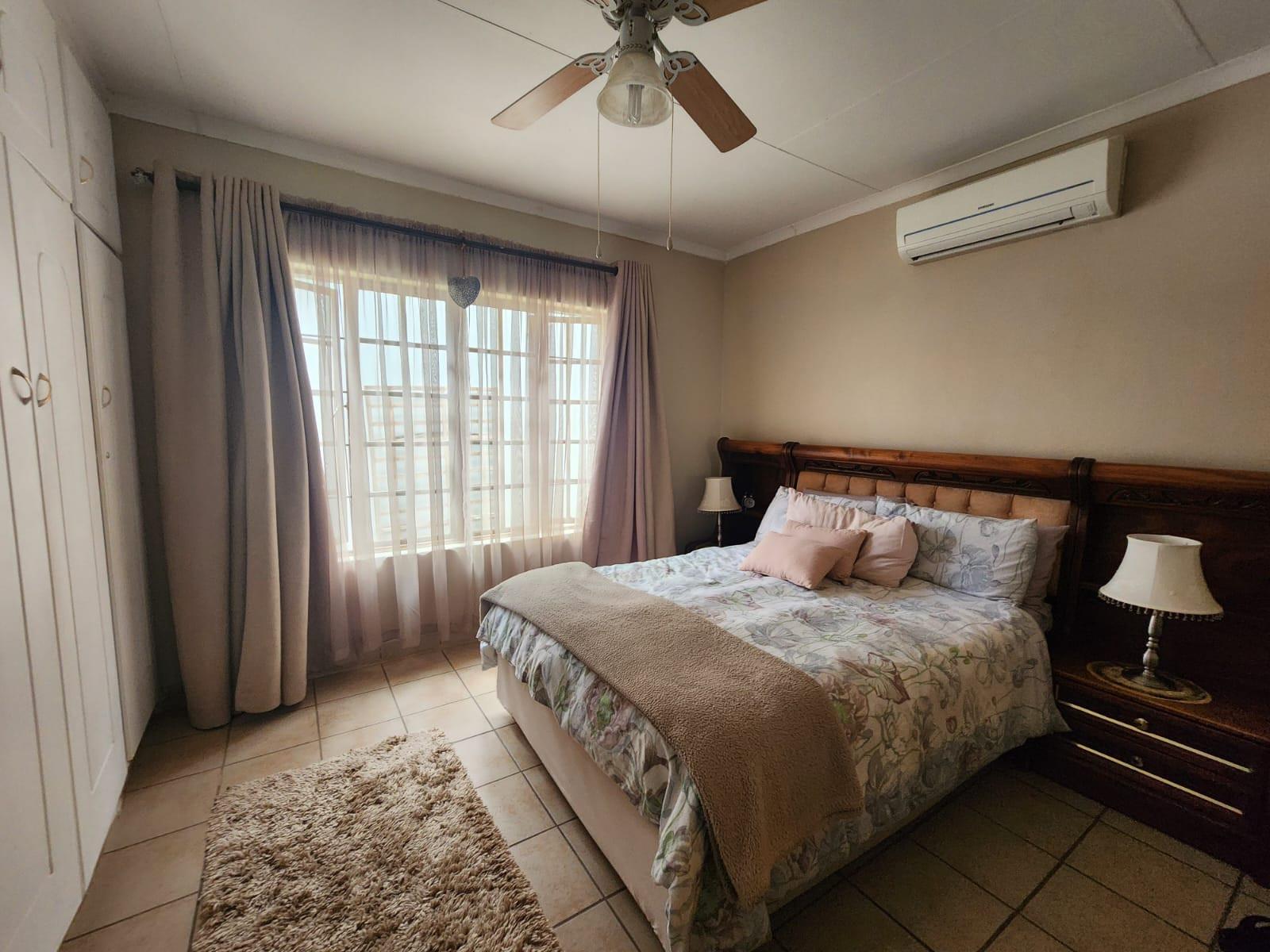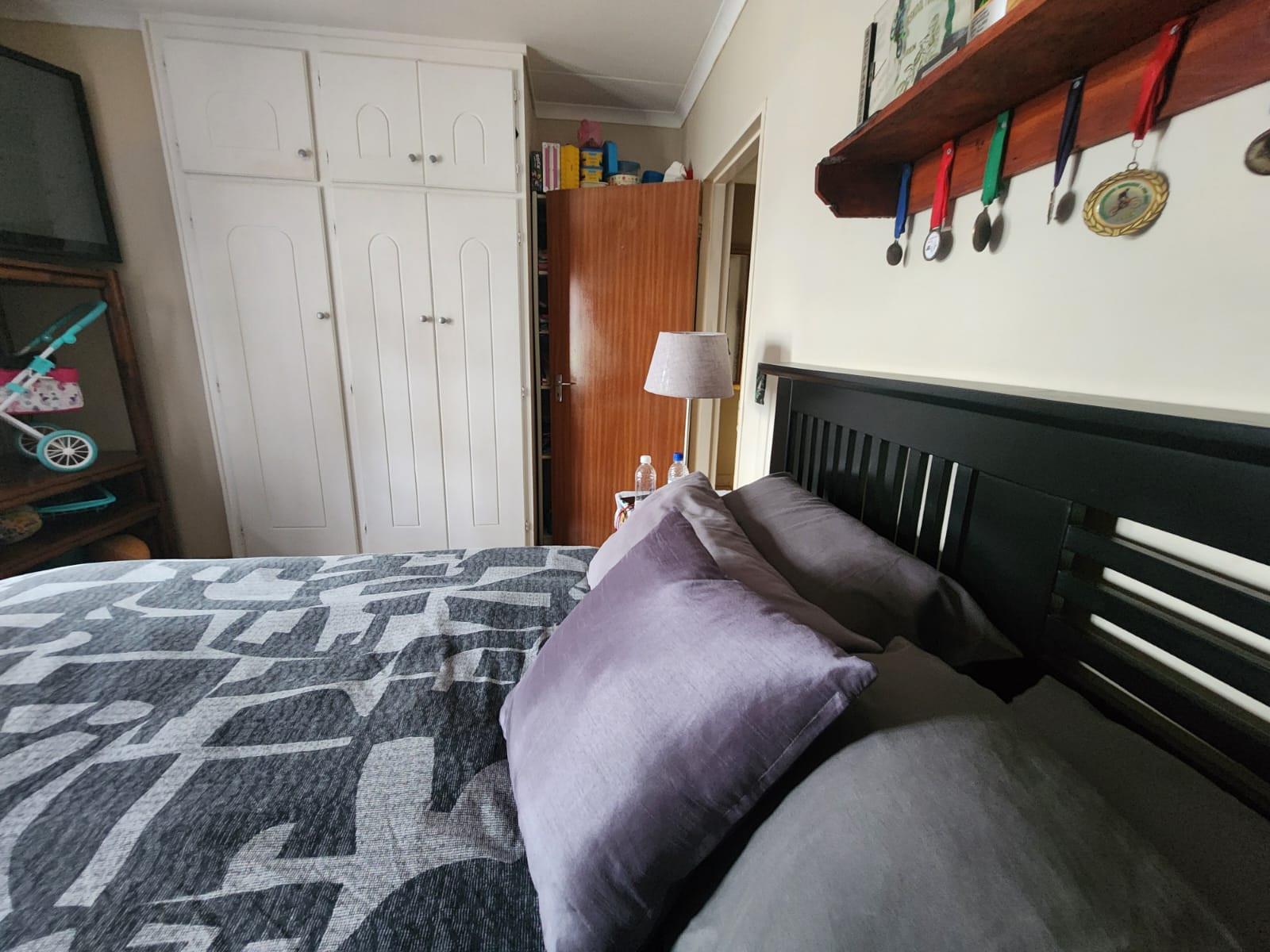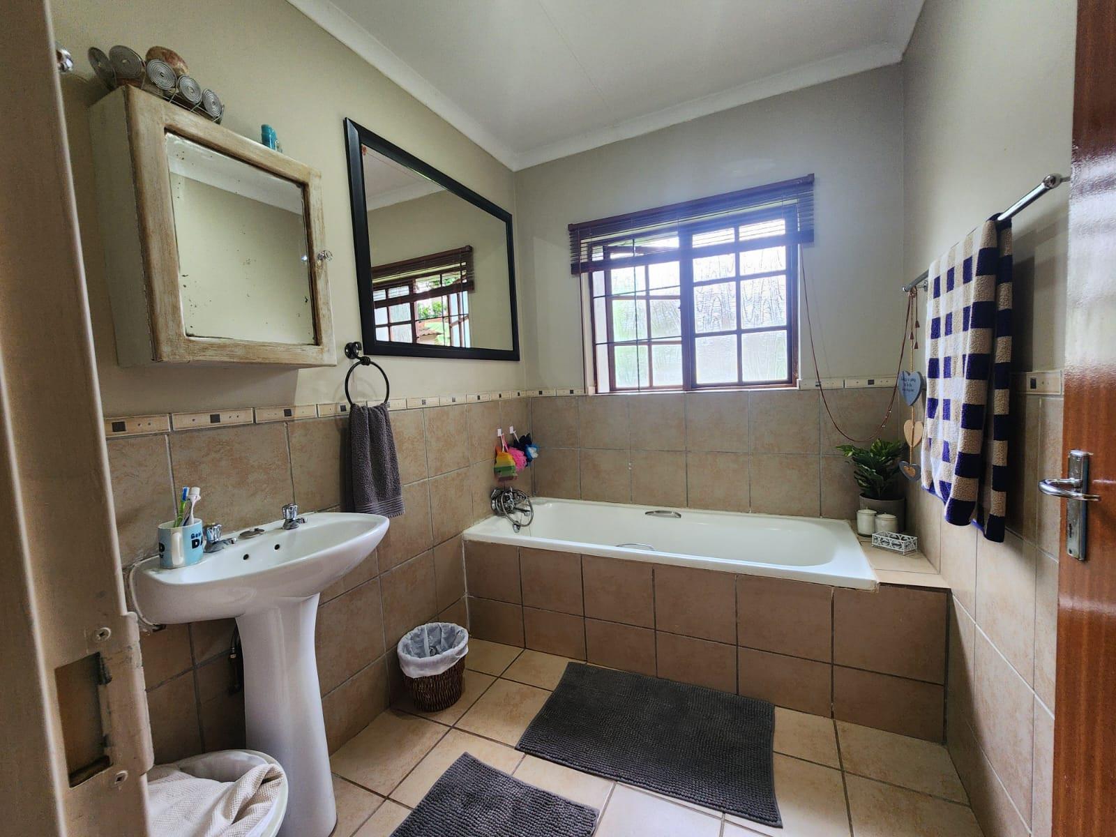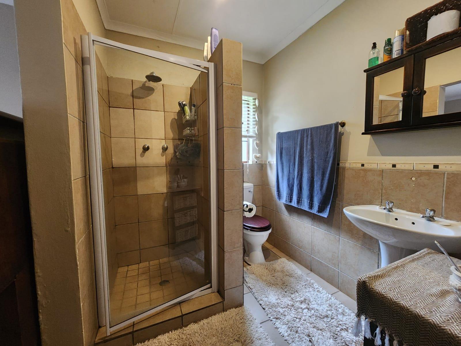 The property offers three tiled bedrooms with built-in cupboards. The main bedroom is en-suite with a shower, toilet and basin, while the second bathroom includes a bath and basin, with a separate toilet for added convenience.