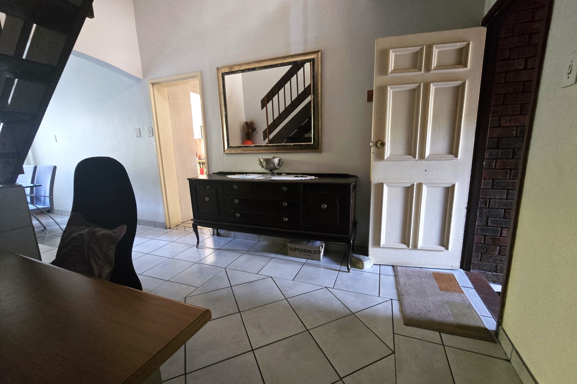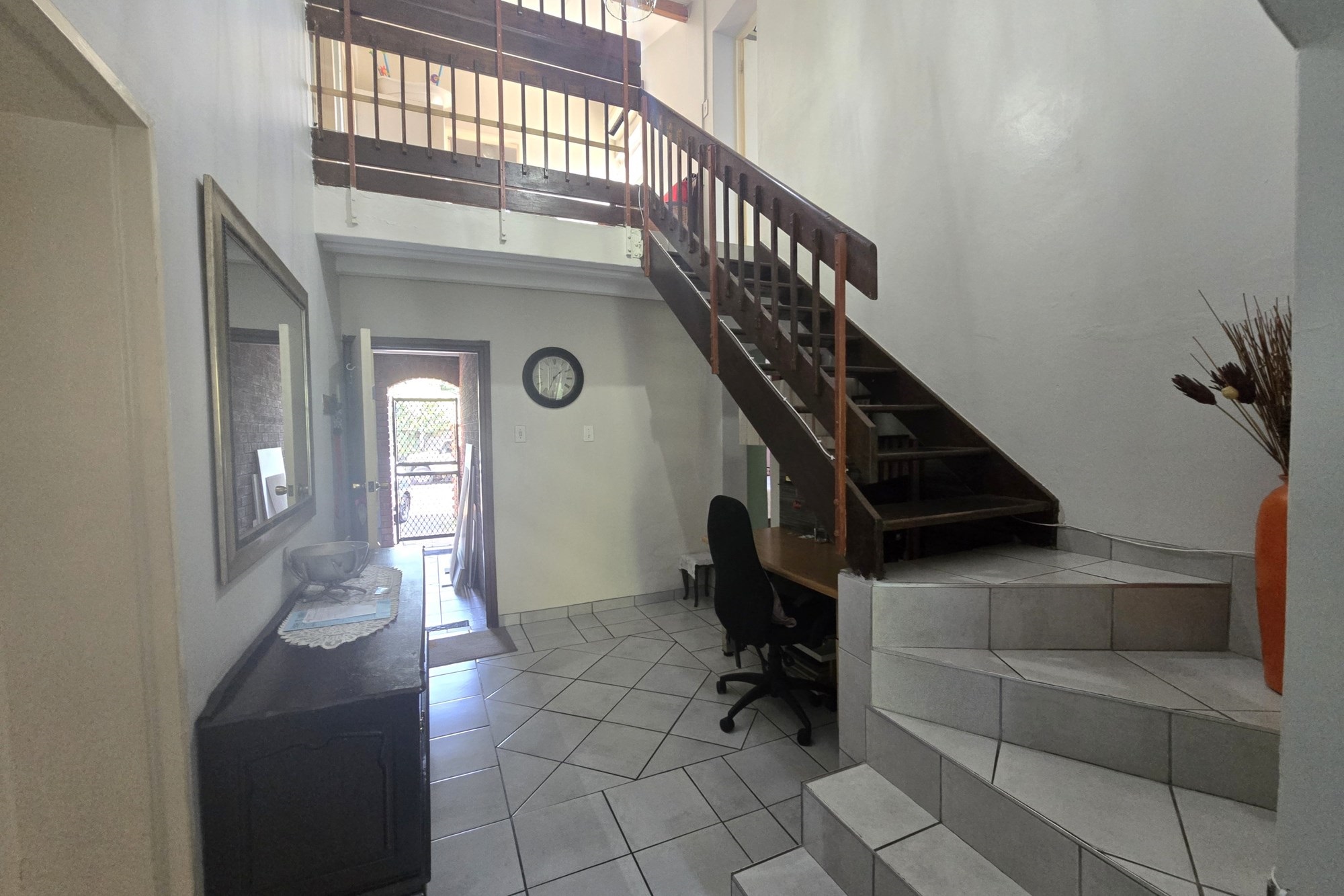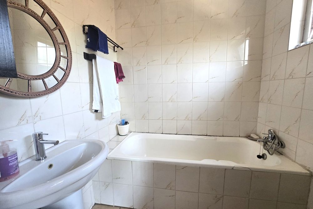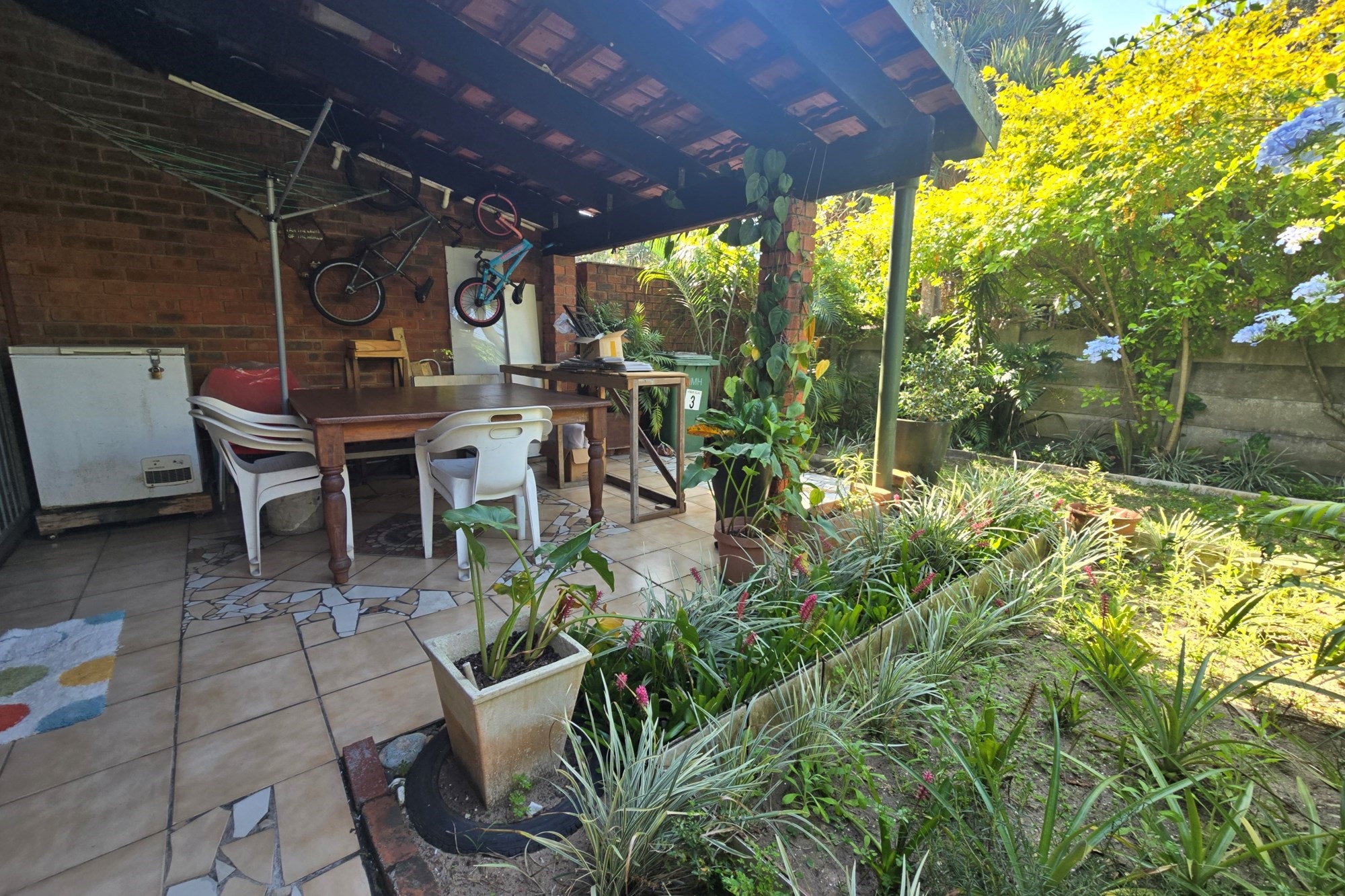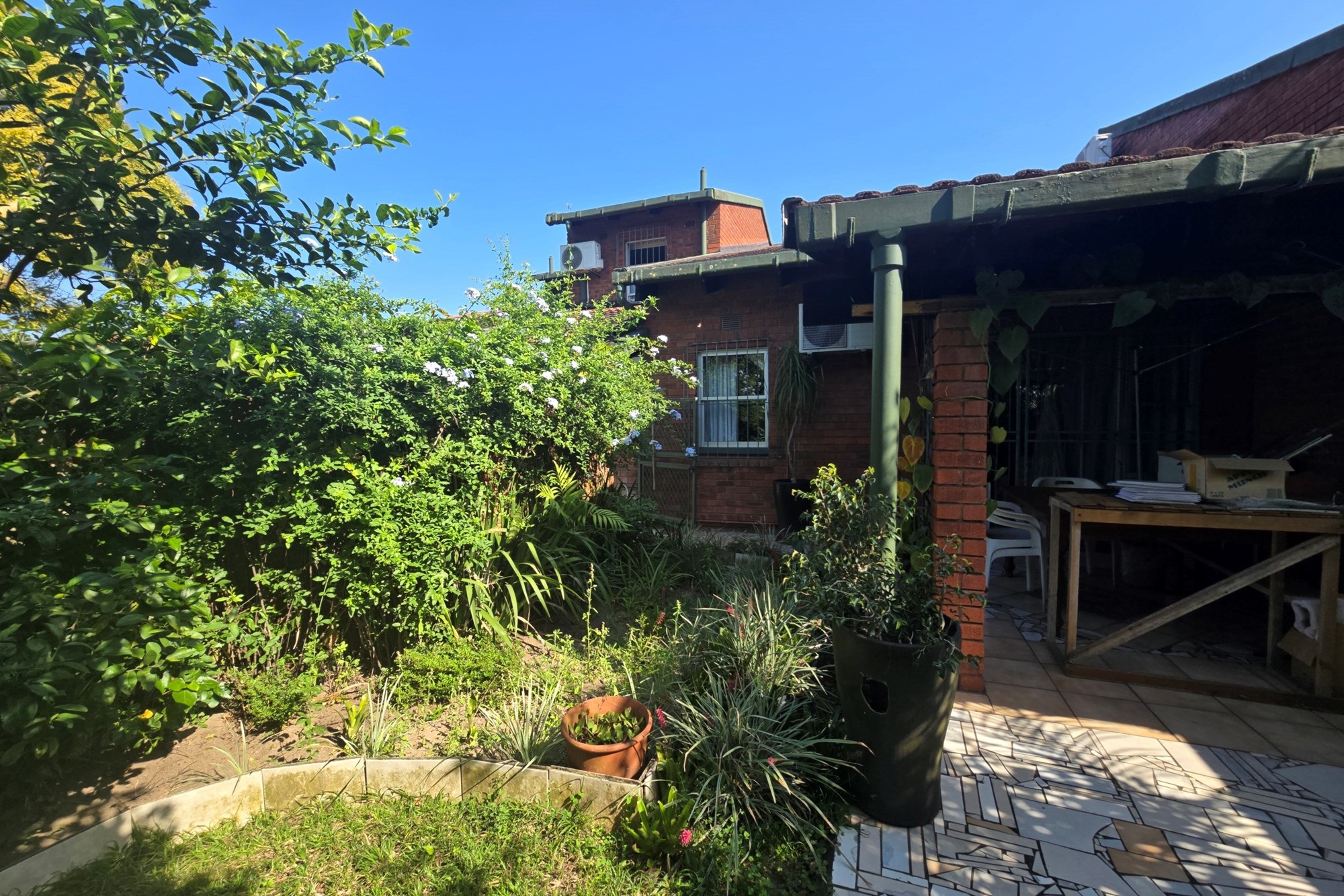 Upstairs, you’ll find three additional bedrooms, a lounge, and a full bathroom with bath, shower, basin, and toilet. This unit also offers a lock-up garage with built-in cupboards, an extra open parking space, and a second private garden with a patio and built in braai.