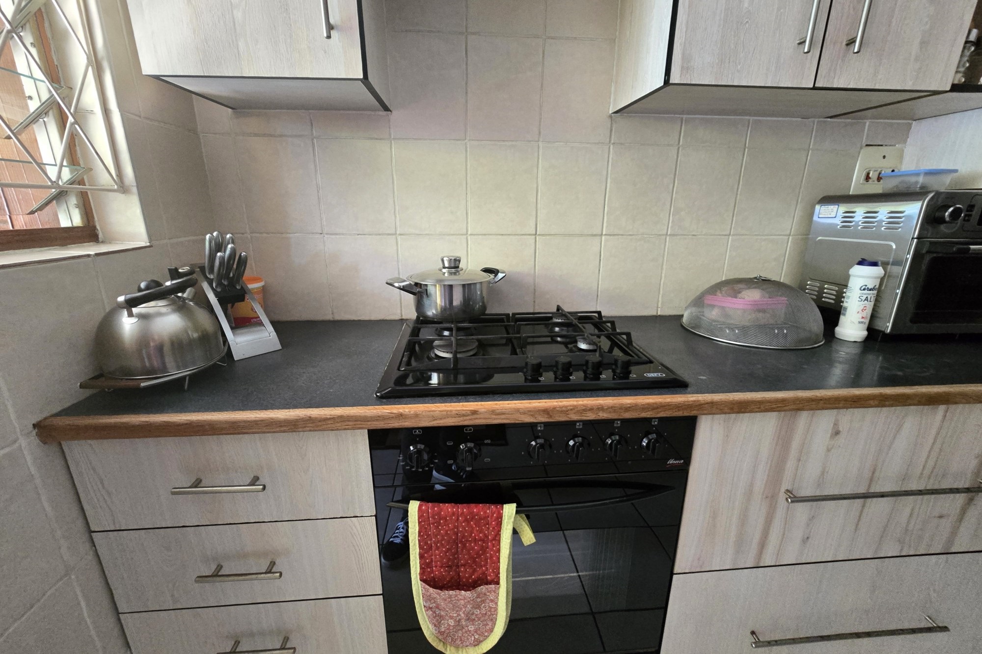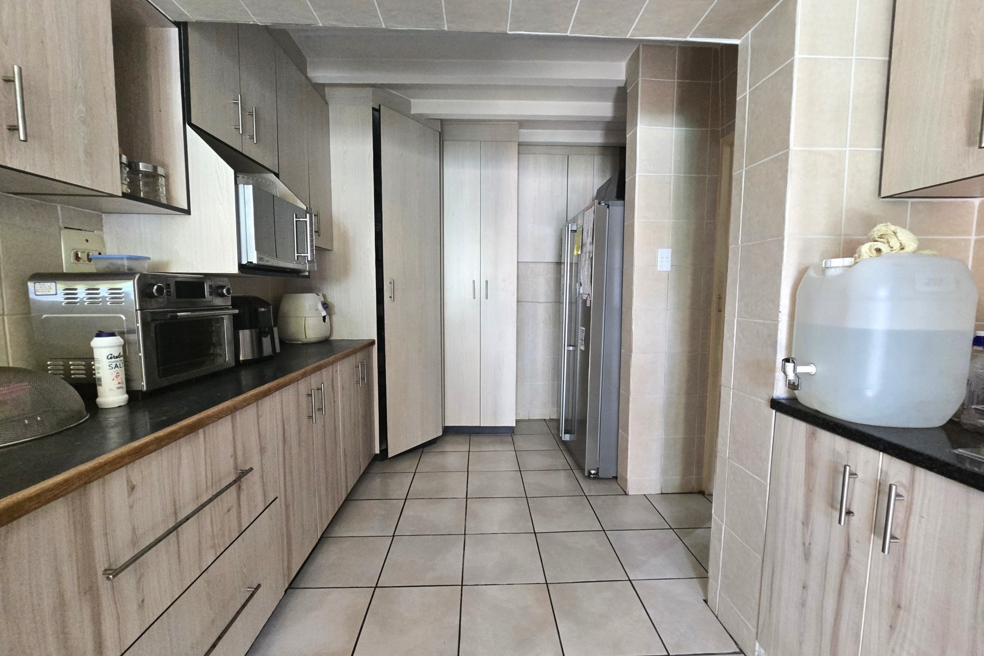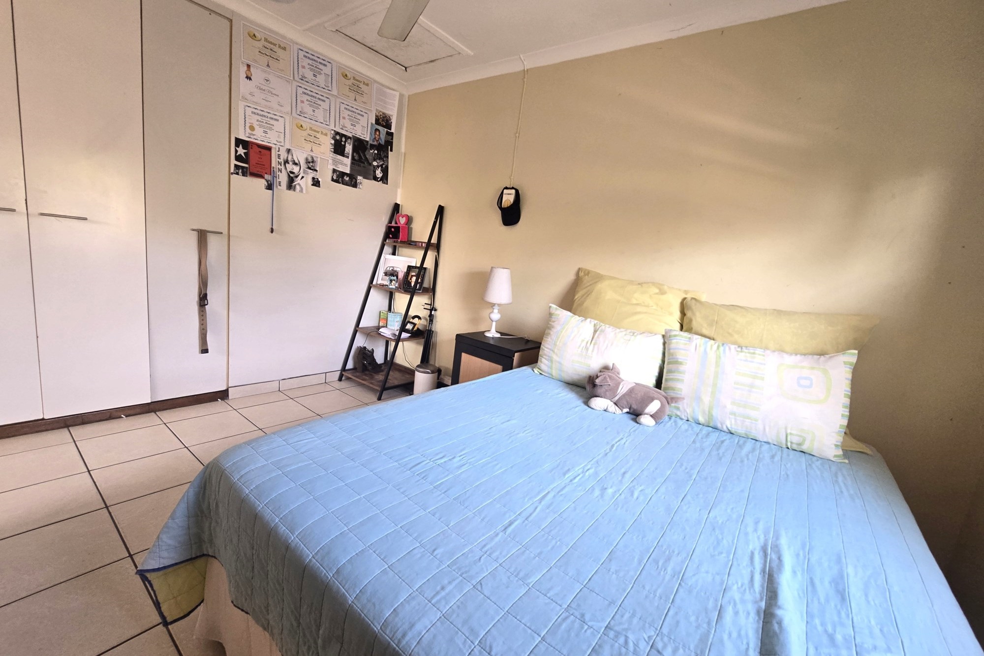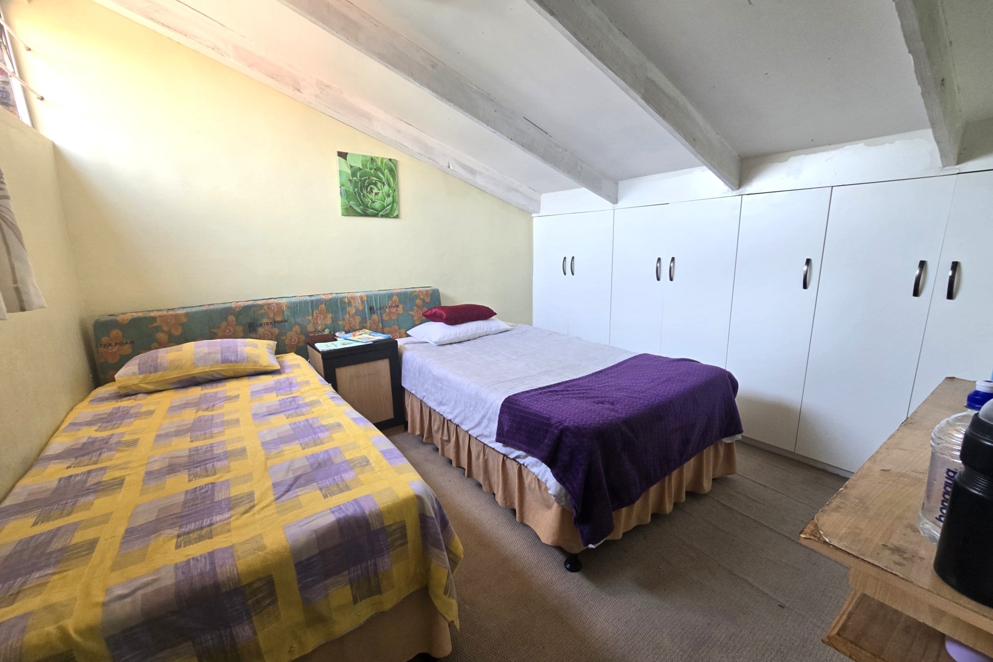Upstairs, you’ll find three additional bedrooms, a lounge, and a full bathroom with bath, shower, basin, and toilet. This unit also offers a lock-up garage with built-in cupboards, an extra open parking space, and a second private garden with a patio and built in braai.