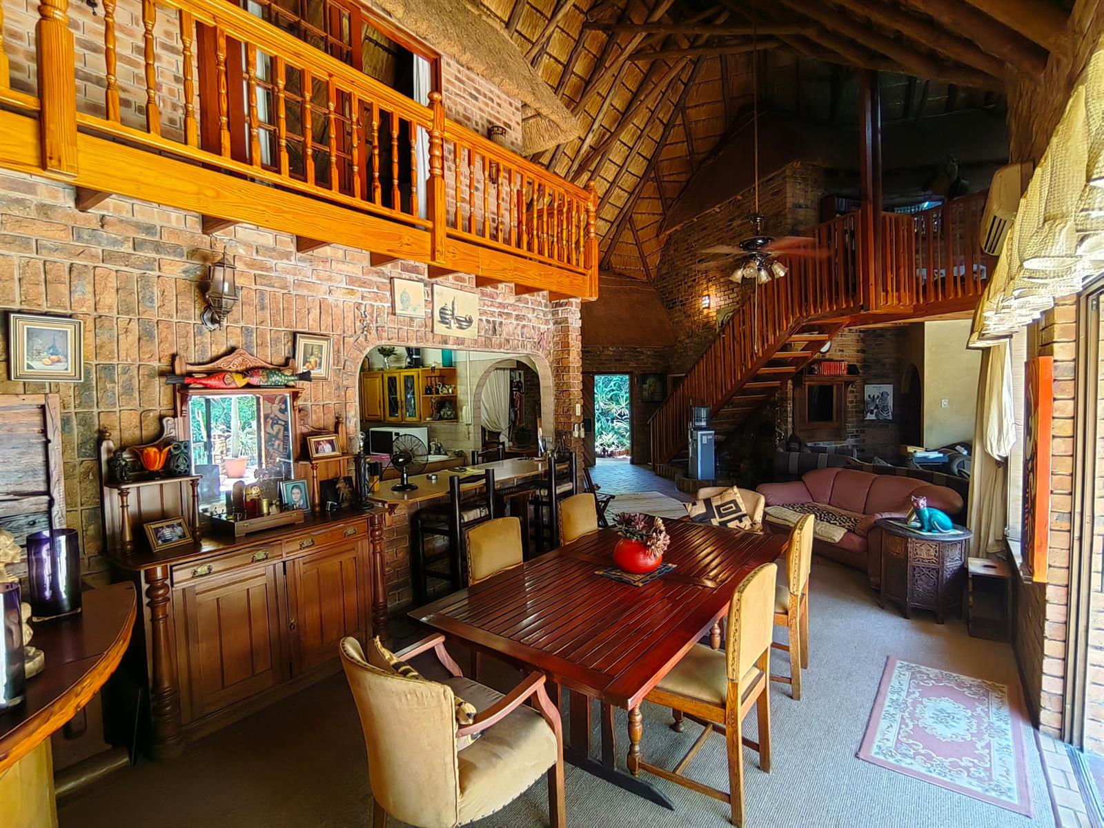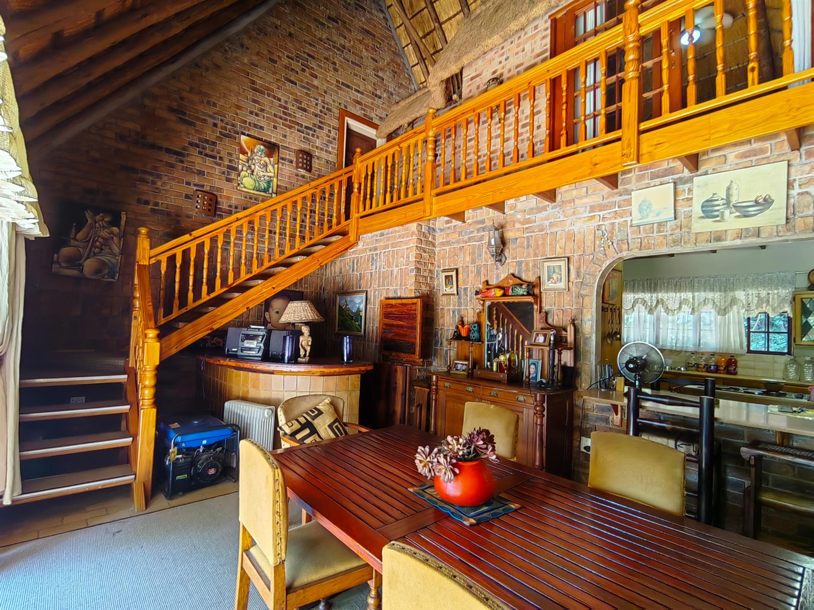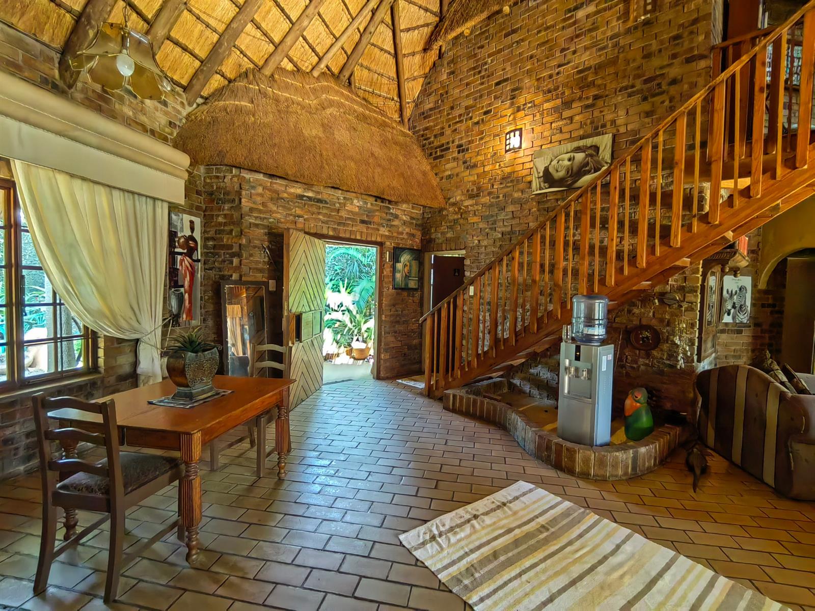 The heart of the home is the open-plan living space, where the kitchen, dining area, and lounge flow seamlessly together. A separate scullery keeps the kitchen neat and functional, while the high thatched ceilings and natural textures create a warm, holiday-like atmosphere year-round.
