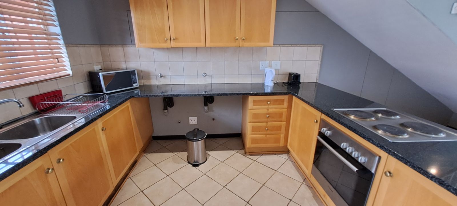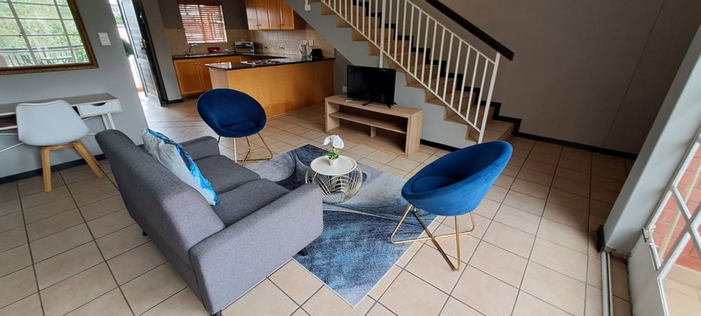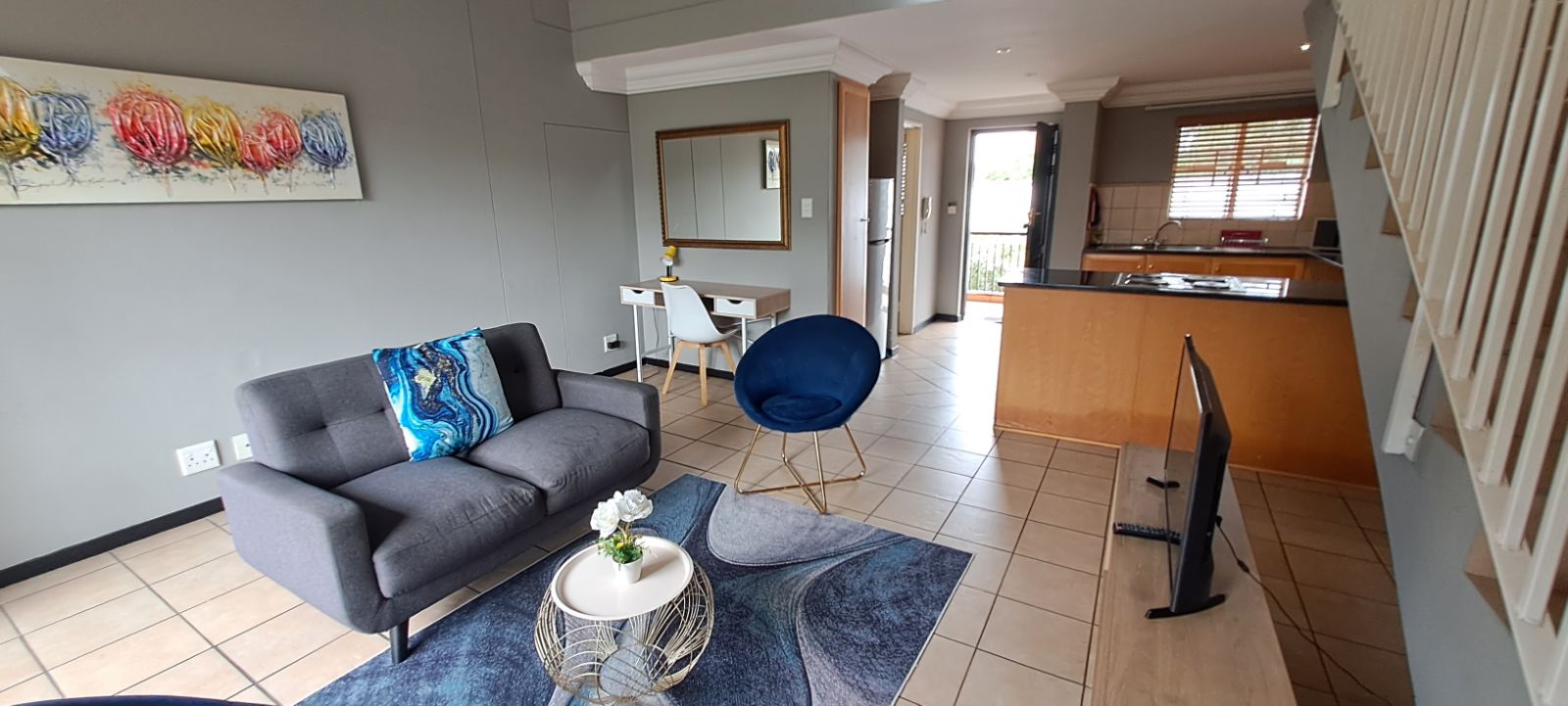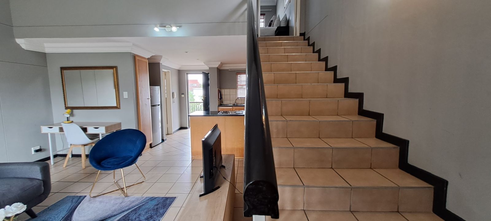 This extremely well-kept property is fully tiled and offers a very spacious en-suite bedroom upstairs and open-plan living with a kitchen, bathroom and patio downstairs. The kitchen has lots of bic's with granite counter tops, hob/oven and two water connections for a washing m/c and dishwasher.