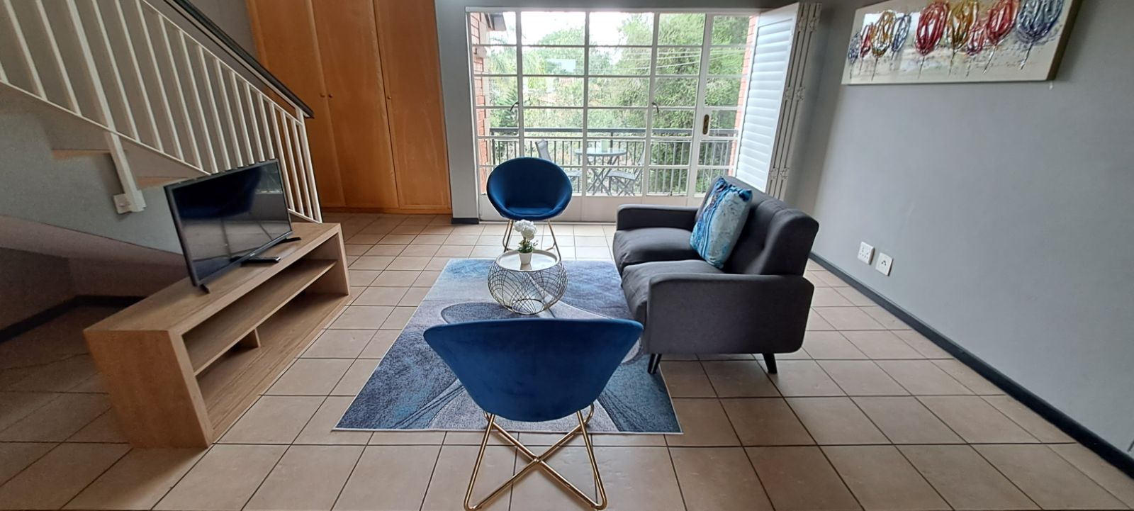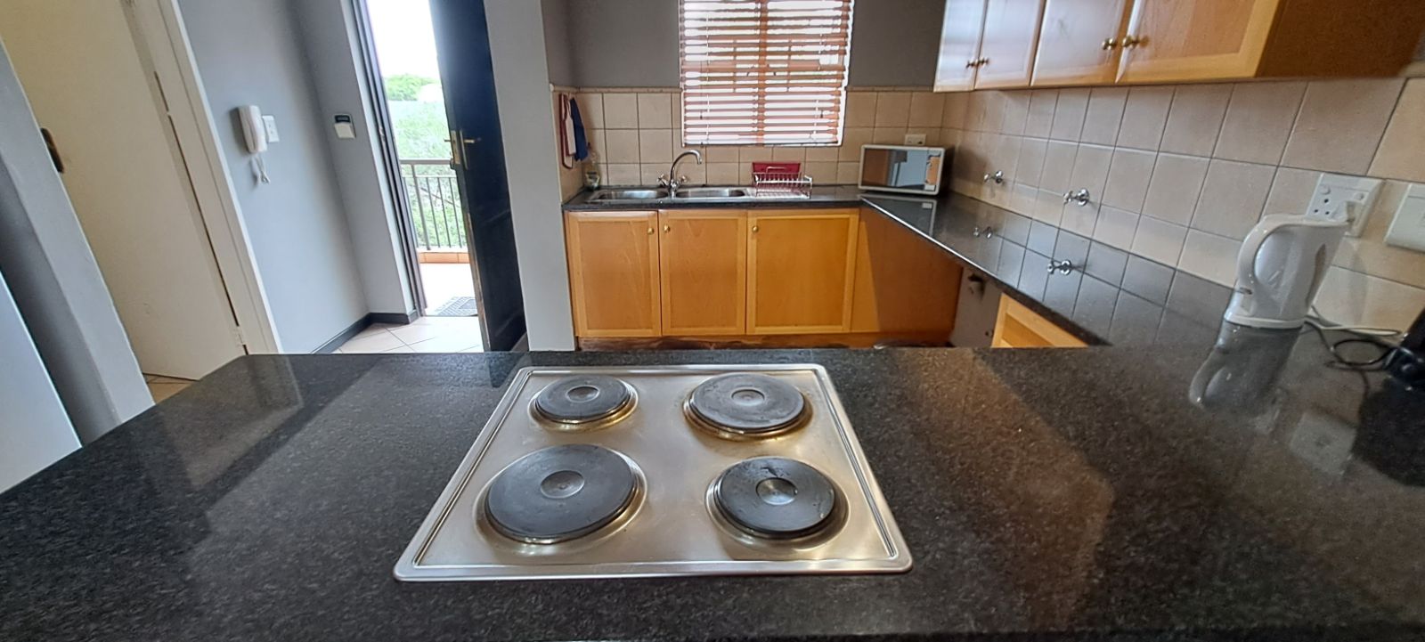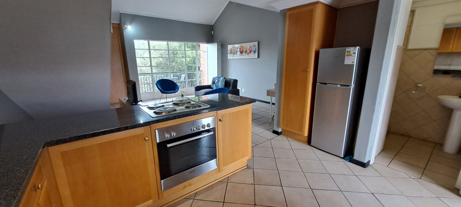 This extremely well-kept property is fully tiled and offers a very spacious en-suite bedroom upstairs and open-plan living with a kitchen, bathroom and patio downstairs. The kitchen has lots of bic's with granite counter tops, hob/oven and two water connections for a washing m/c and dishwasher.