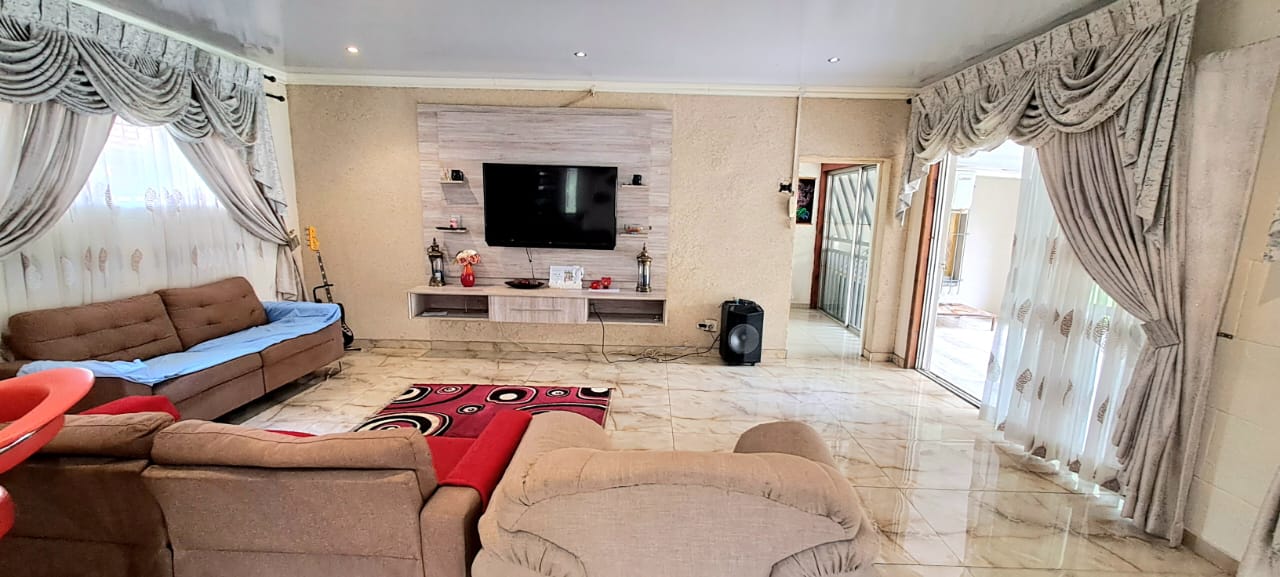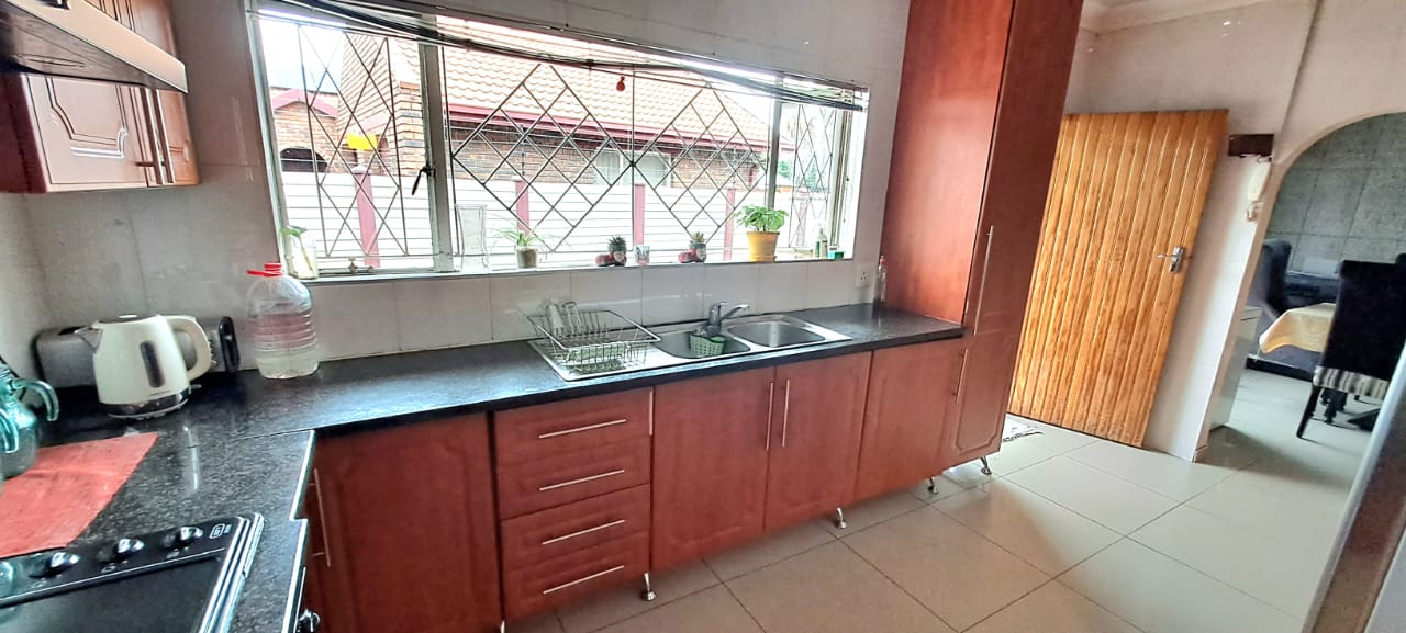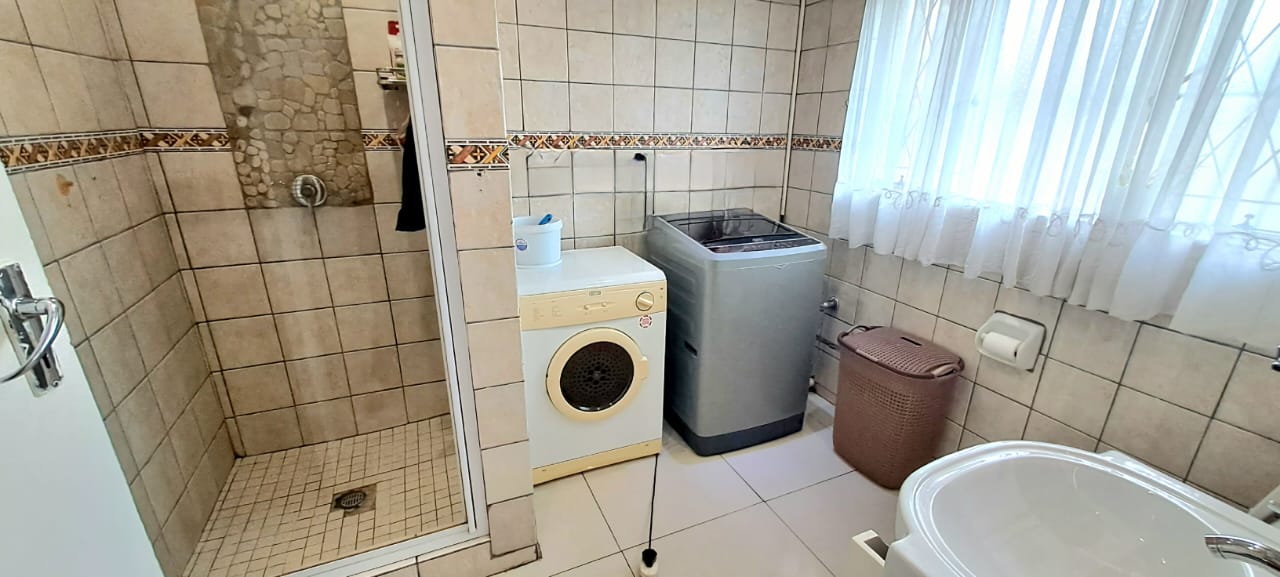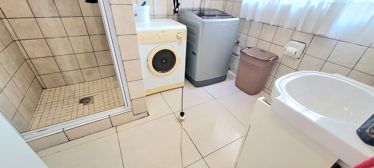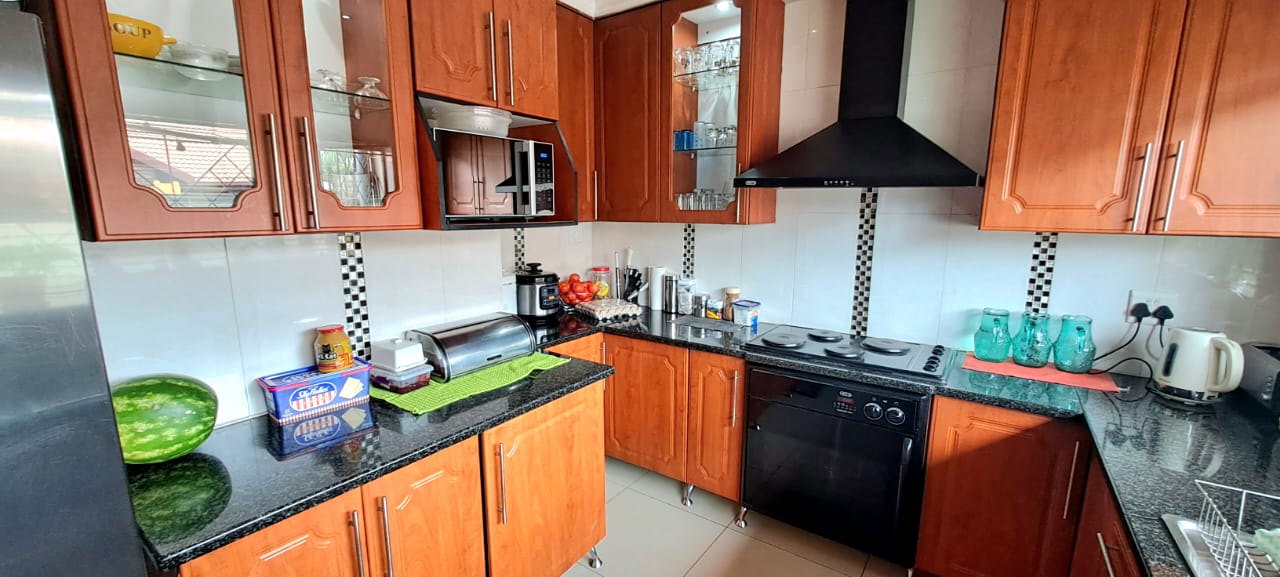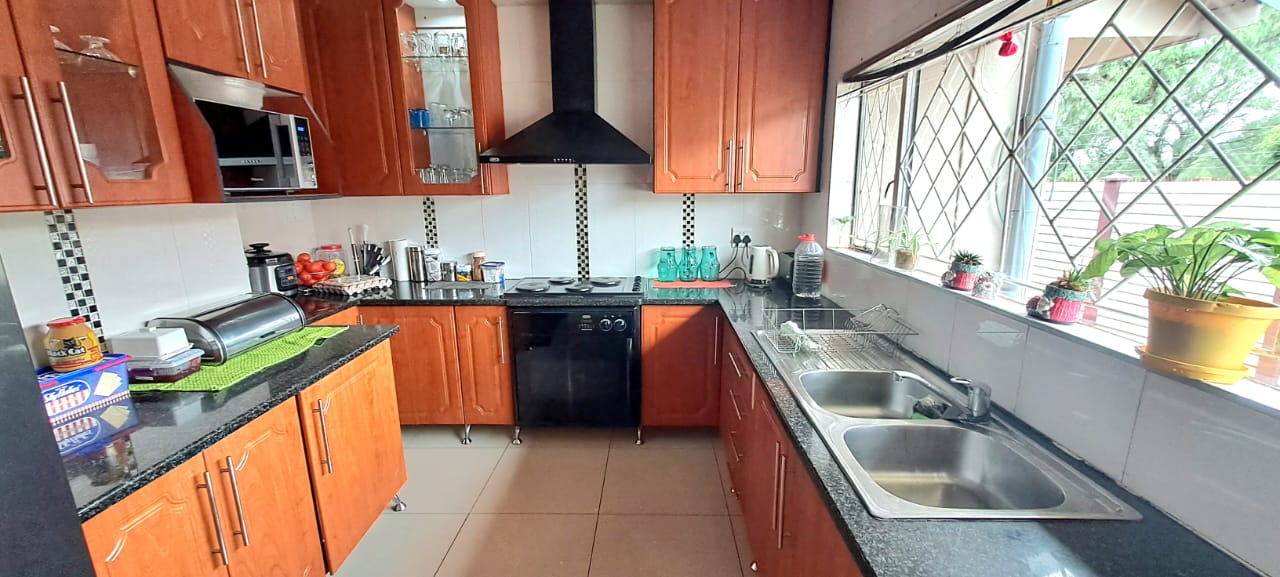 There is another spacious open plan lounge and dining room area, and a good sized modern wooden kitchen, that offers ample cupboard space, granite tops and electrical stove.