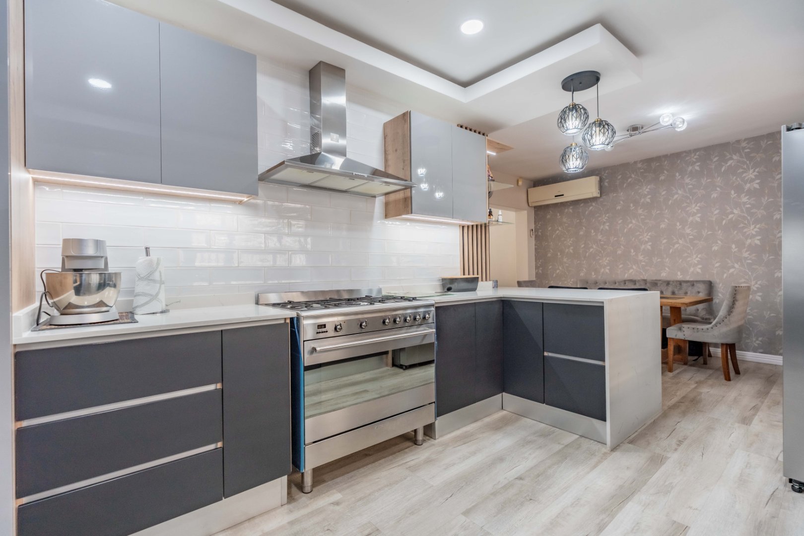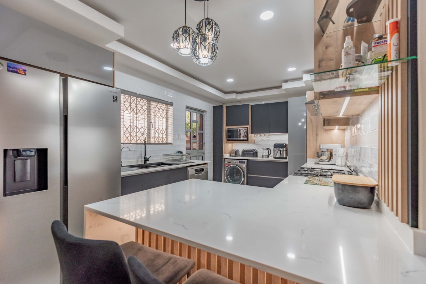 Caesarstone waterfall countertops, gas hob, sleek cabinetry, and ambient designer lighting create a bright, contemporary