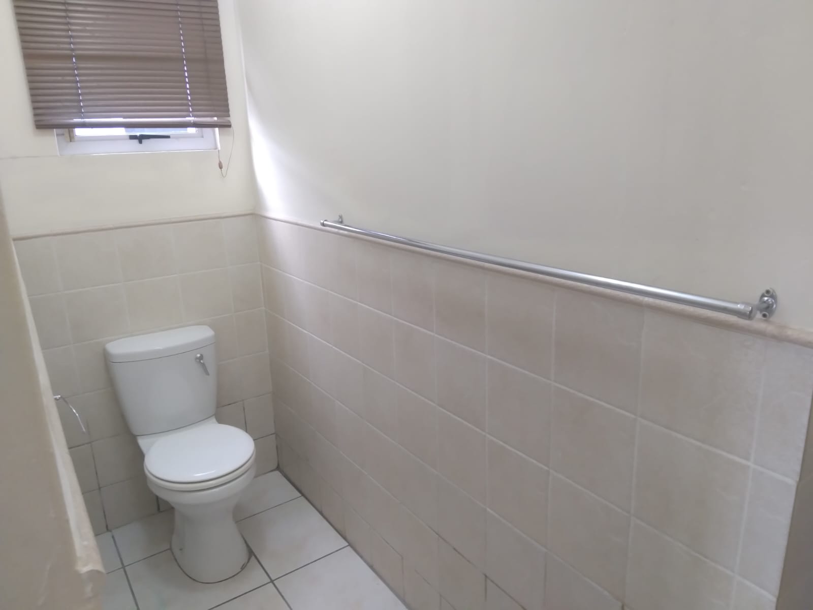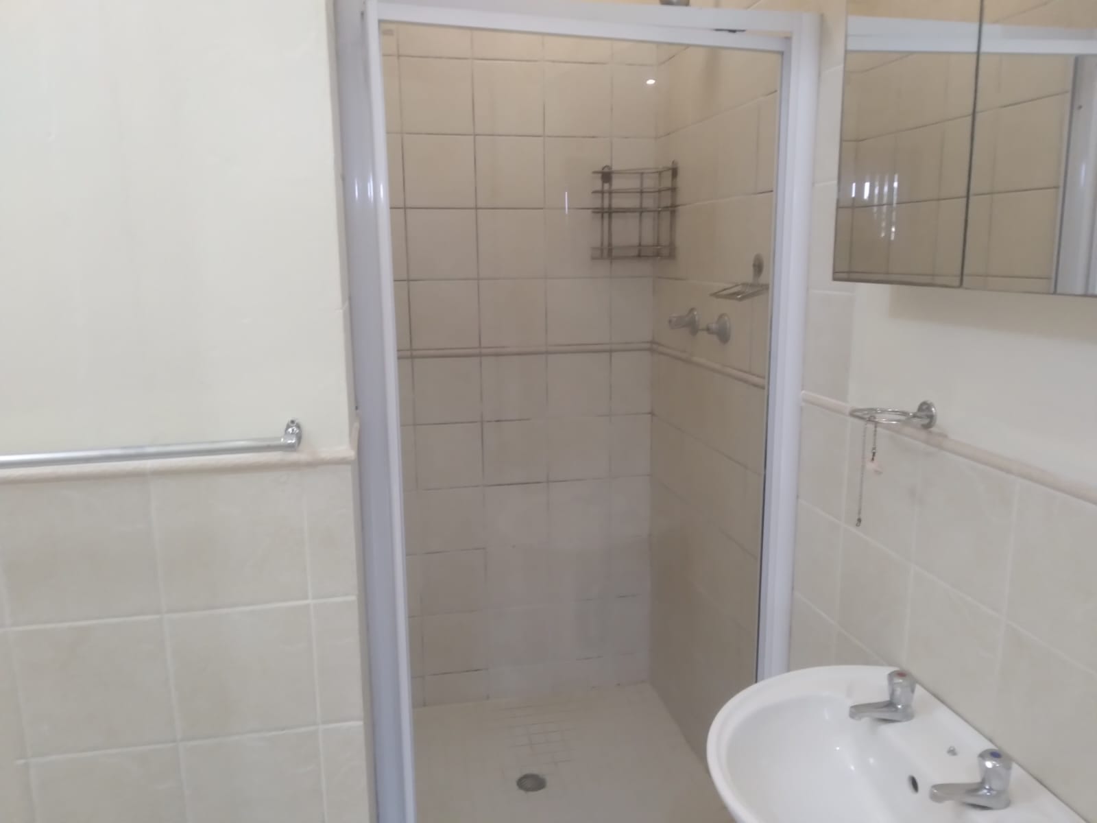 Bathroom has a shower, basin and seperate toilet