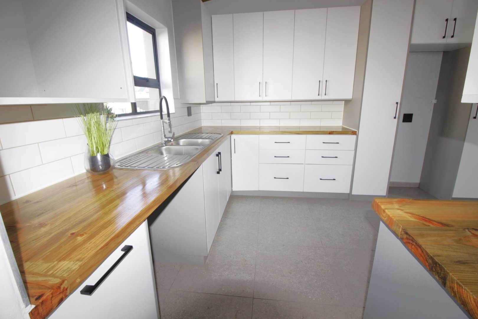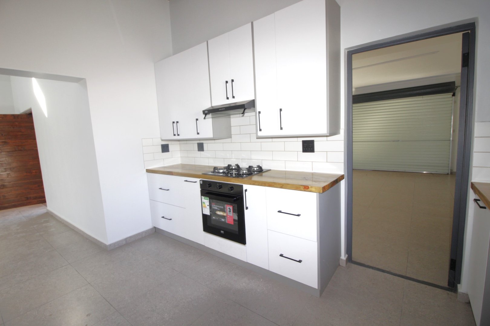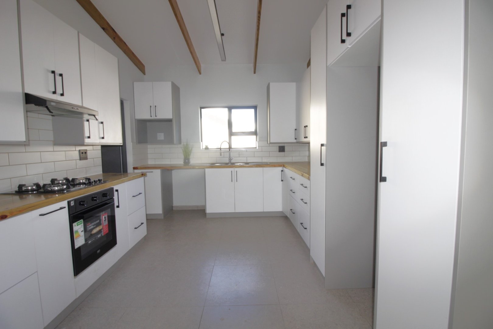 The stunning white kitchen is a chef's dream, highlighted by gorgeous wooden countertops that add warmth and sophistication, ample cupboard space, a gas hob, and an electric oven, making meal preparation a joy.