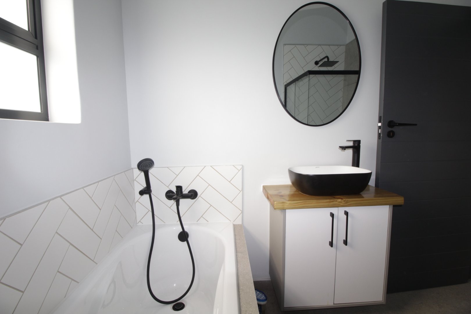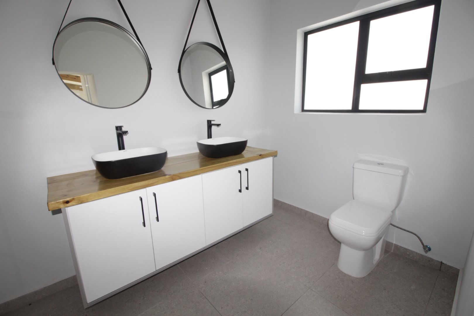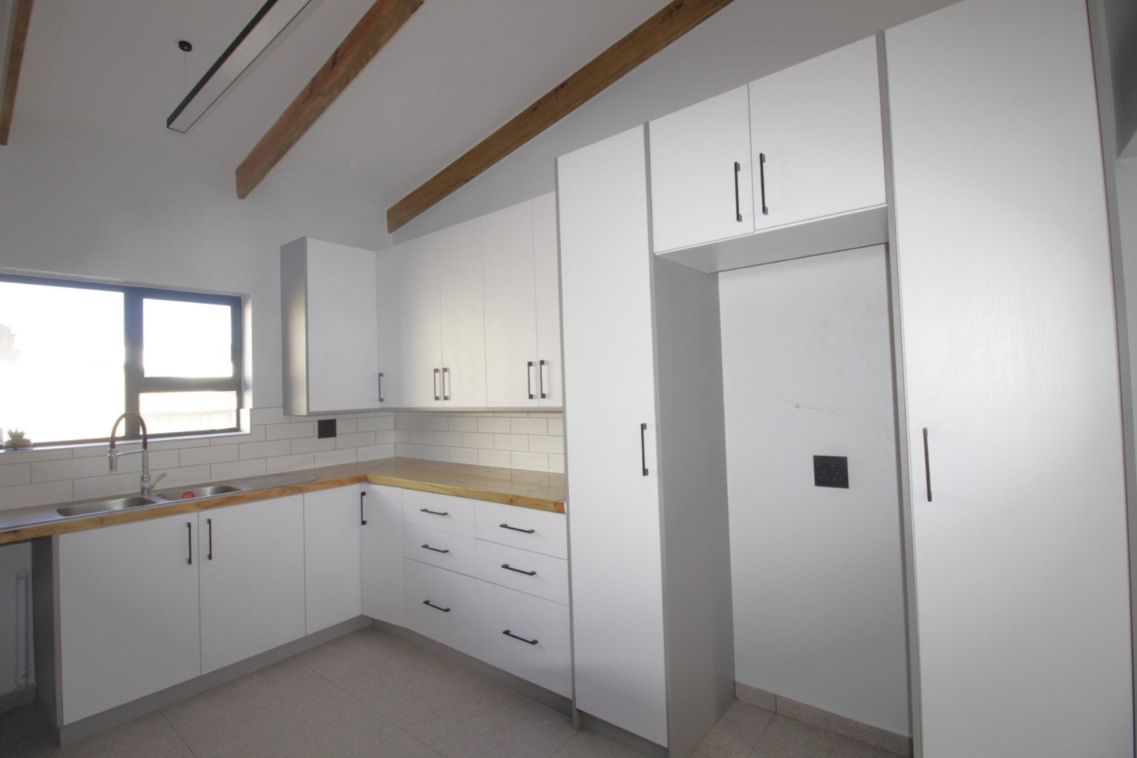 The stunning white kitchen is a chef's dream, highlighted by gorgeous wooden countertops that add warmth and sophistication, ample cupboard space, a gas hob, and an electric oven, making meal preparation a joy.