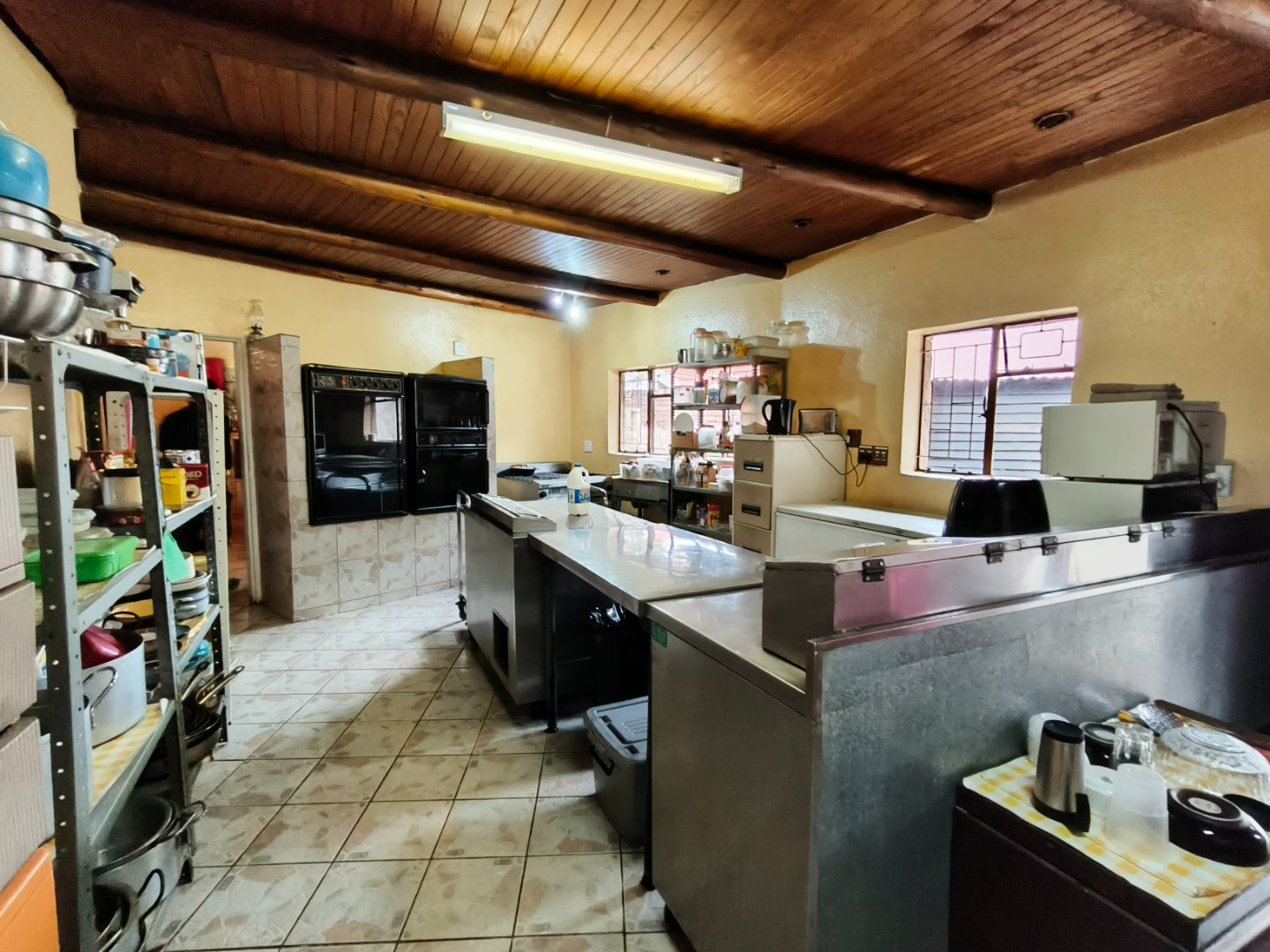 A large dining room and fully equipped kitchen with a walk-in fridge