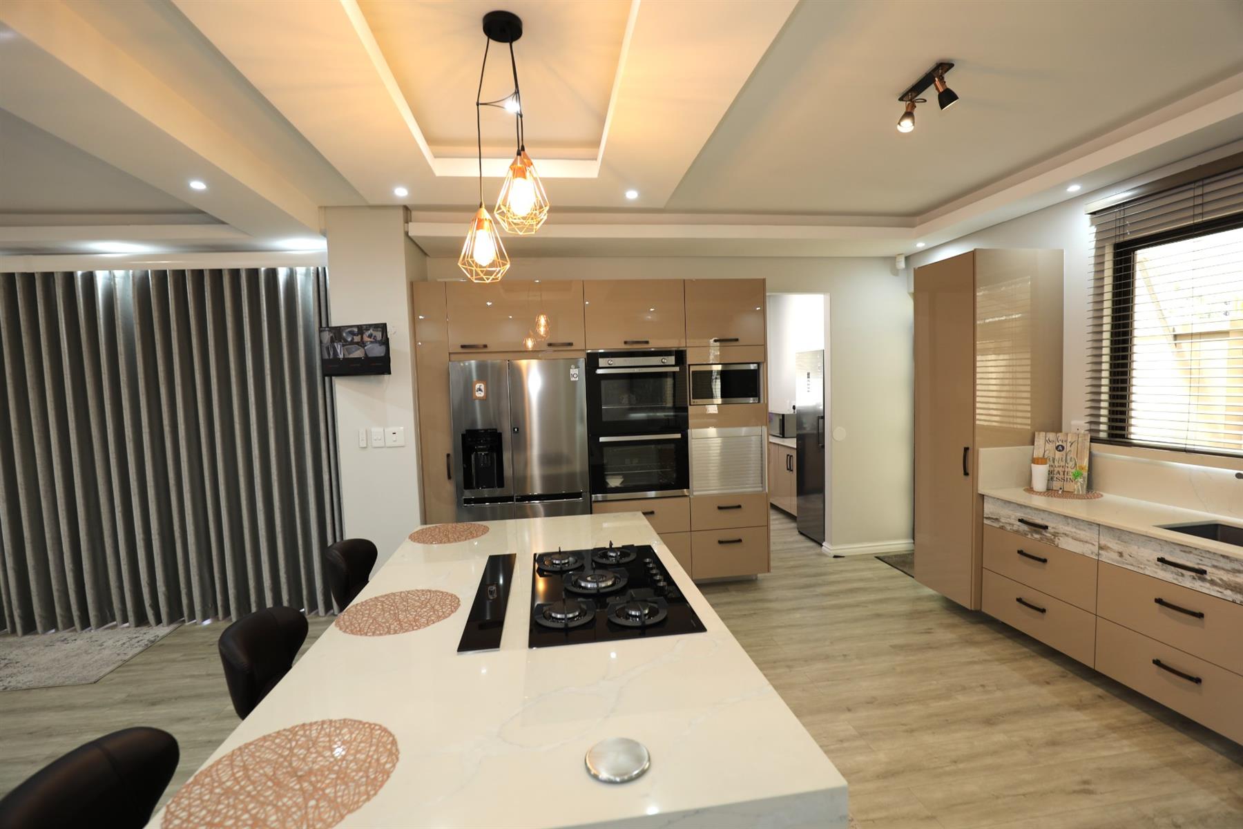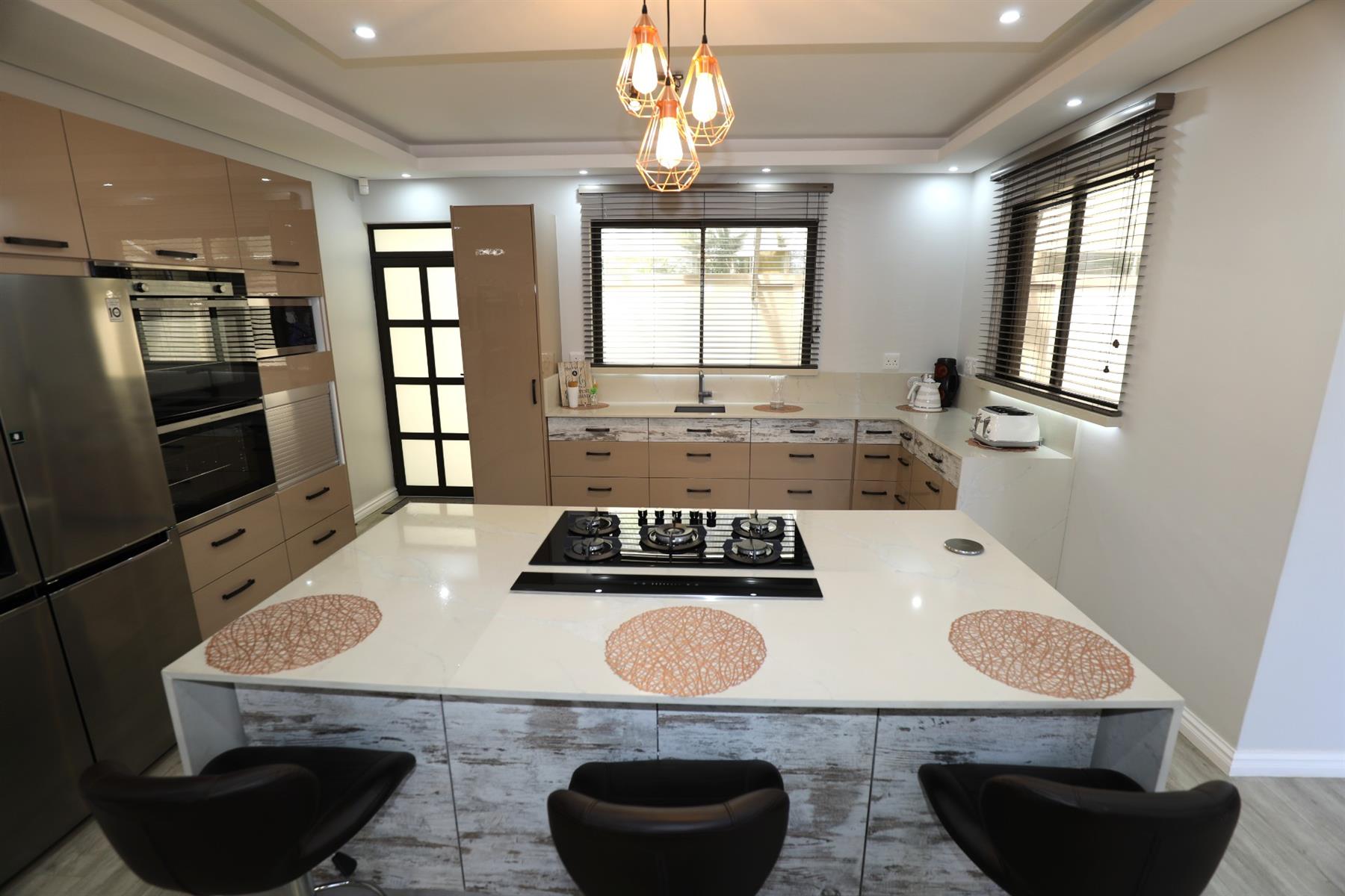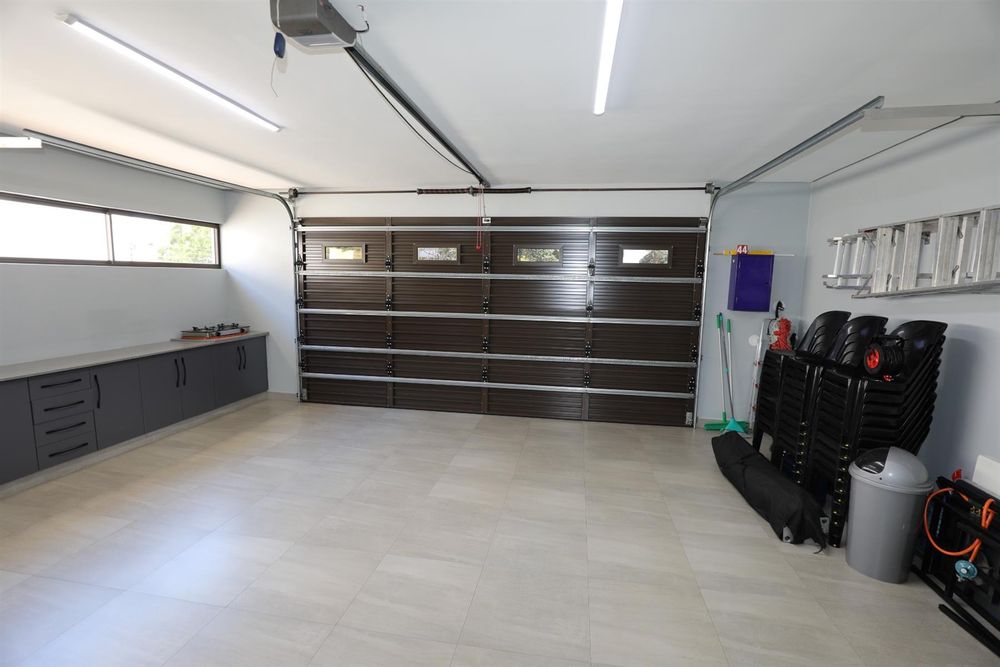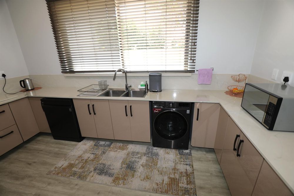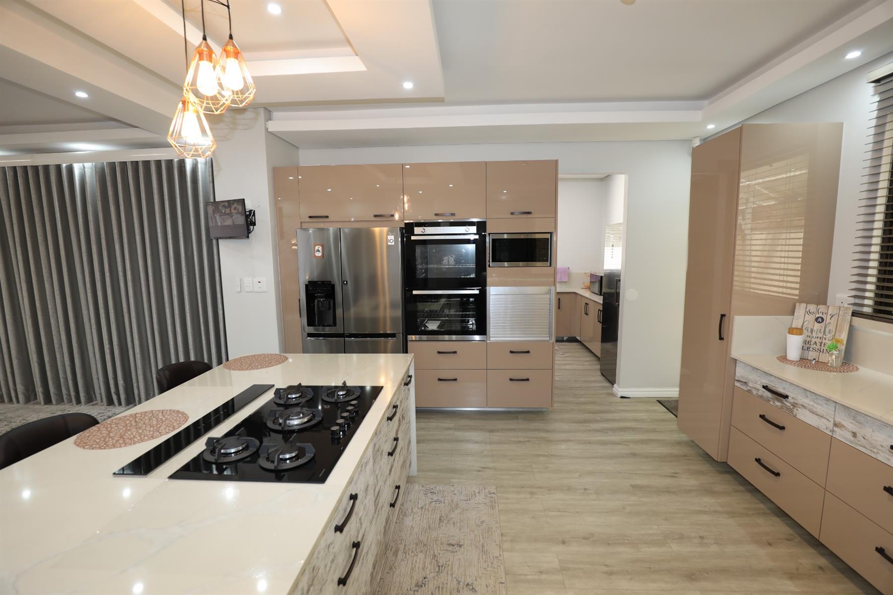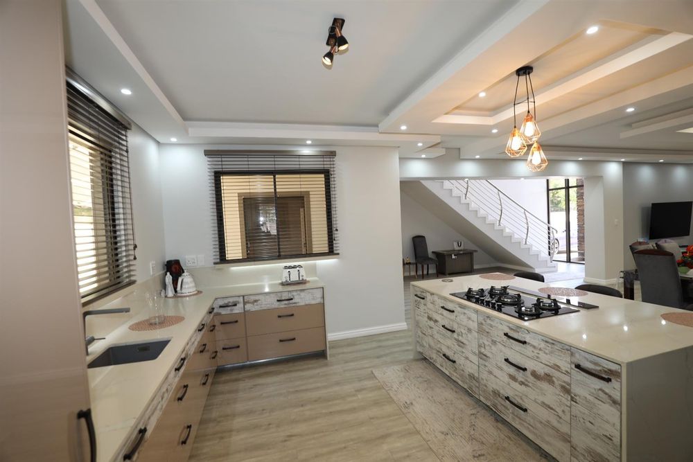 The heart of the home is an inviting open-plan kitchen, complete with modern appliances such as an oven and hob, along with a convenient scullery and a pantry for all your storage needs. The gourmet kitchen showcases custom cabinetry, complimented by high and Caesarstone countertops and sleek Niemann doors. The generously sized outdoor area is an entertainer`s dream, complete with a sparkling swimming pool, dual built-in braais and ample parking for guests.