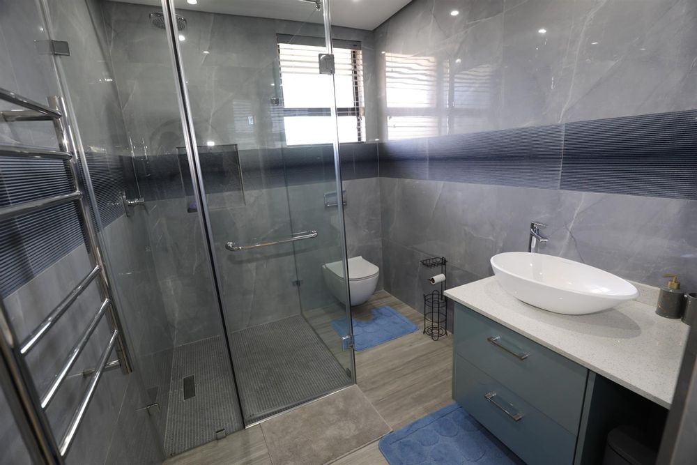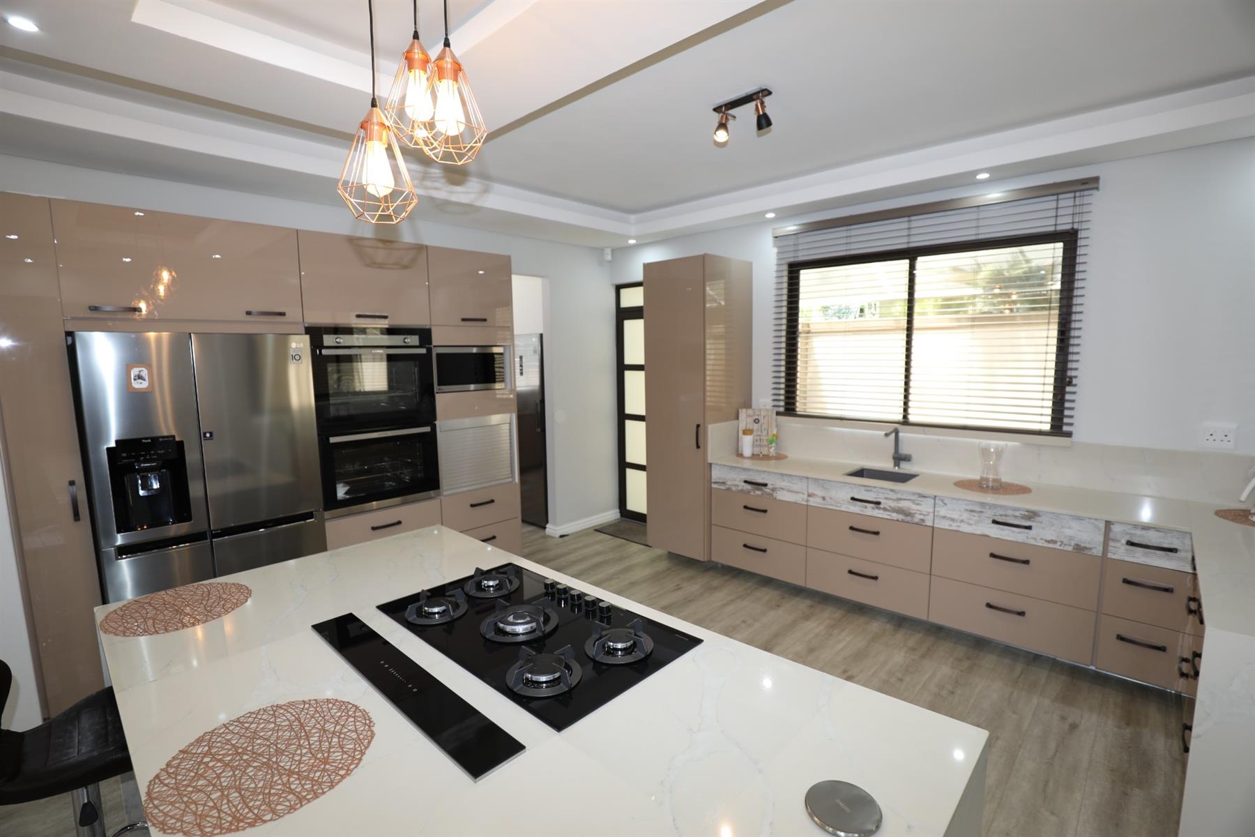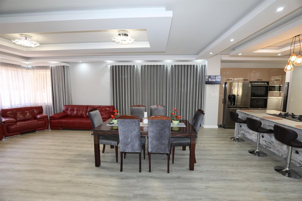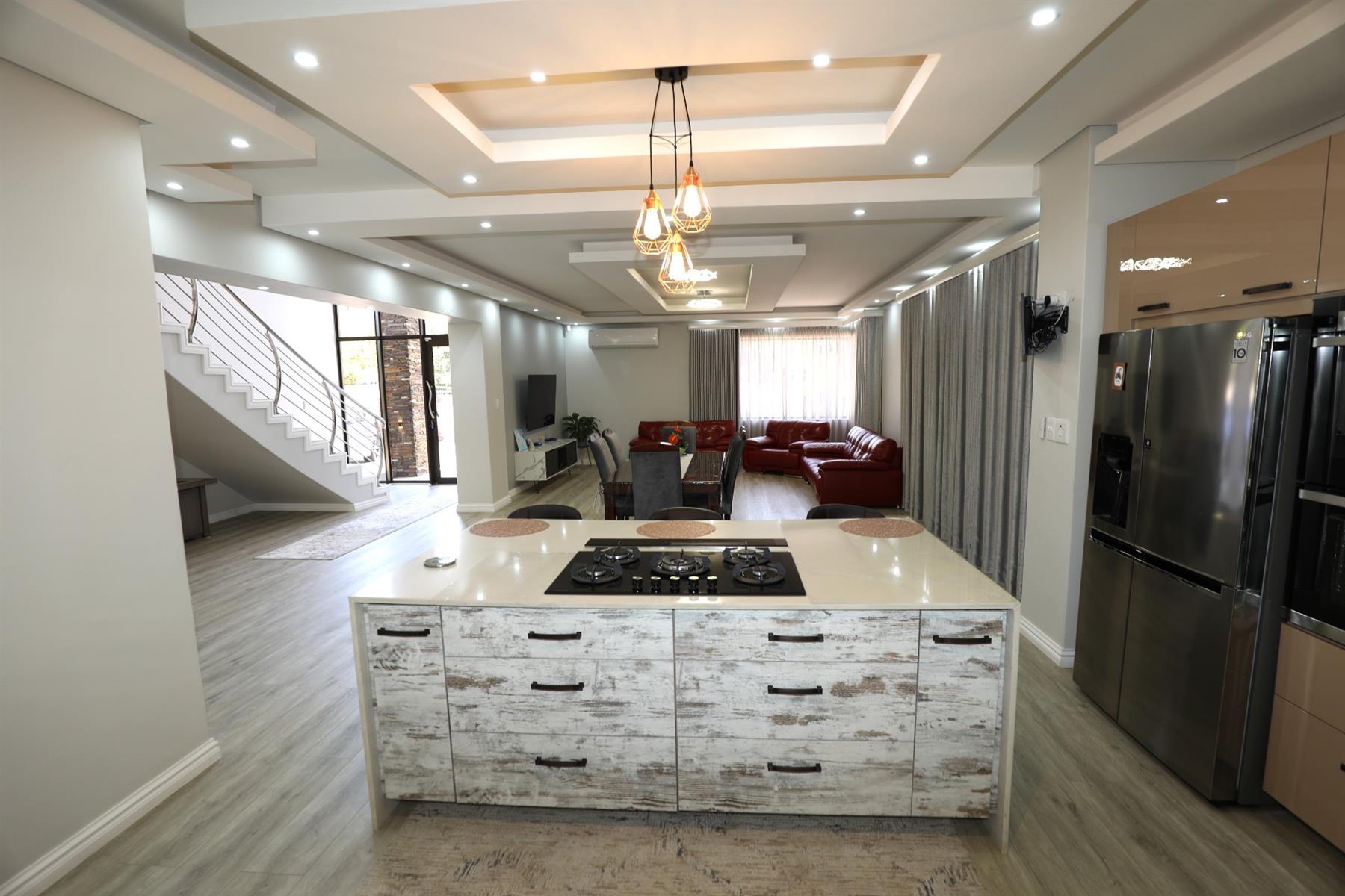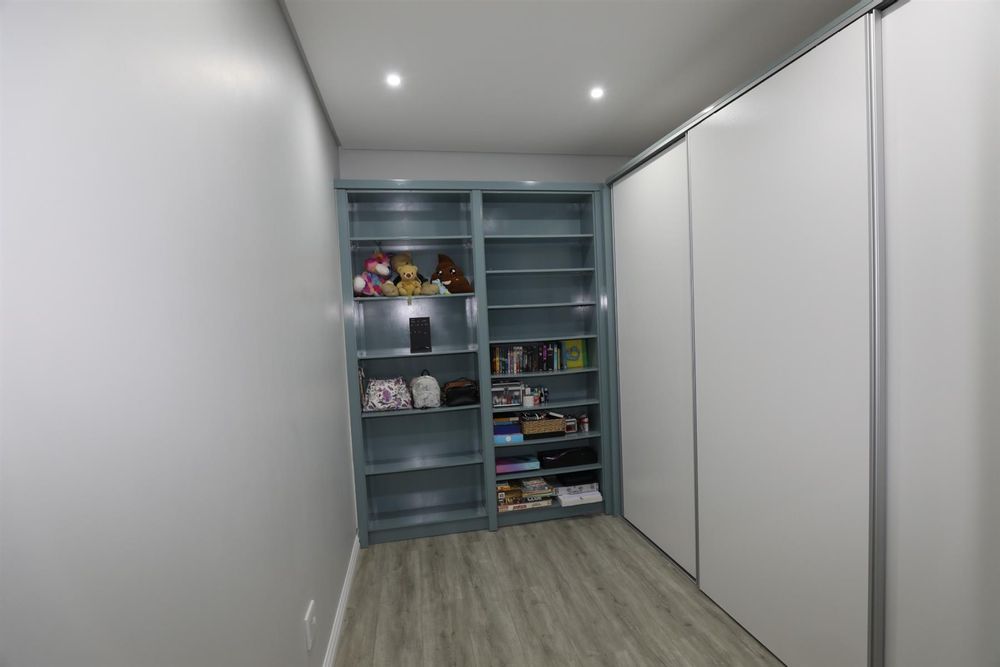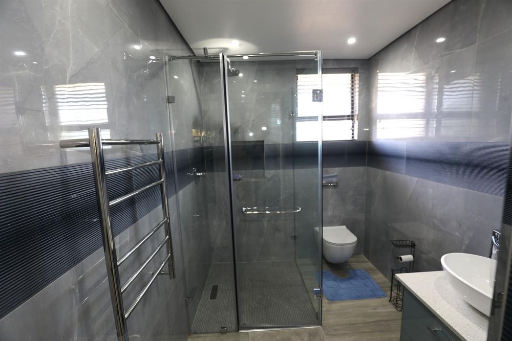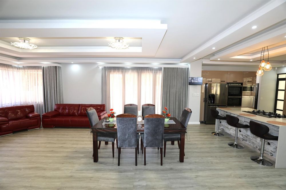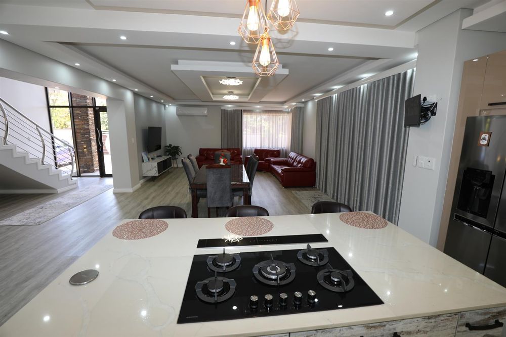 The heart of the home is an inviting open-plan kitchen, complete with modern appliances such as an oven and hob, along with a convenient scullery and a pantry for all your storage needs. The gourmet kitchen showcases custom cabinetry, complimented by high and Caesarstone countertops and sleek Niemann doors. The generously sized outdoor area is an entertainer`s dream, complete with a sparkling swimming pool, dual built-in braais and ample parking for guests.
