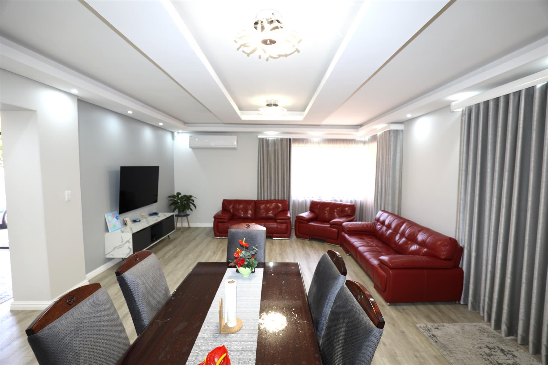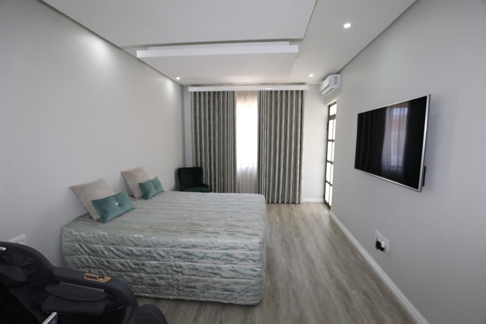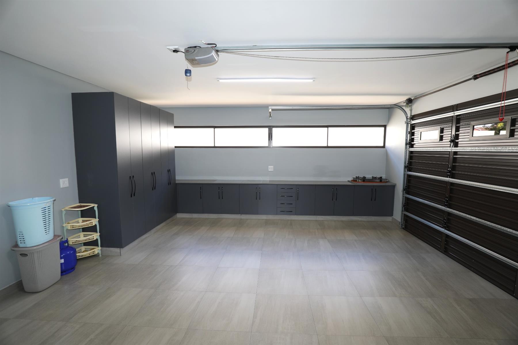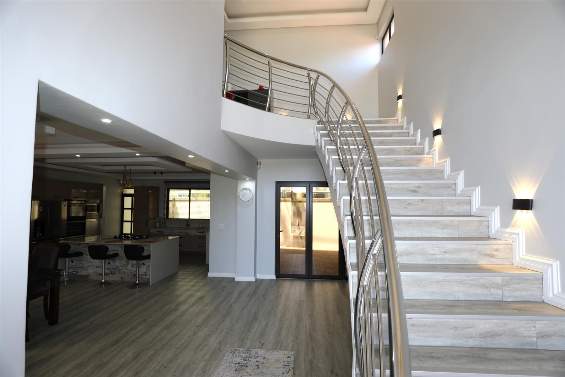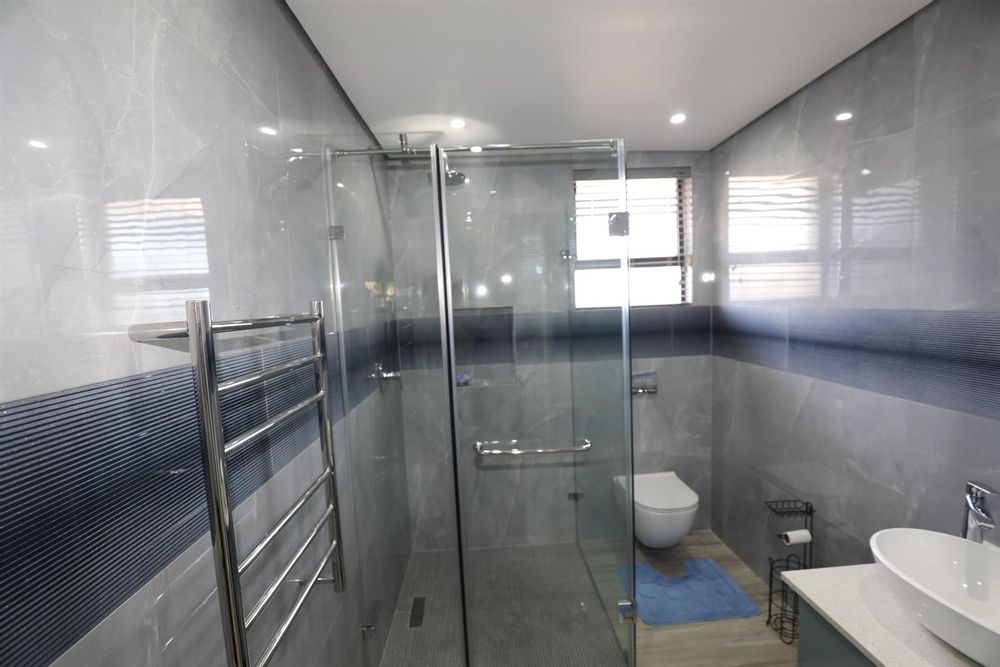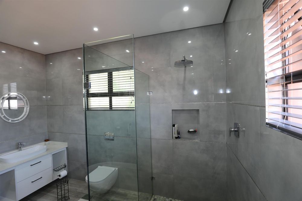 The heart of the home is an inviting open-plan kitchen, complete with modern appliances such as an oven and hob, along with a convenient scullery and a pantry for all your storage needs. The gourmet kitchen showcases custom cabinetry, complimented by high and Caesarstone countertops and sleek Niemann doors. The generously sized outdoor area is an entertainer`s dream, complete with a sparkling swimming pool, dual built-in braais and ample parking for guests.