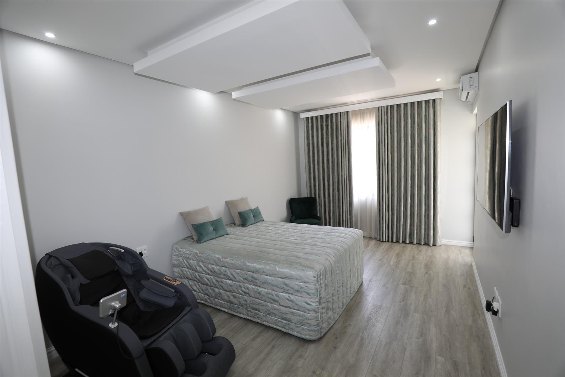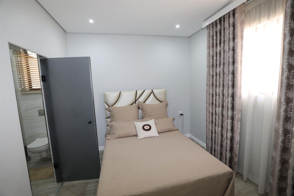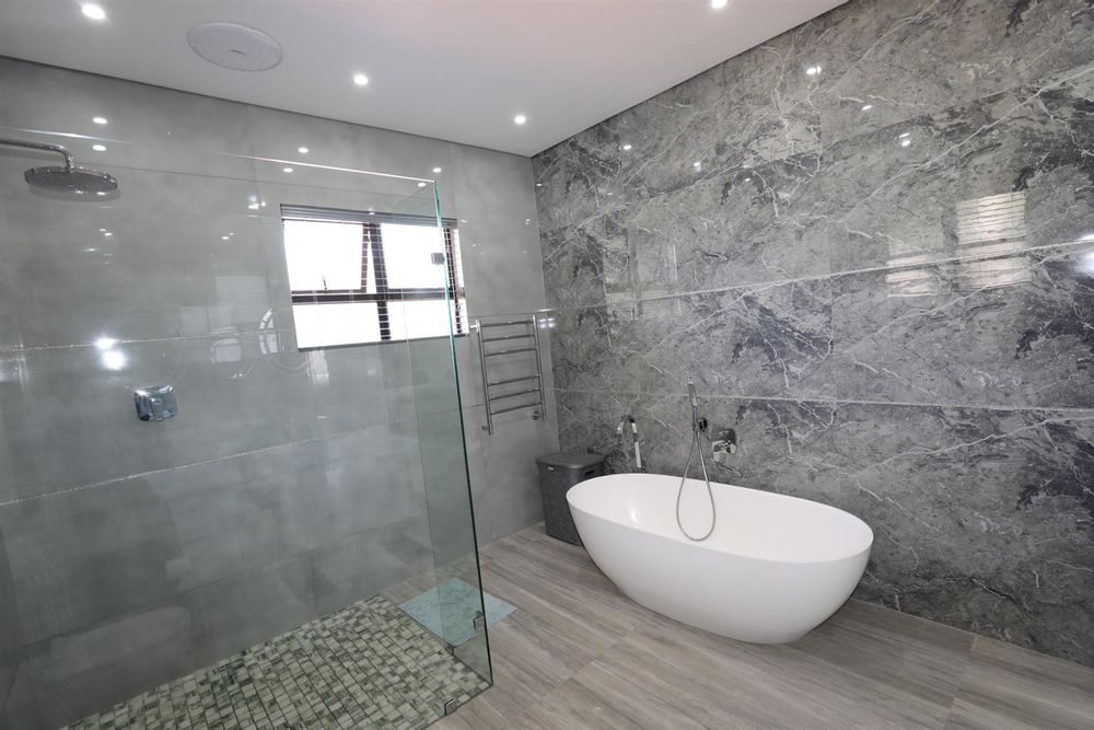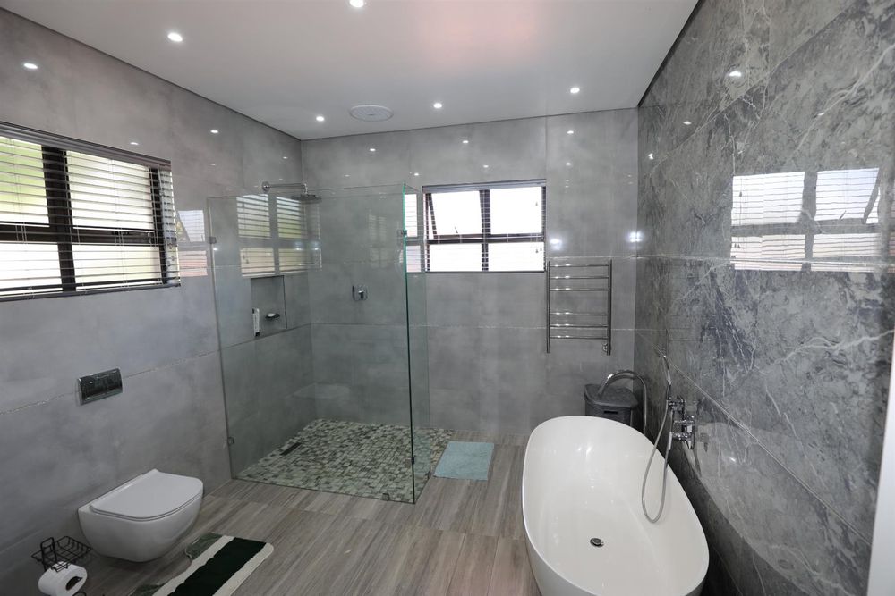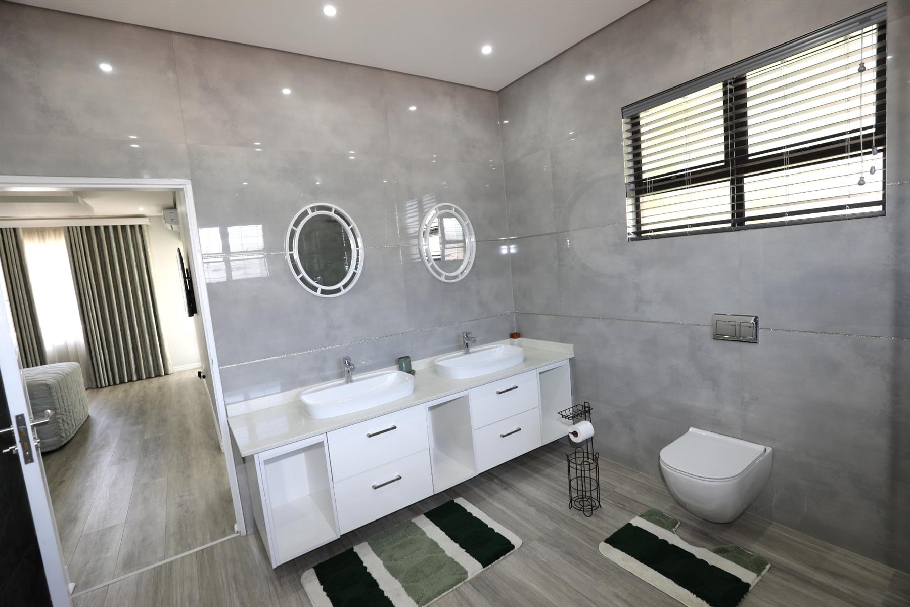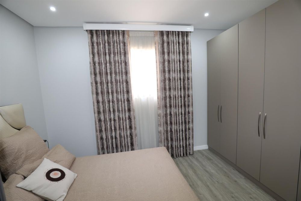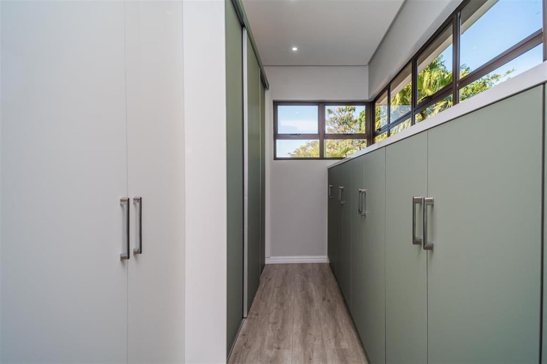 The heart of the home is an inviting open-plan kitchen, complete with modern appliances such as an oven and hob, along with a convenient scullery and a pantry for all your storage needs. The gourmet kitchen showcases custom cabinetry, complimented by high and Caesarstone countertops and sleek Niemann doors. The generously sized outdoor area is an entertainer`s dream, complete with a sparkling swimming pool, dual built-in braais and ample parking for guests.