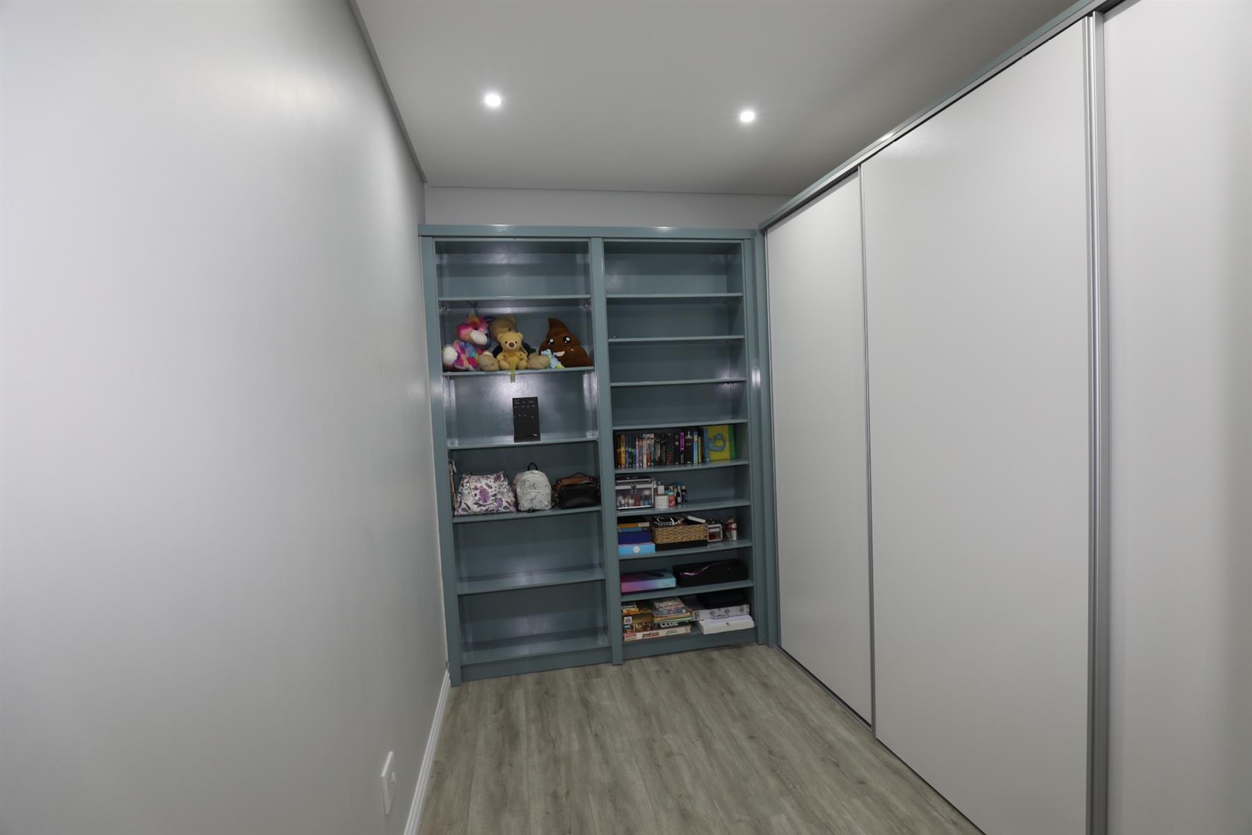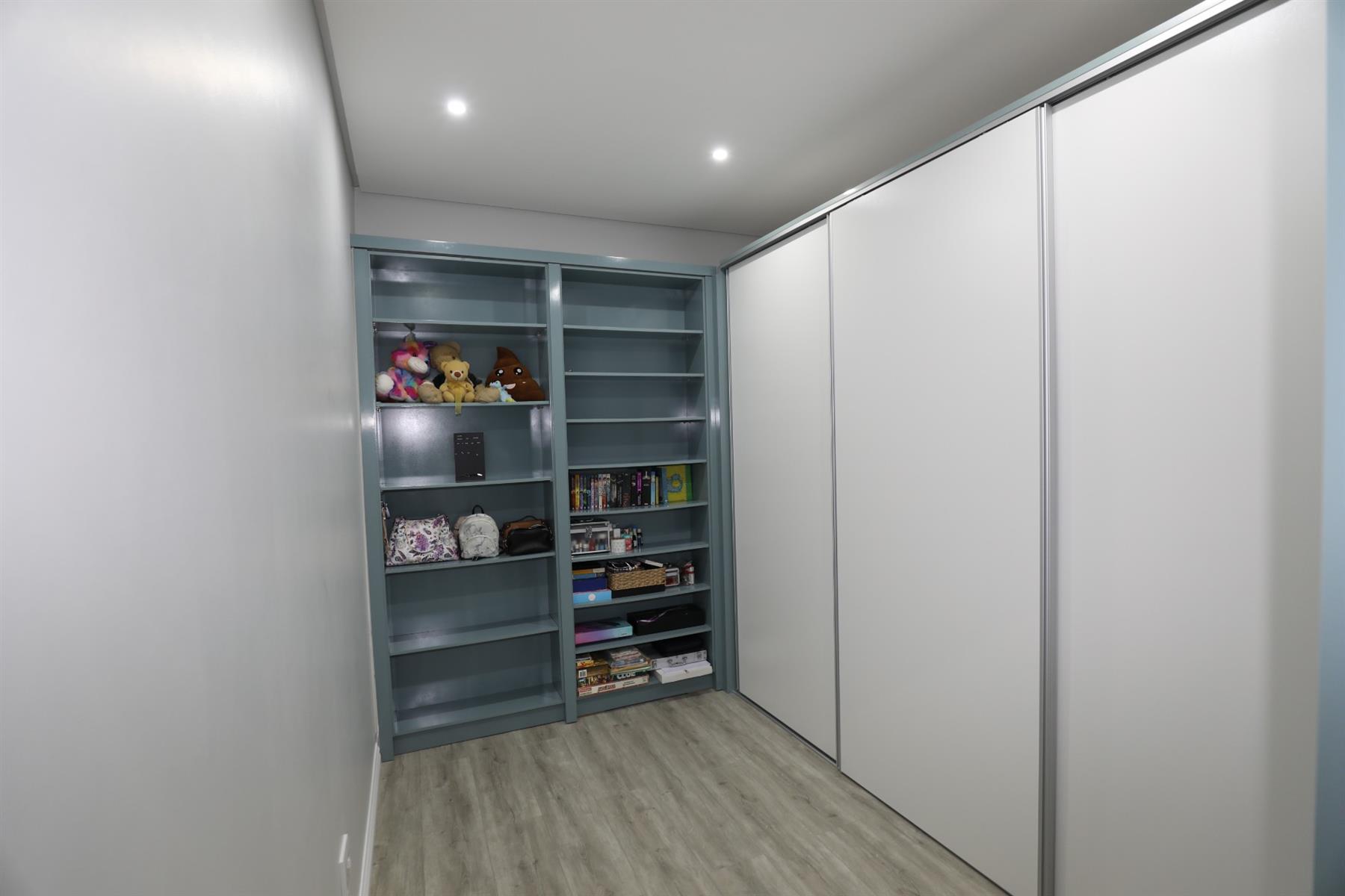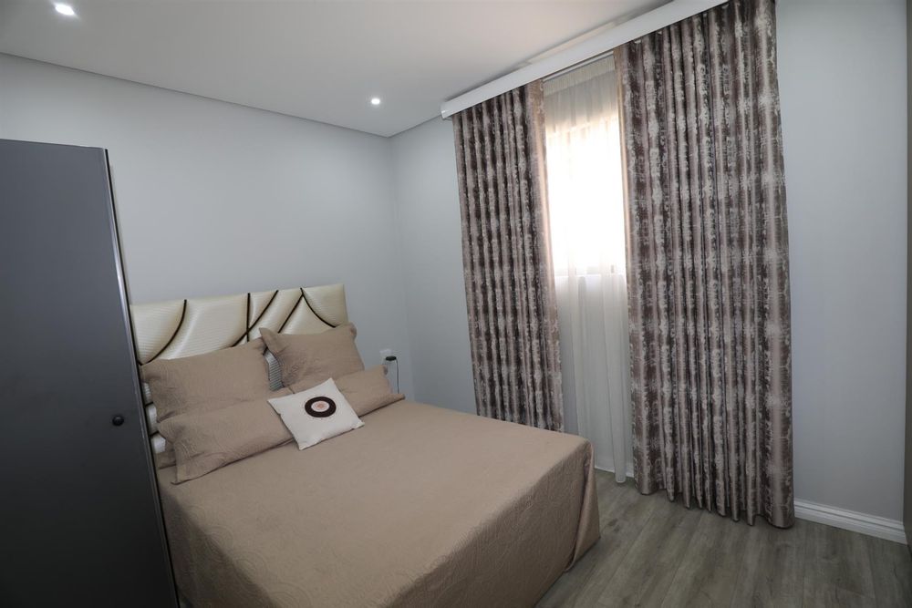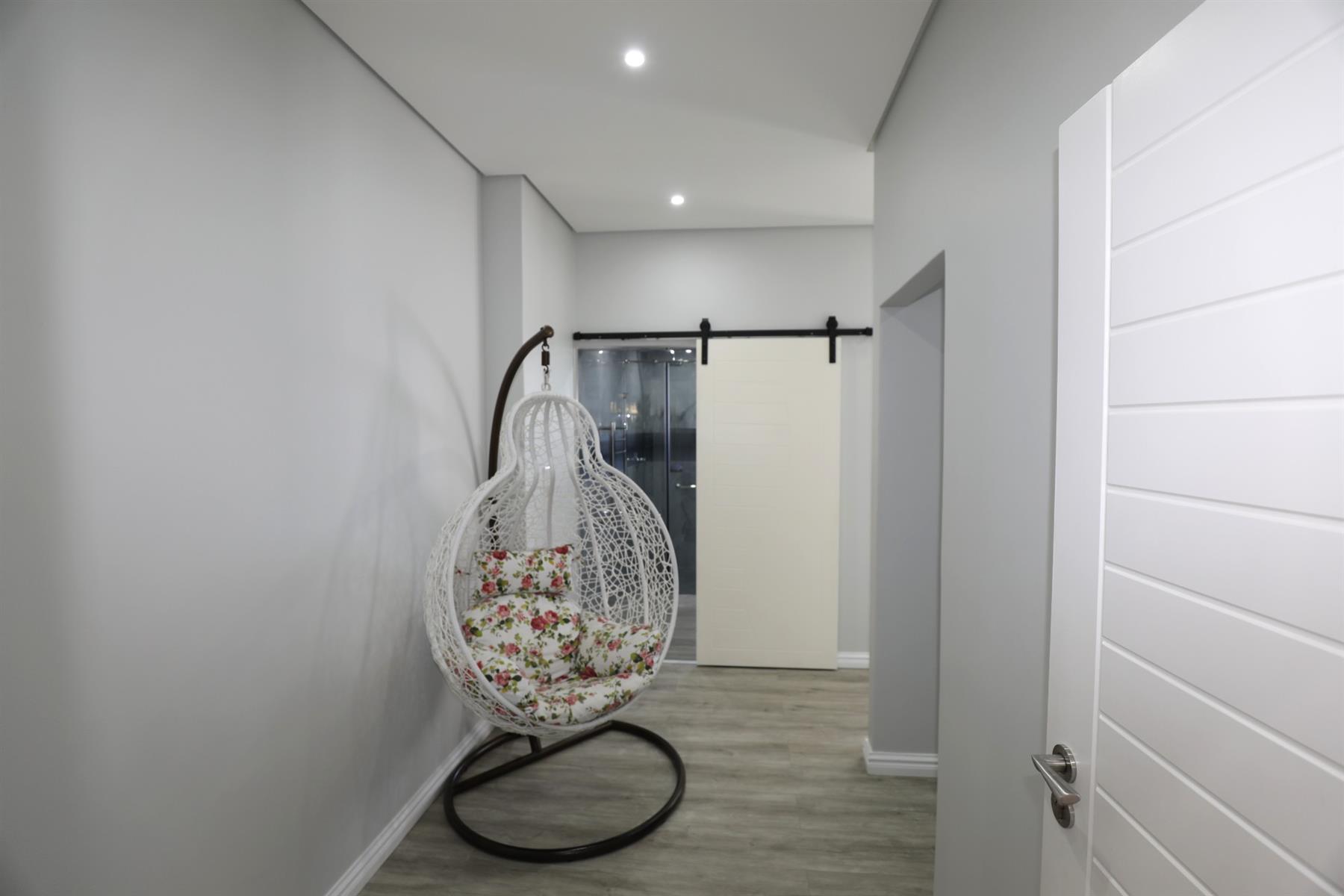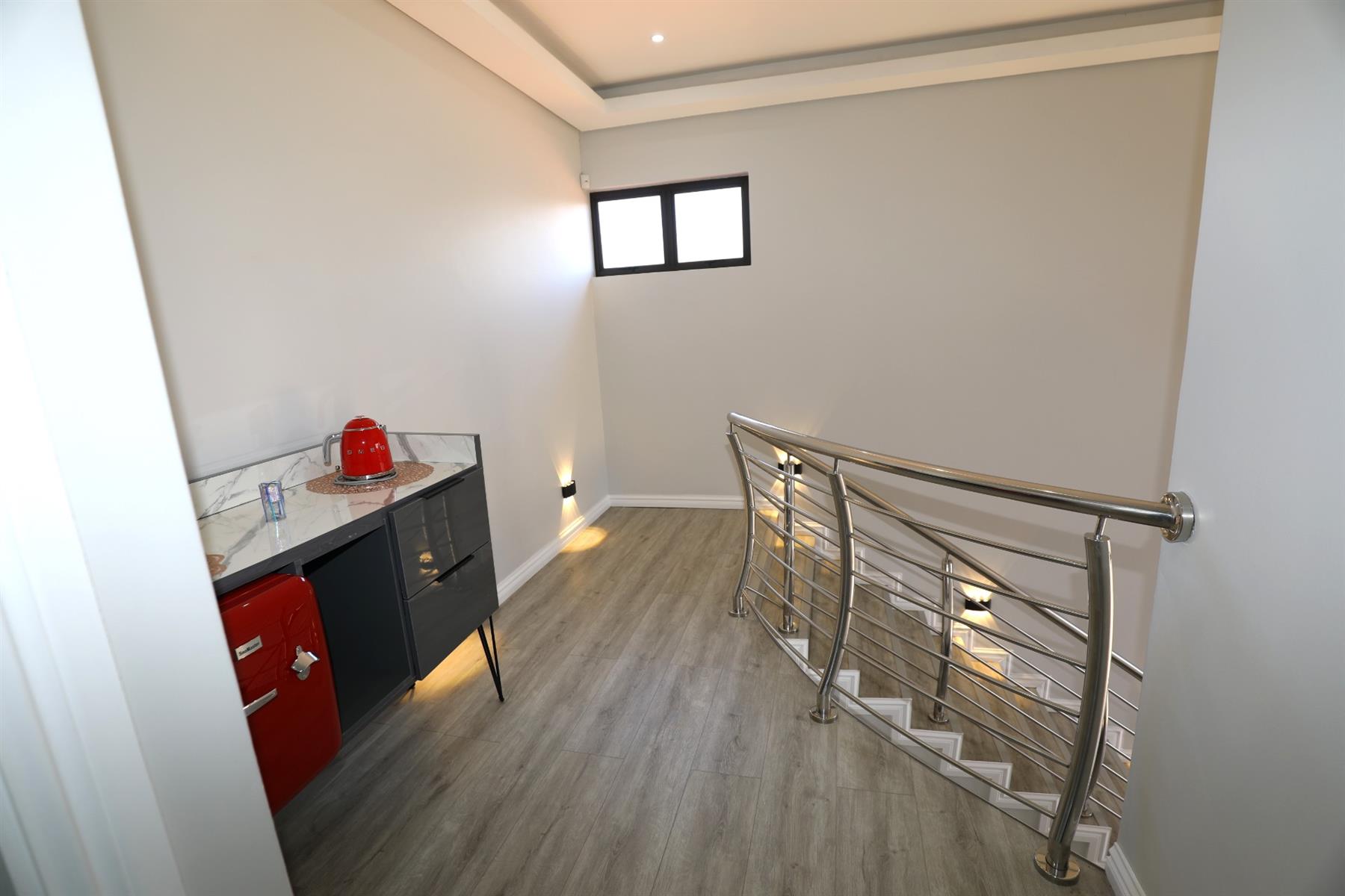 The heart of the home is an inviting open-plan kitchen, complete with modern appliances such as an oven and hob, along with a convenient scullery and a pantry for all your storage needs. The gourmet kitchen showcases custom cabinetry, complimented by high and Caesarstone countertops and sleek Niemann doors. The generously sized outdoor area is an entertainer`s dream, complete with a sparkling swimming pool, dual built-in braais and ample parking for guests.