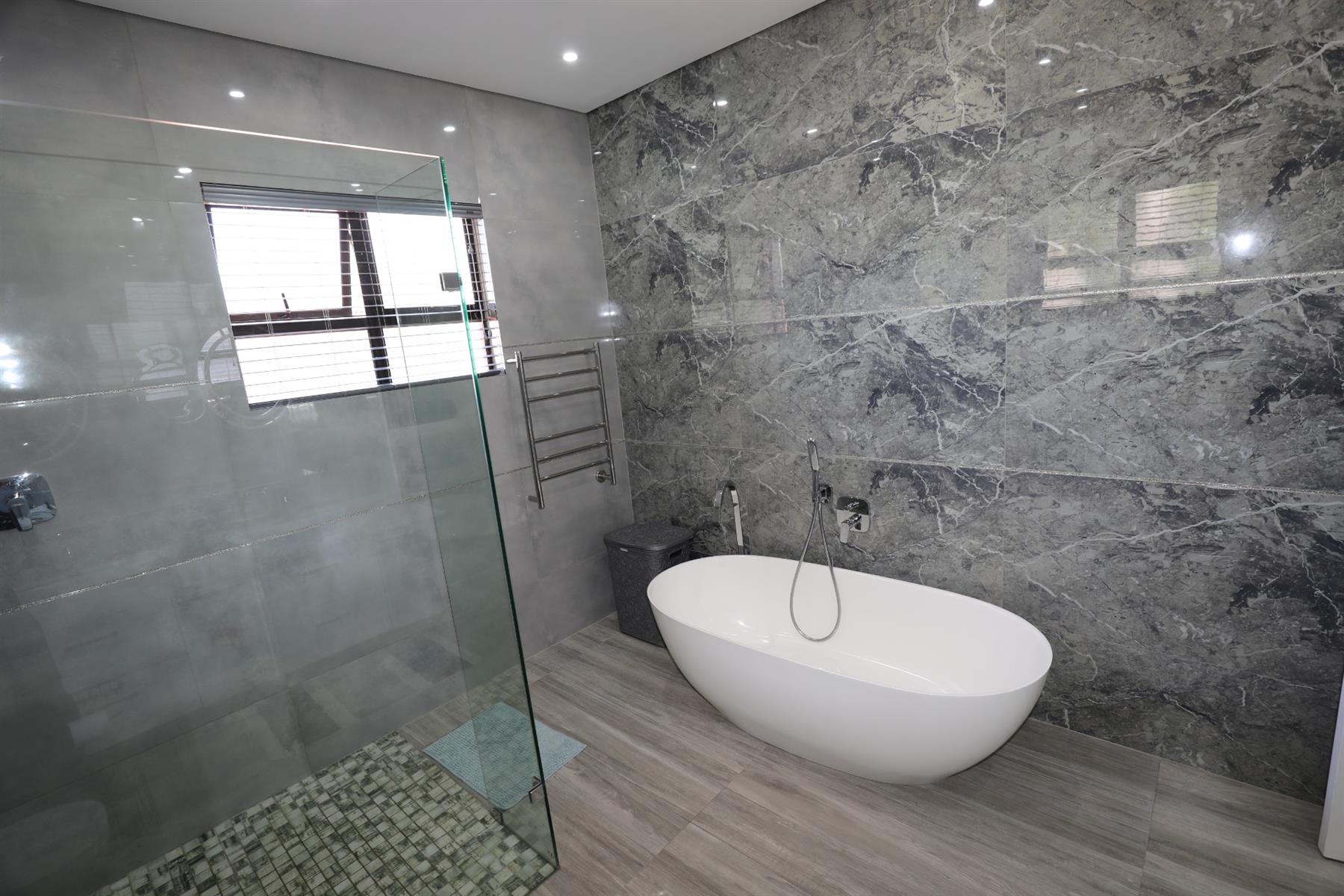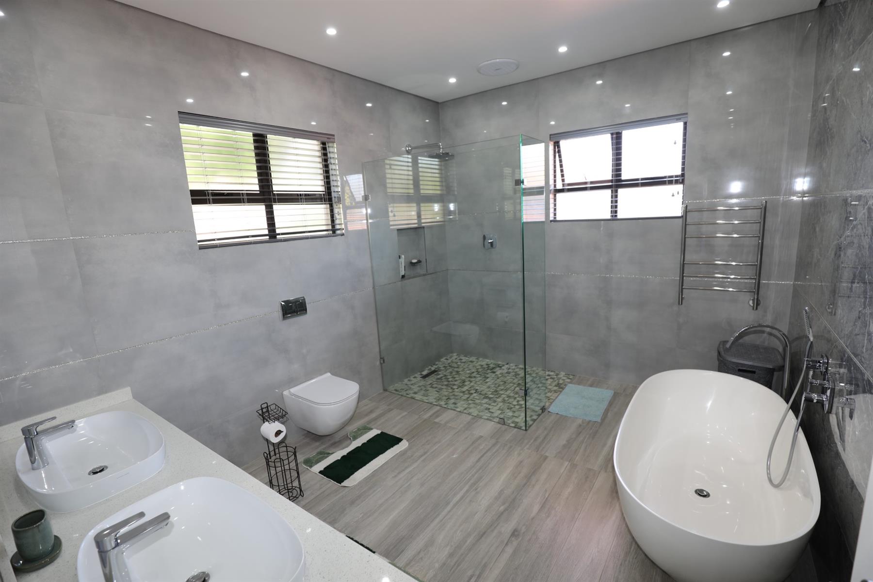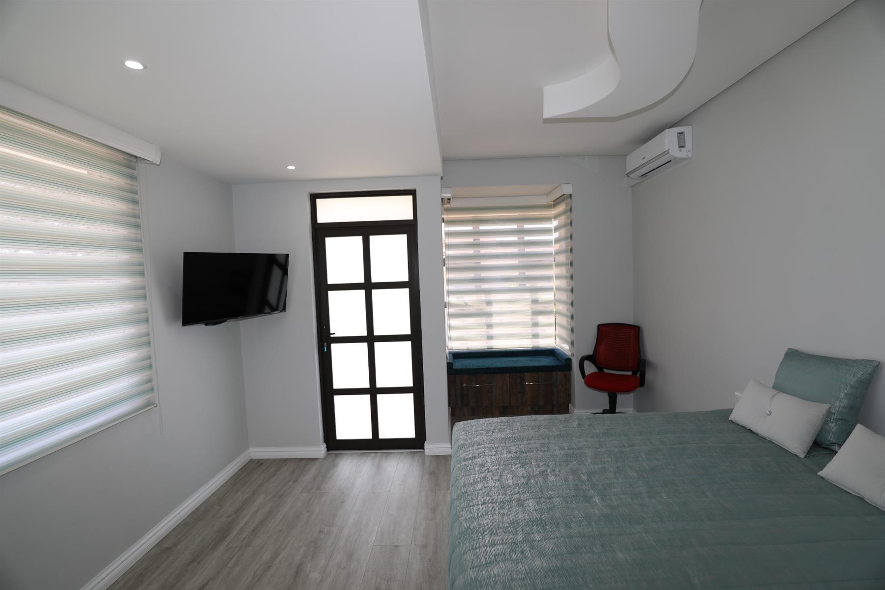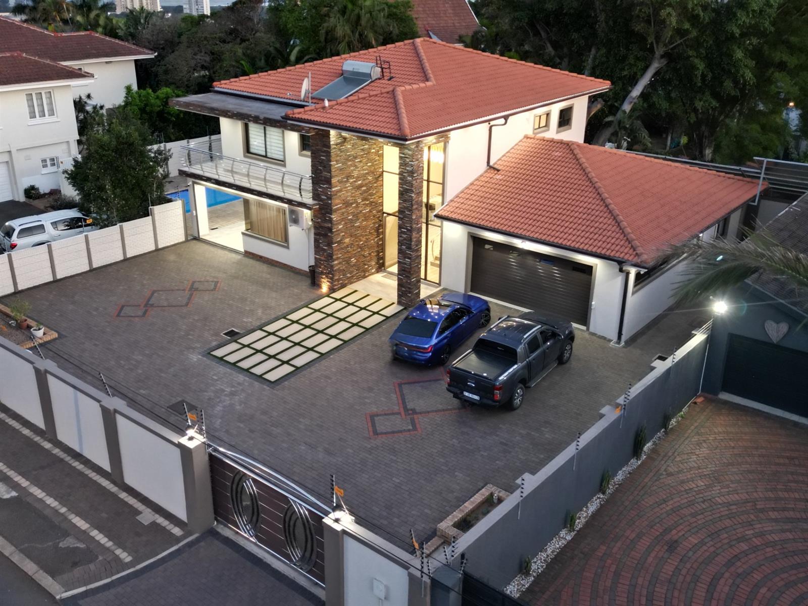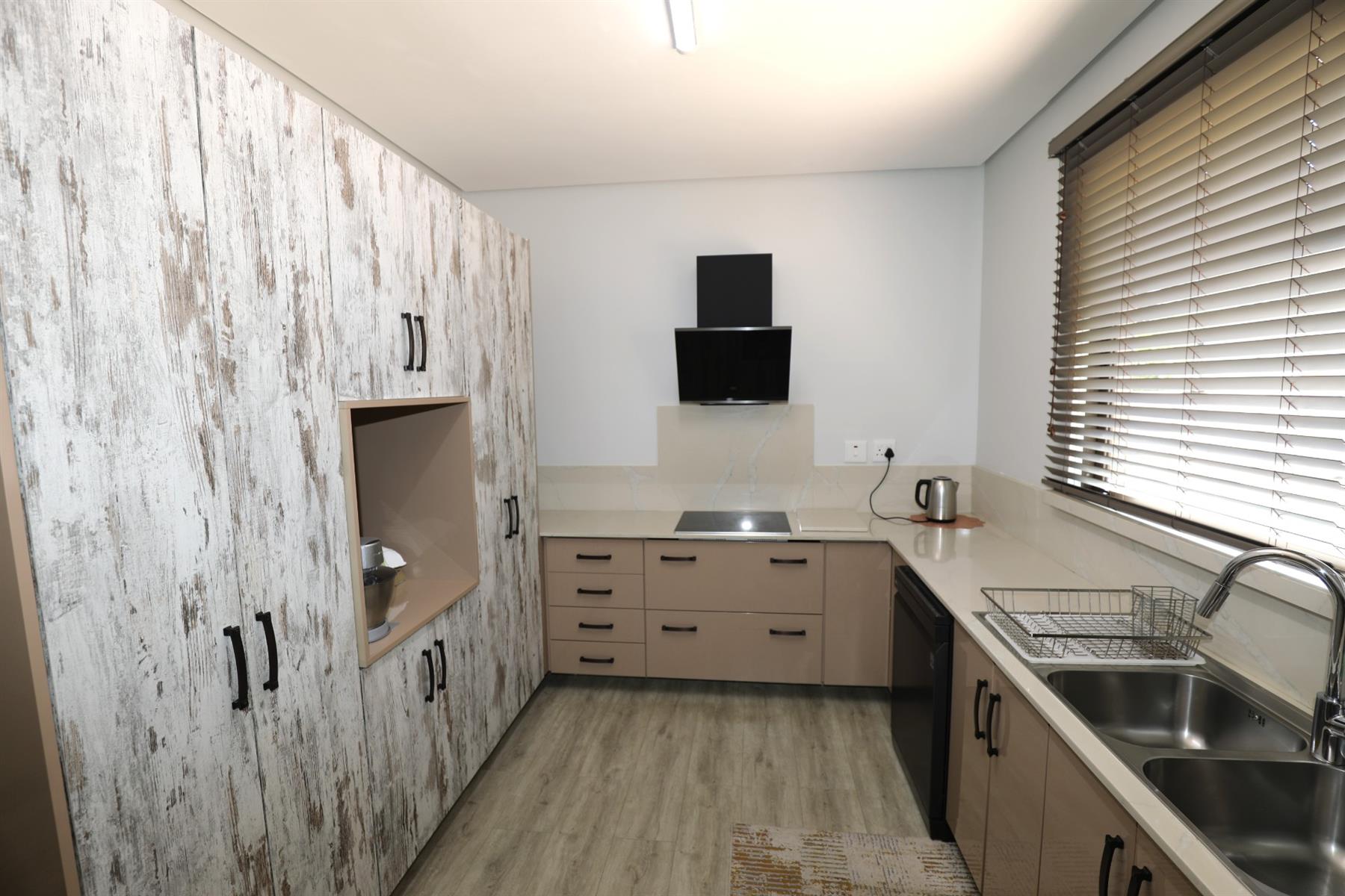 The heart of the home is an inviting open-plan kitchen, complete with modern appliances such as an oven and hob, along with a convenient scullery and a pantry for all your storage needs. The gourmet kitchen showcases custom cabinetry, complimented by high and Caesarstone countertops and sleek Niemann doors. The generously sized outdoor area is an entertainer`s dream, complete with a sparkling swimming pool, dual built-in braais and ample parking for guests.