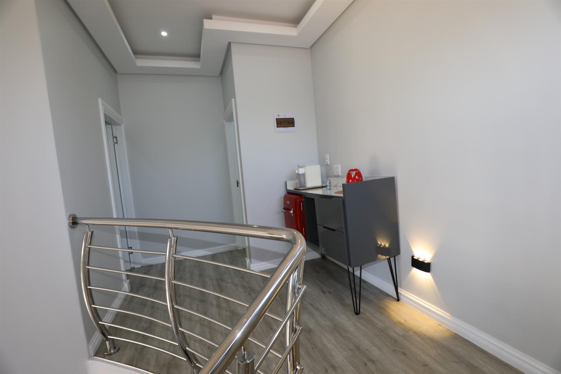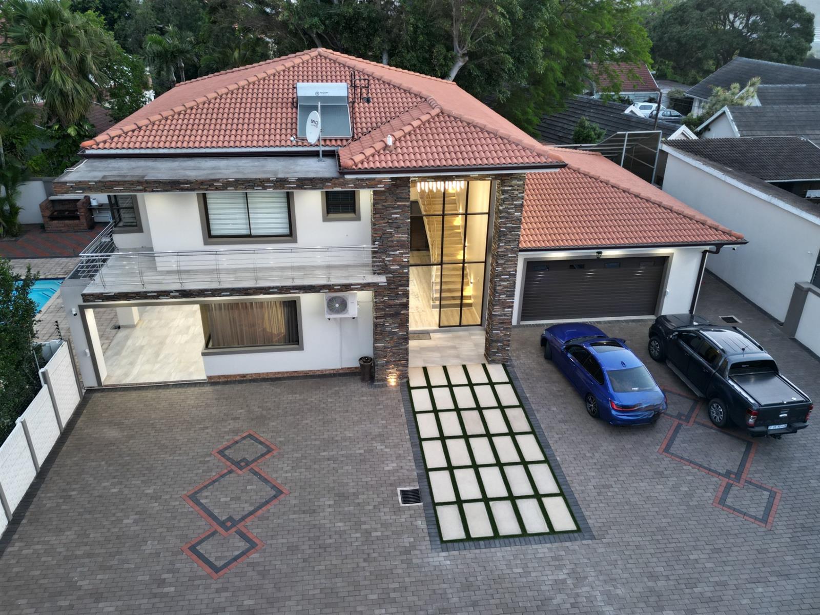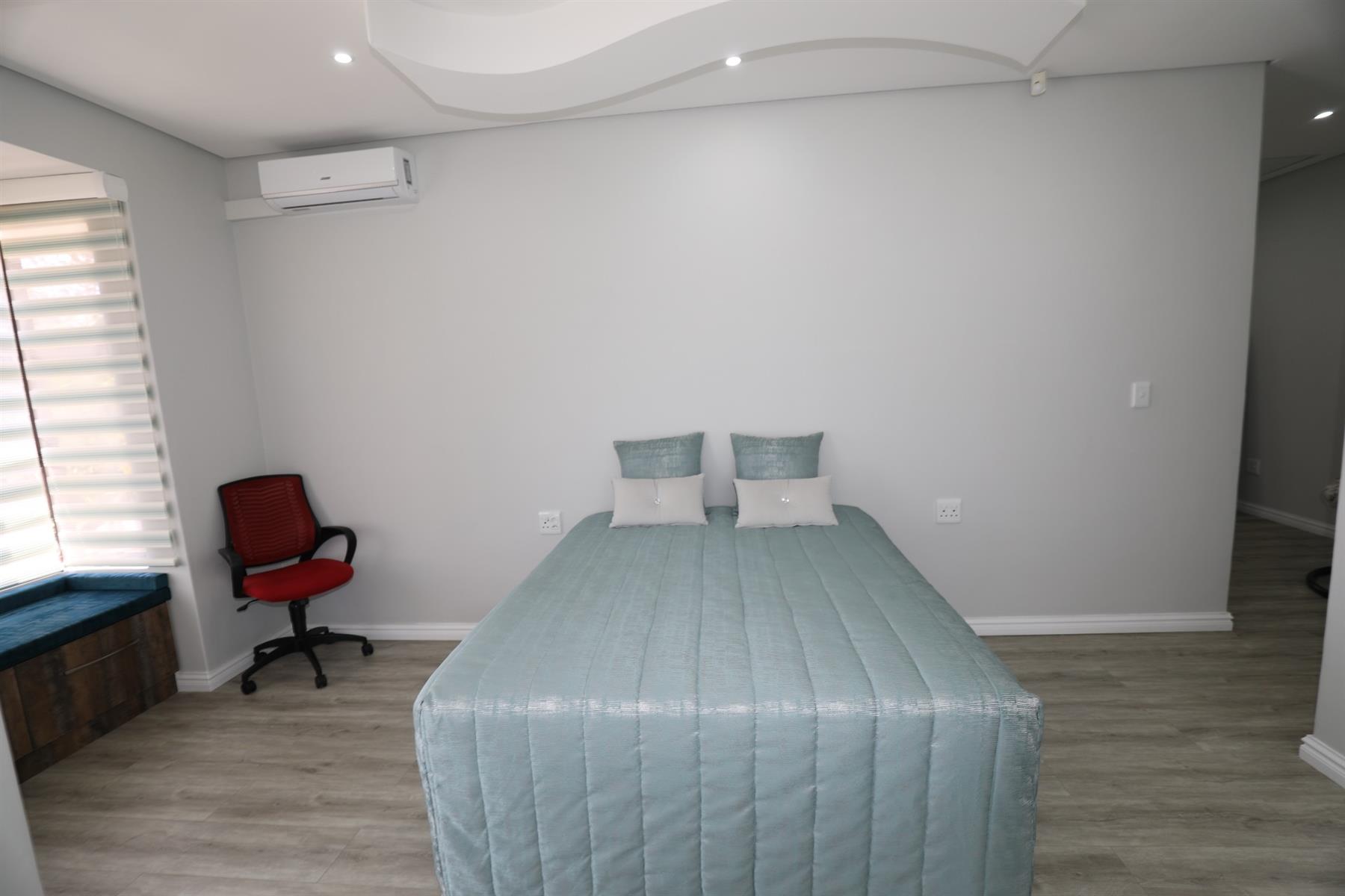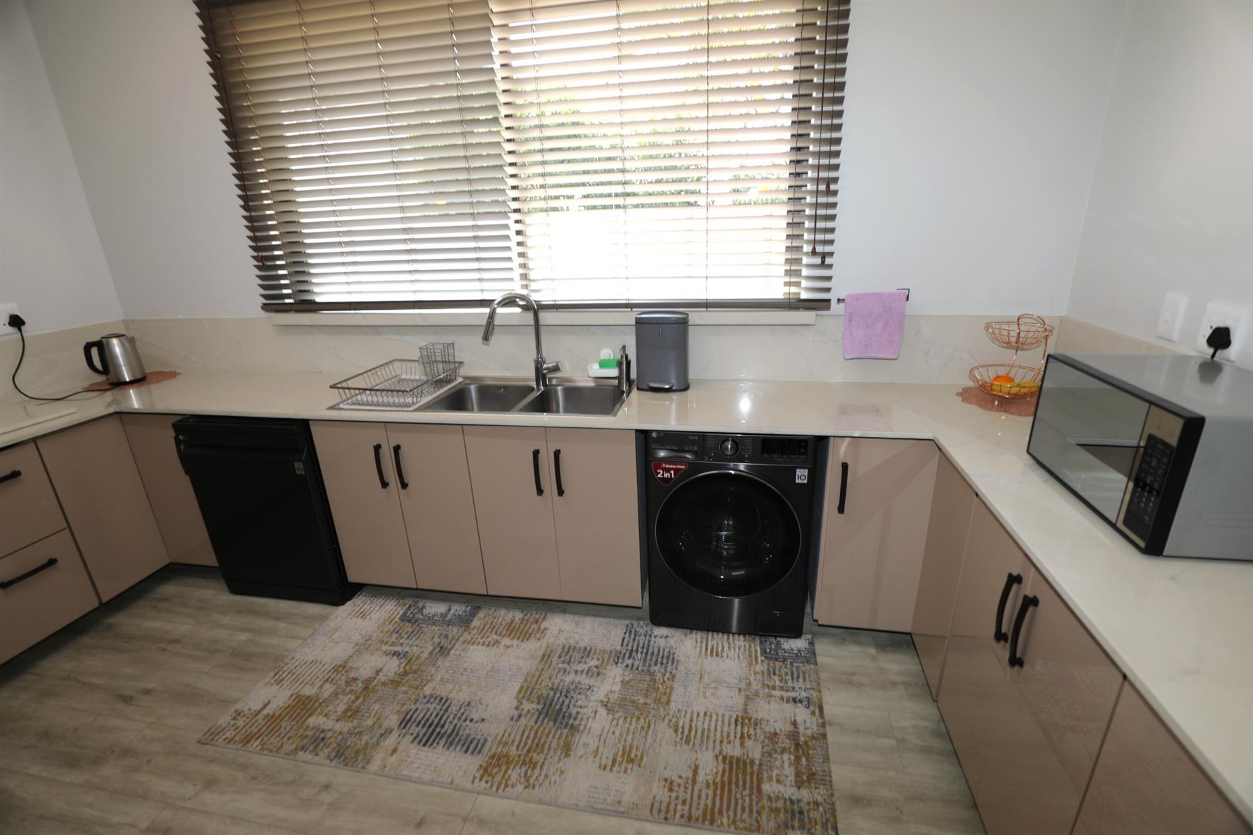 This prestigious property comes fully outfitted with premium appliances such as a refrigerator, washing machine, dishwasher and microwave. Additional features include energy-efficient solar geysers, a water saving jojo tank, air conditioning and stylish bespoke tea/coffee stations. The dining room and lounge flow effortlessly from the kitchen, creating a perfect setting for entertaining or family gatherings. Sliding doors lead to a charming veranda that overlooks the splash pool, making outdoor living a breeze.